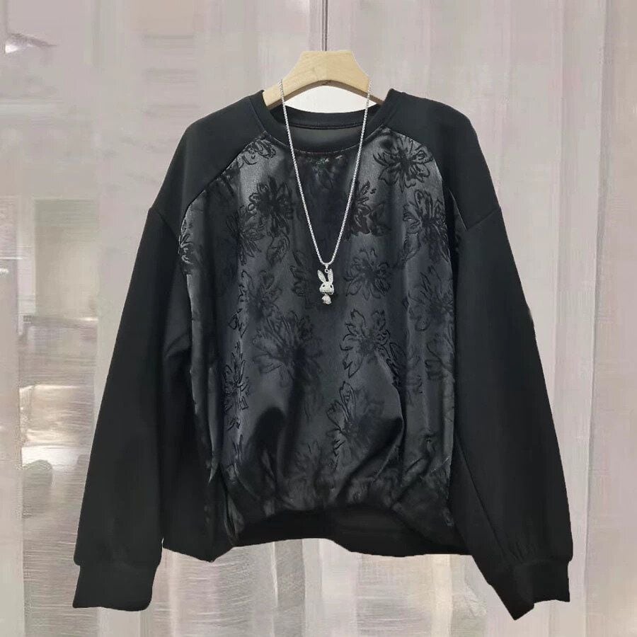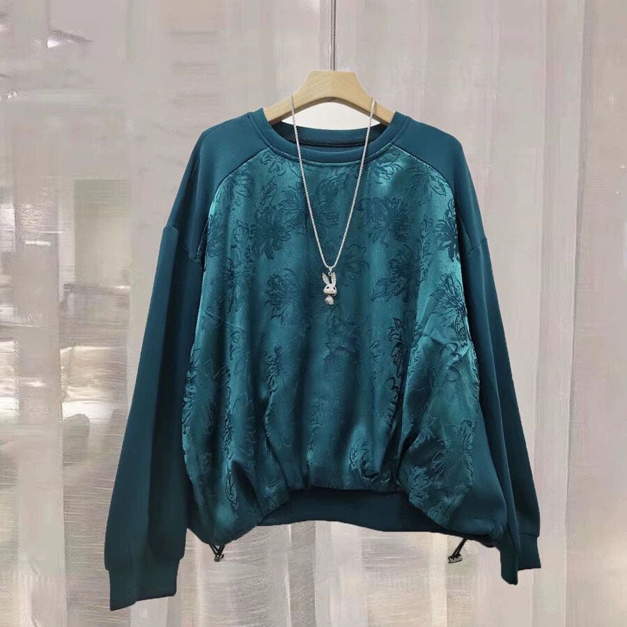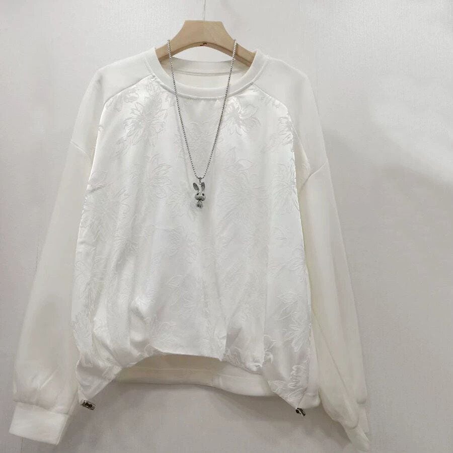 さりげないフラワープリントの同色スティッチデザインがお洒落な、ラウンドネック・長袖・ドローコードヘムのスウェットシャツです。ドローコートで作るランタンのようなフロントのシルエットが魅力的な、何にでも合わせやすく着心地の良いカジュアルアイテムです。