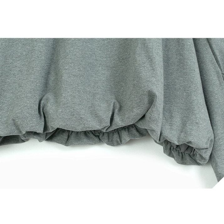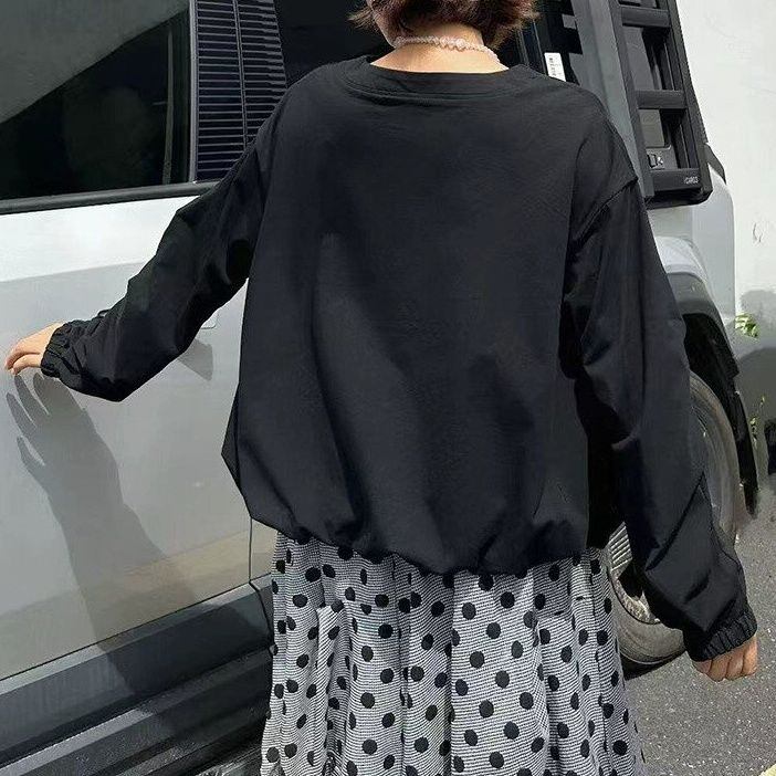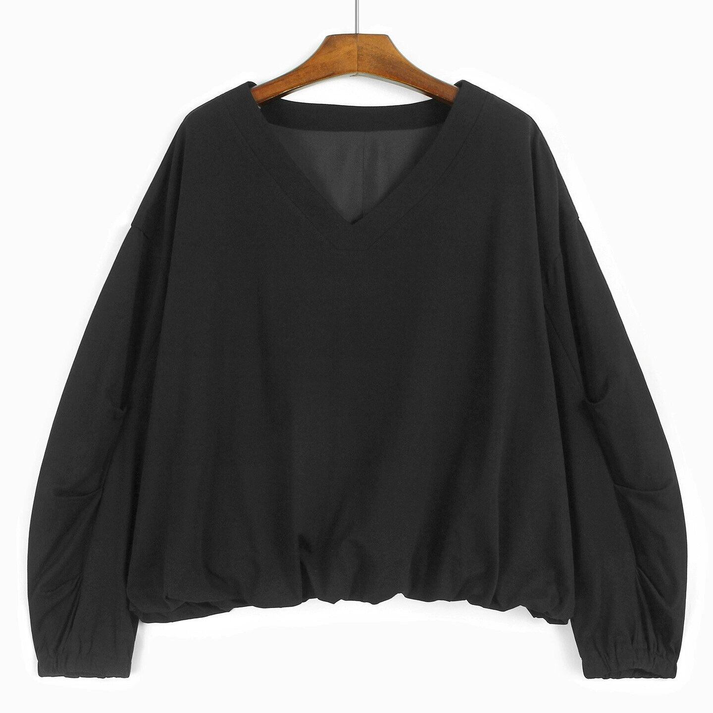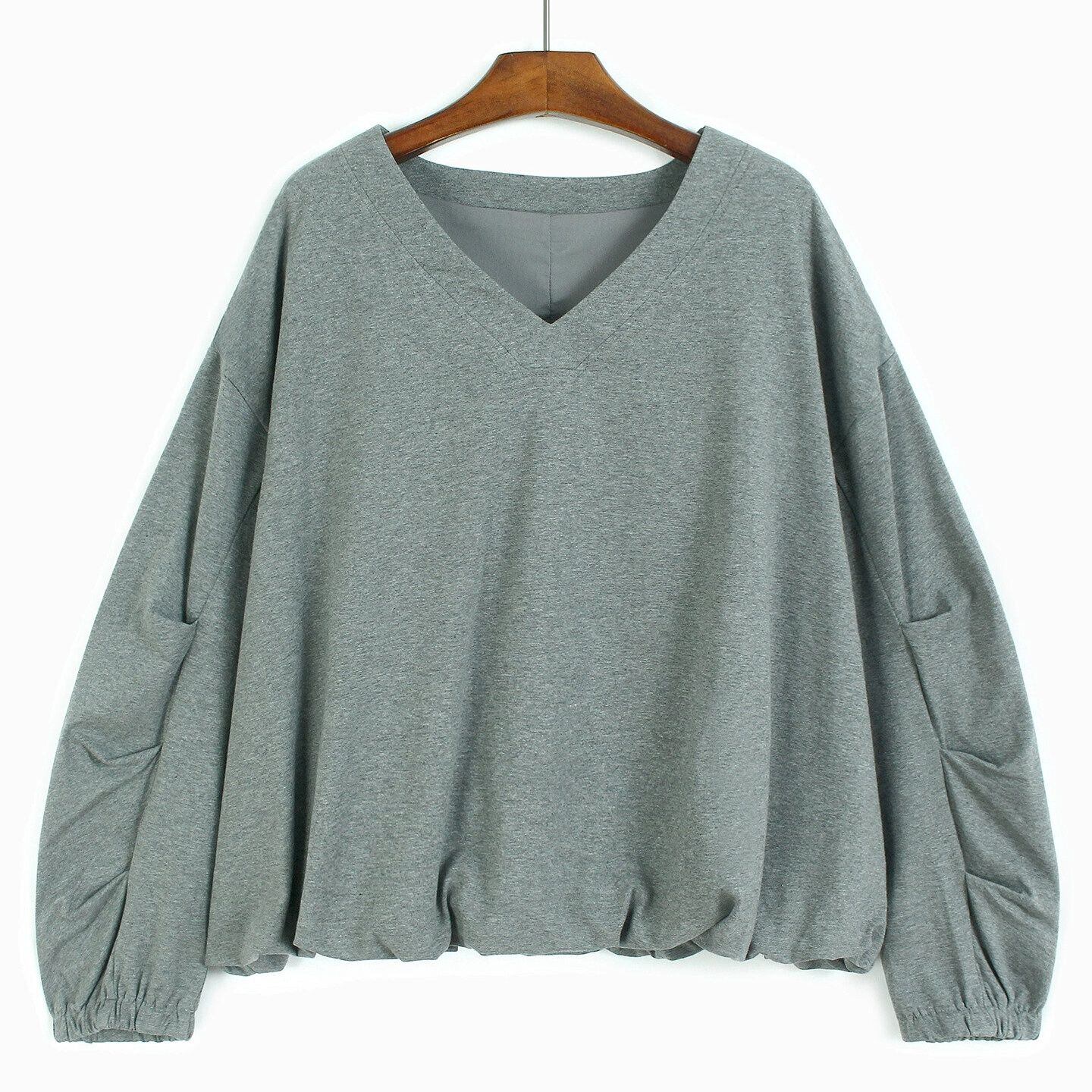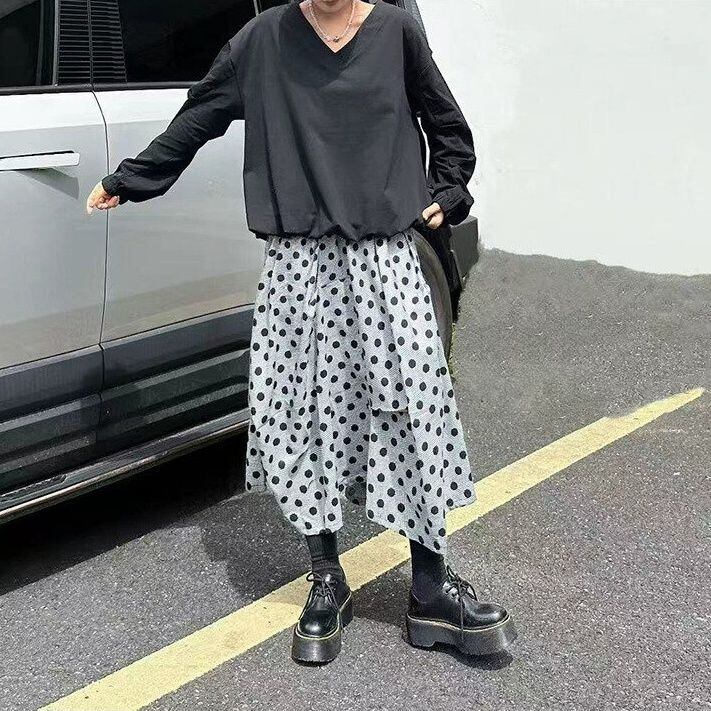 ランタンのような袖や裾のシルエットがお洒落な、Vネック・長袖・ショート丈のプルオーバーシャツと、ドット柄のミドルスカートです。トップスは単色のシンプルなデザインで、何にでも合わせやすいです。スカートはランダムなプリーツが作る、いびつなシルエットが魅力的です。
