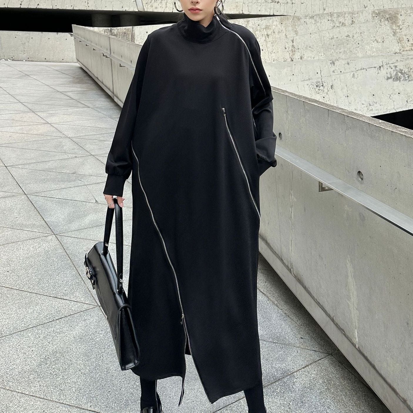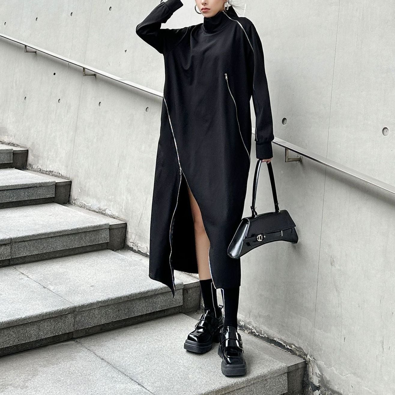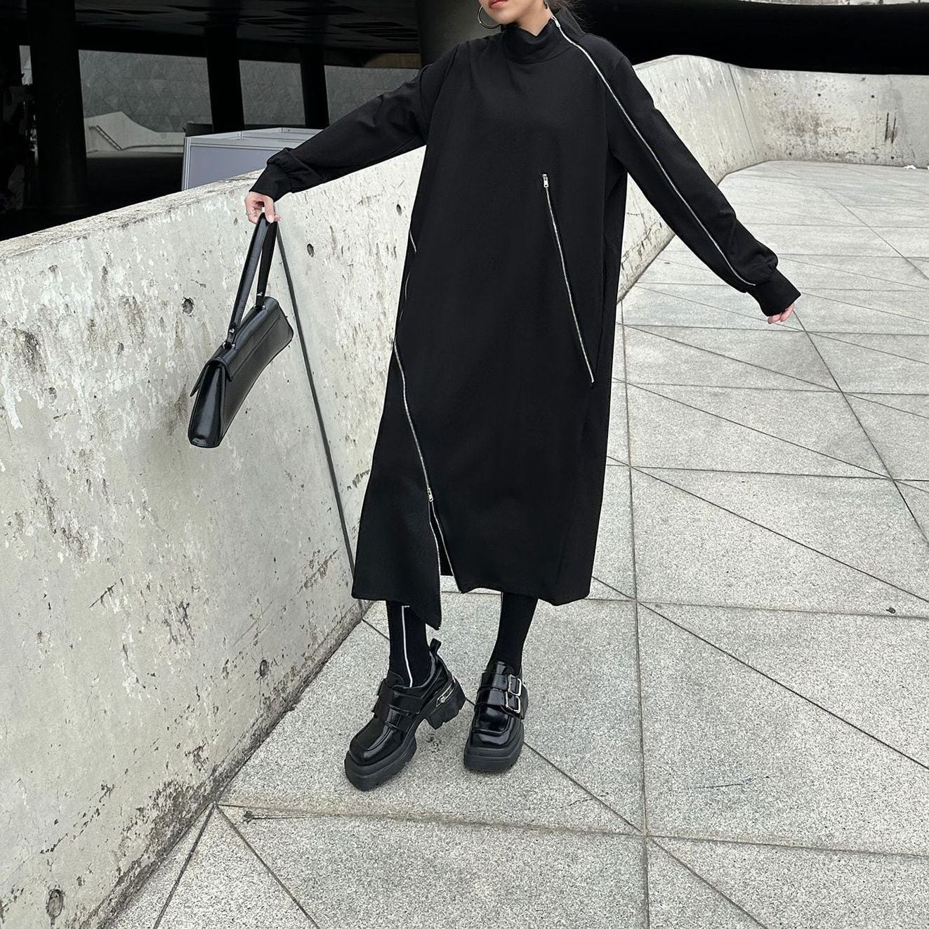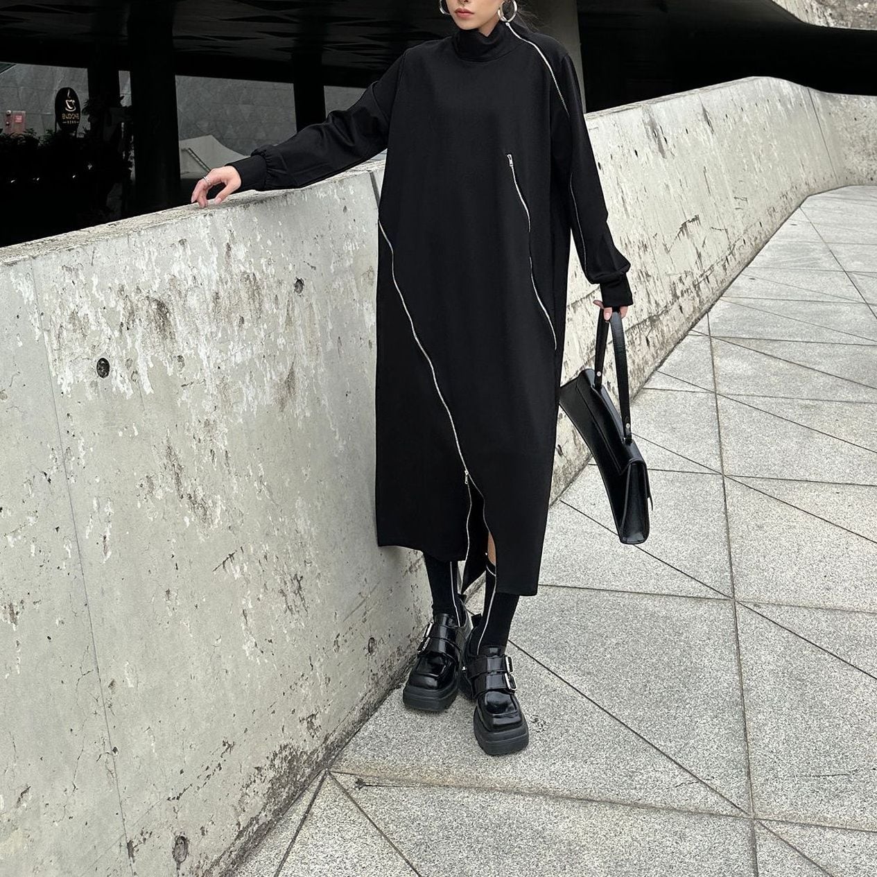 ブラック地に斜めの3本のジップラインがクールな、ハイネック・長袖・ロング丈のプルオーバー・デザインワンピースです。ゆったりとしたストレートのシルエットで、小物や差し色アレンジが利くカジュアルなアイテムです。