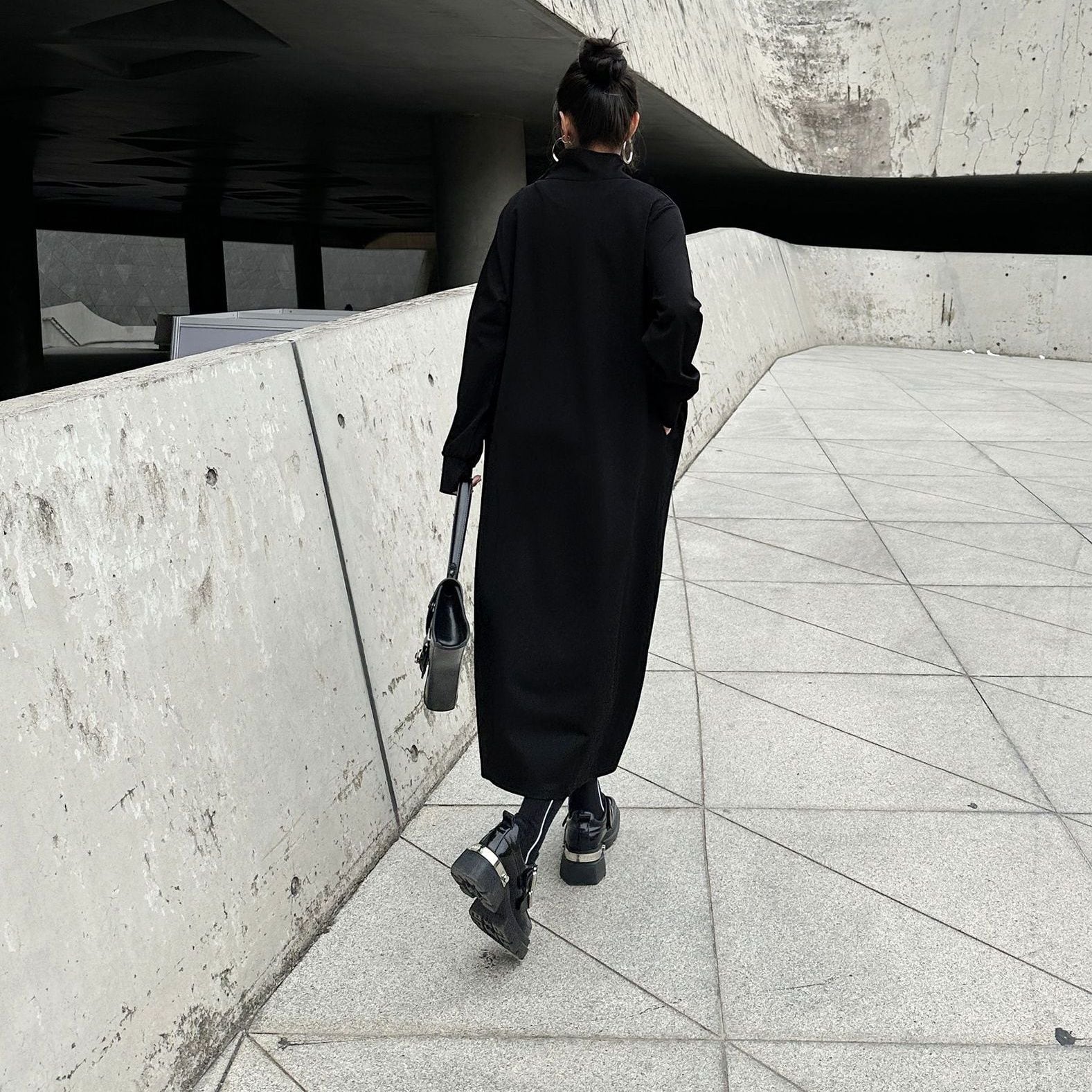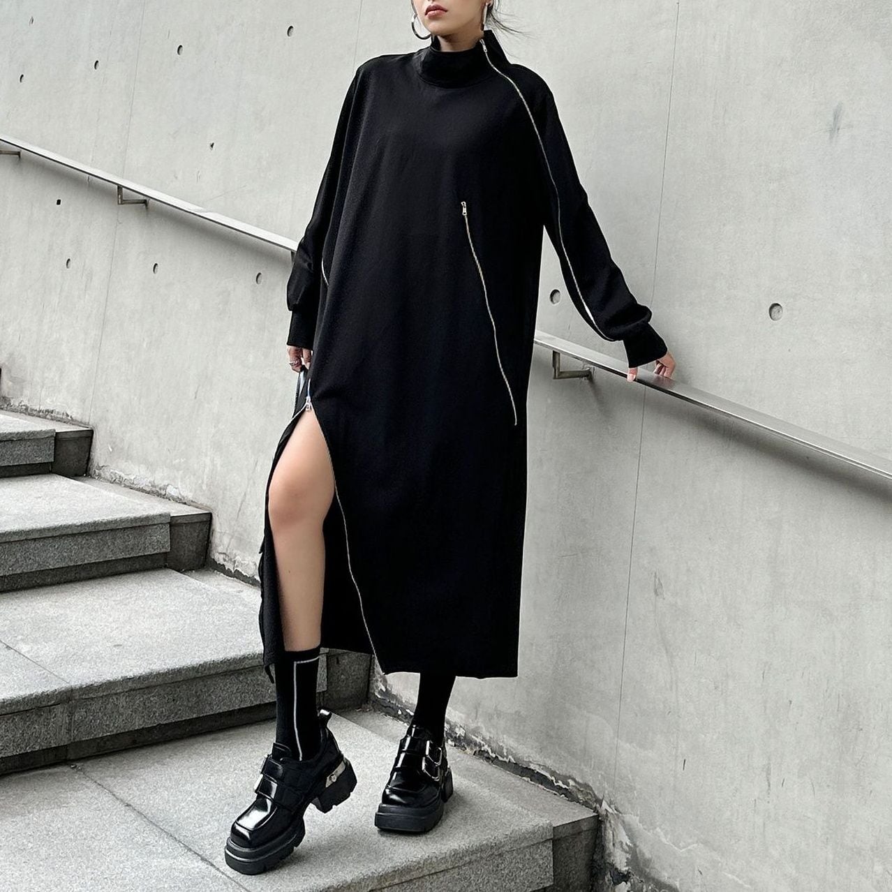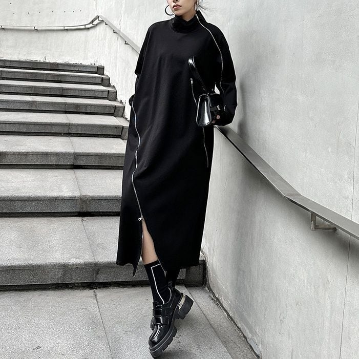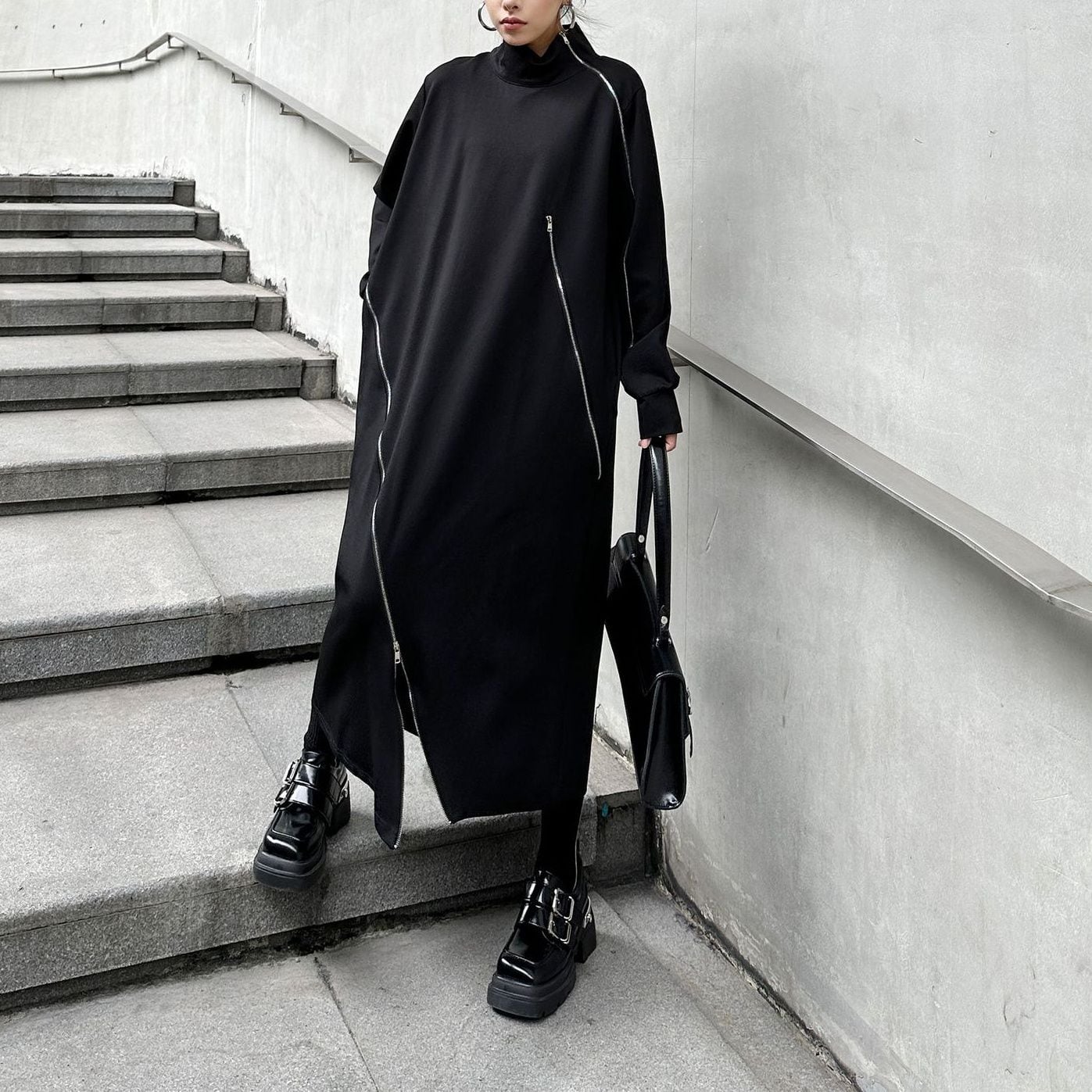 ブラック地に斜めの3本のジップラインがクールな、ハイネック・長袖・ロング丈のプルオーバー・デザインワンピースです。ゆったりとしたストレートのシルエットで、小物や差し色アレンジが利くカジュアルなアイテムです。
