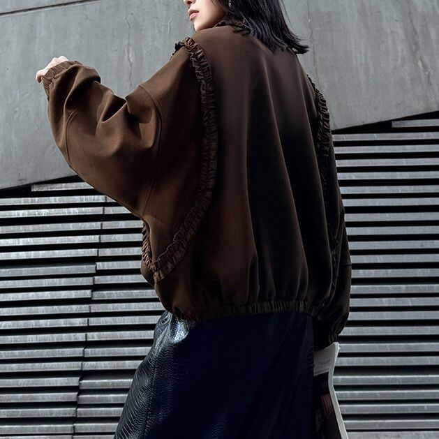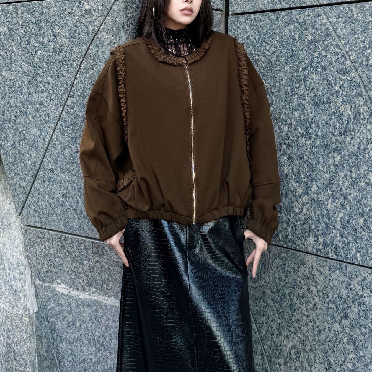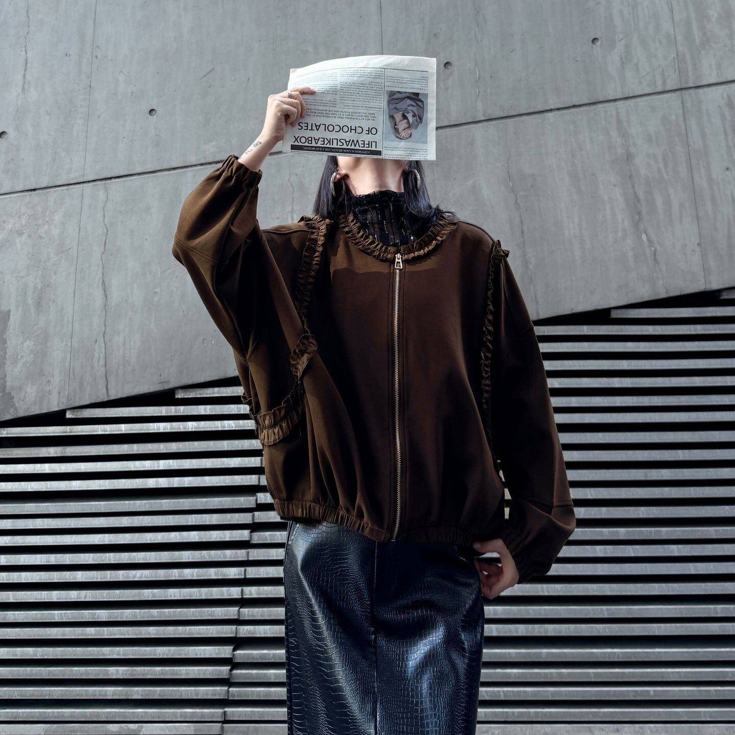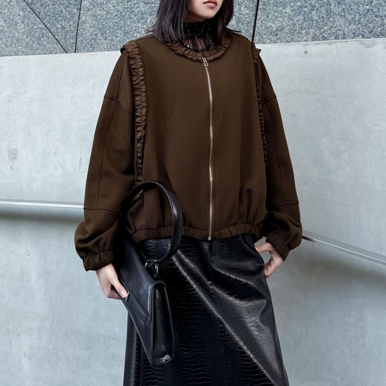 フリルラインでガーリーさをプラスした、ラウンドネック・長袖・ショート丈のフルジップジャケットです。ドルマンスリーブにゴム加工された裾のシルエットがお洒落な、単色で合わせやすいアイテムです。ブラックとブラウンの2色から選べます。