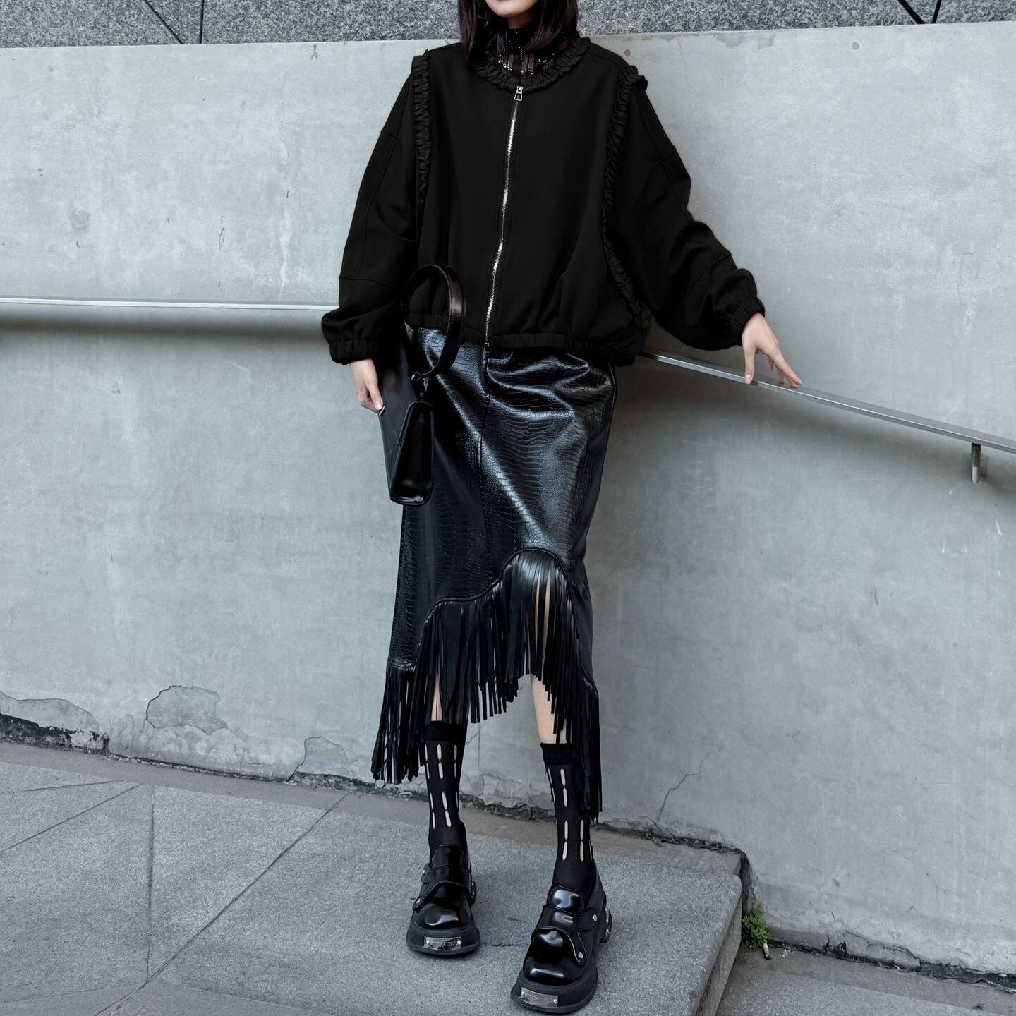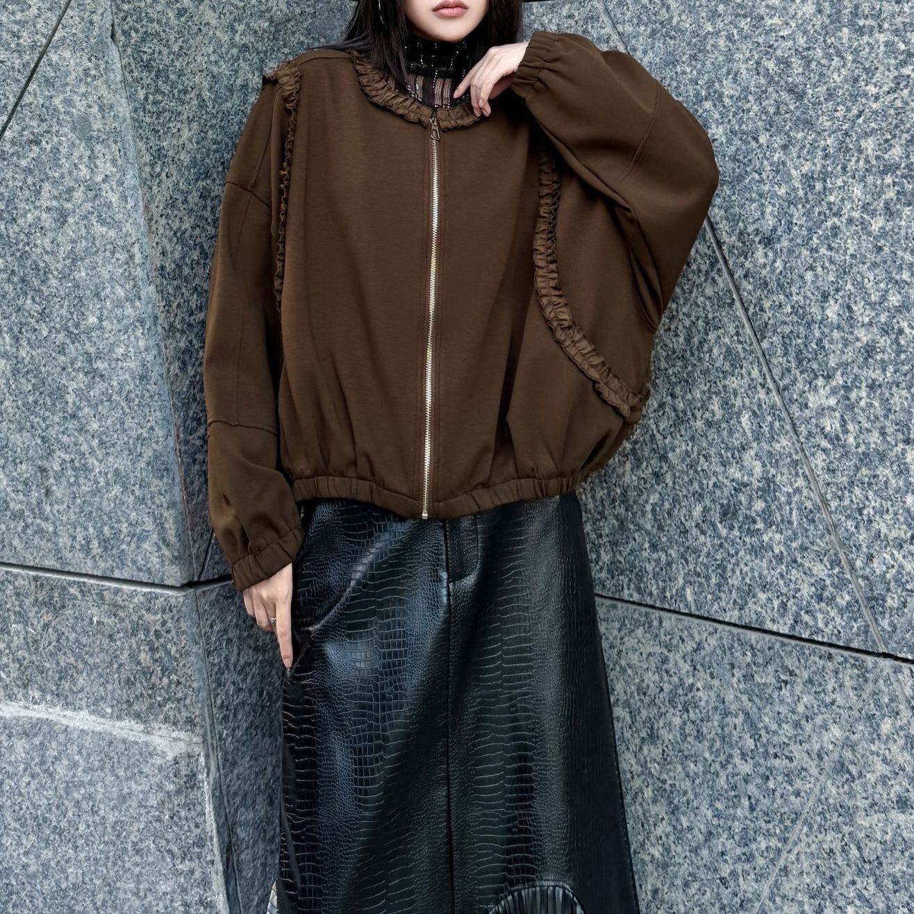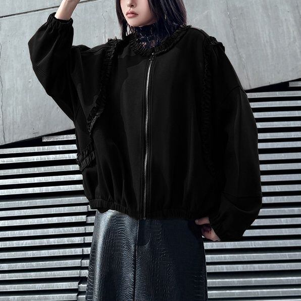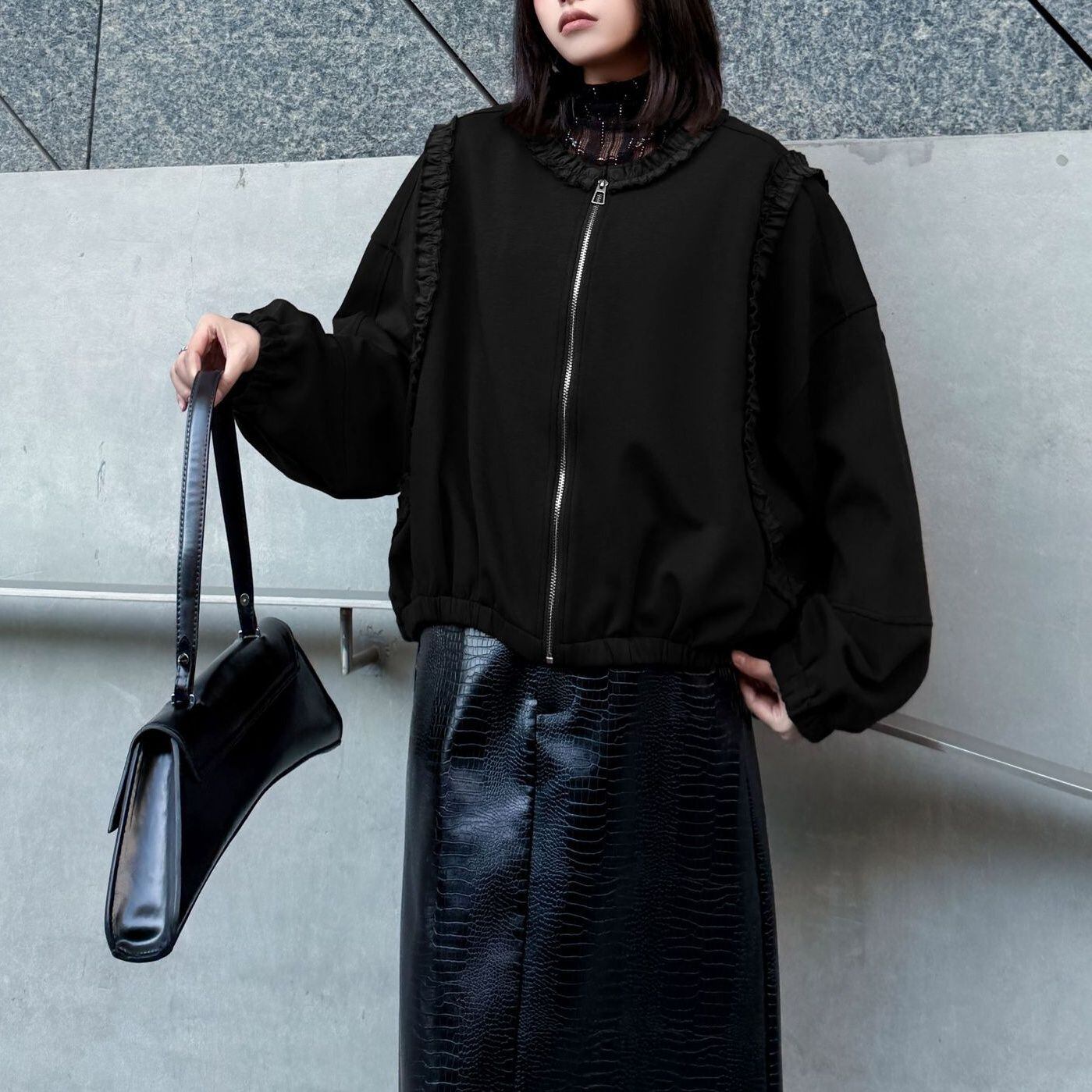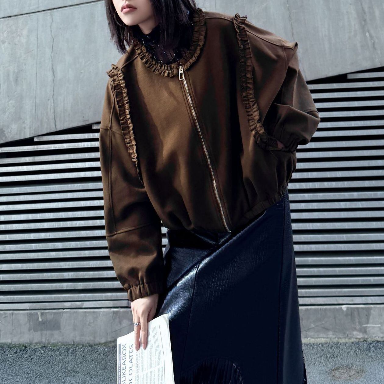 フリルラインでガーリーさをプラスした、ラウンドネック・長袖・ショート丈のフルジップジャケットです。ドルマンスリーブにゴム加工された裾のシルエットがお洒落な、単色で合わせやすいアイテムです。ブラックとブラウンの2色から選べます。
