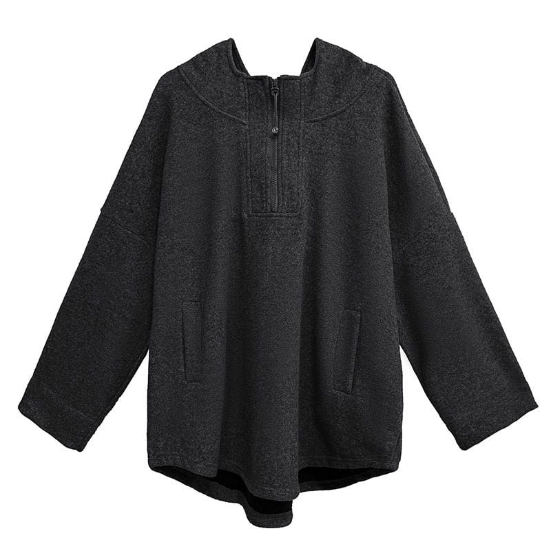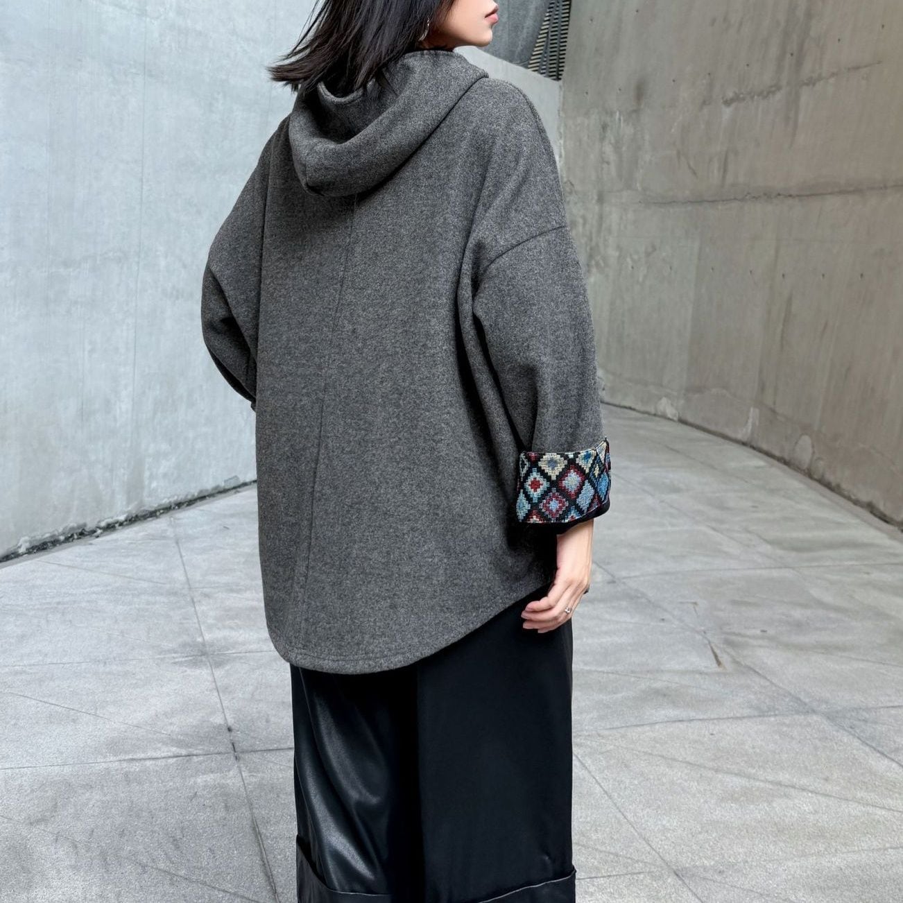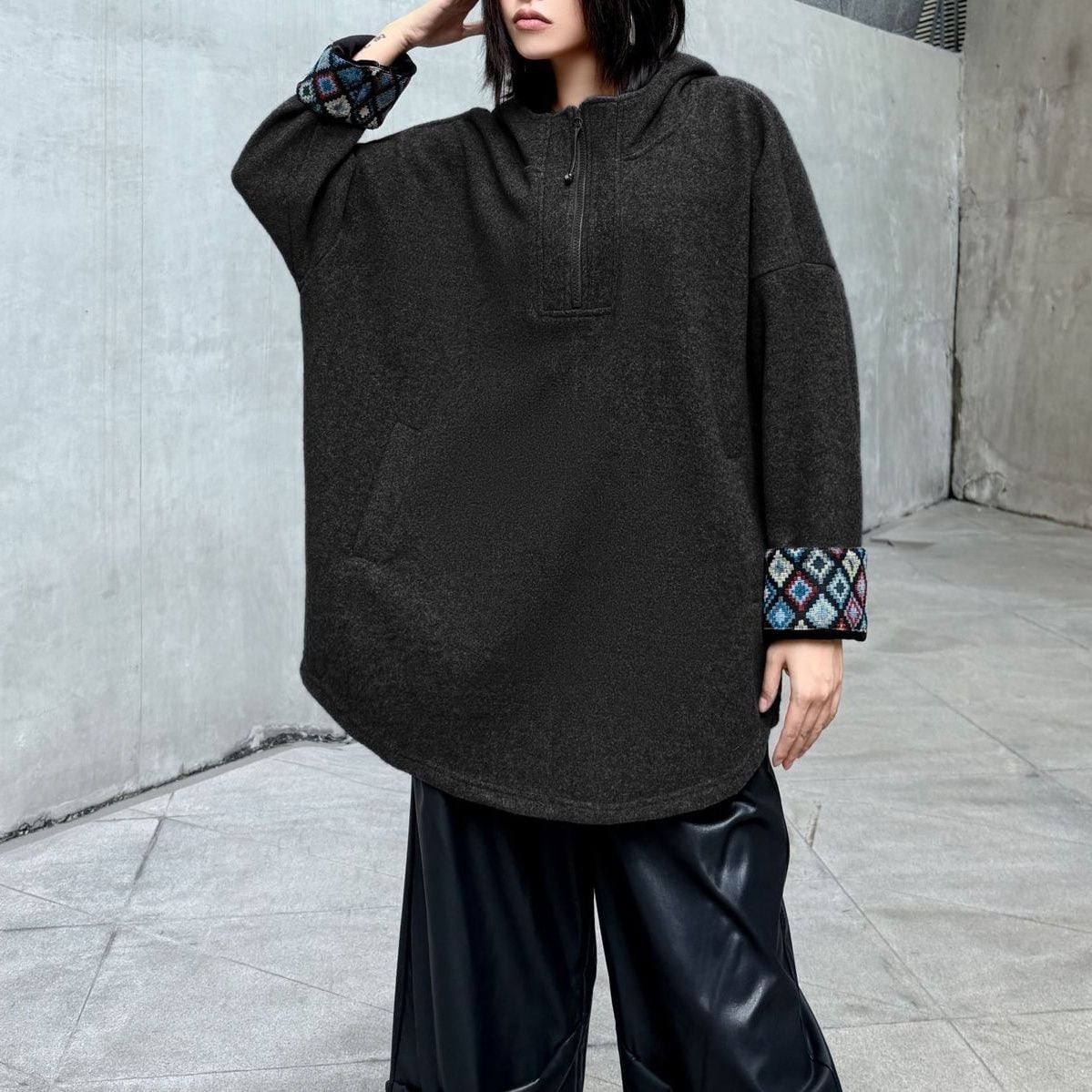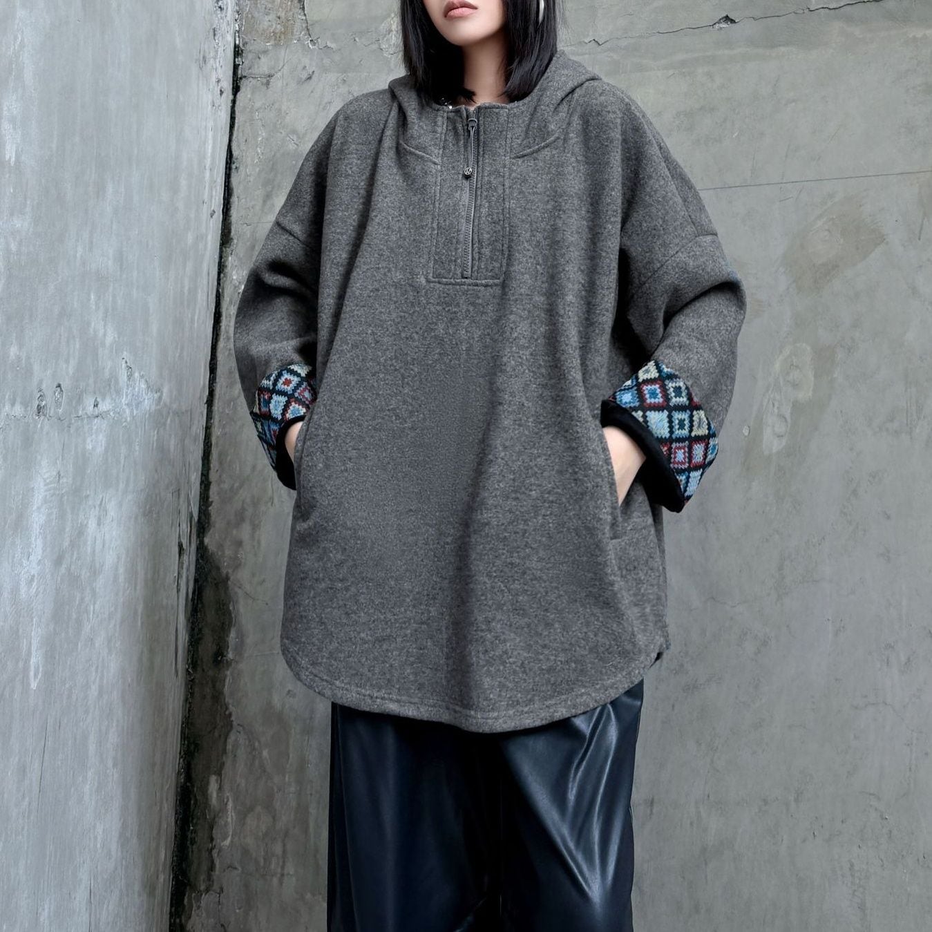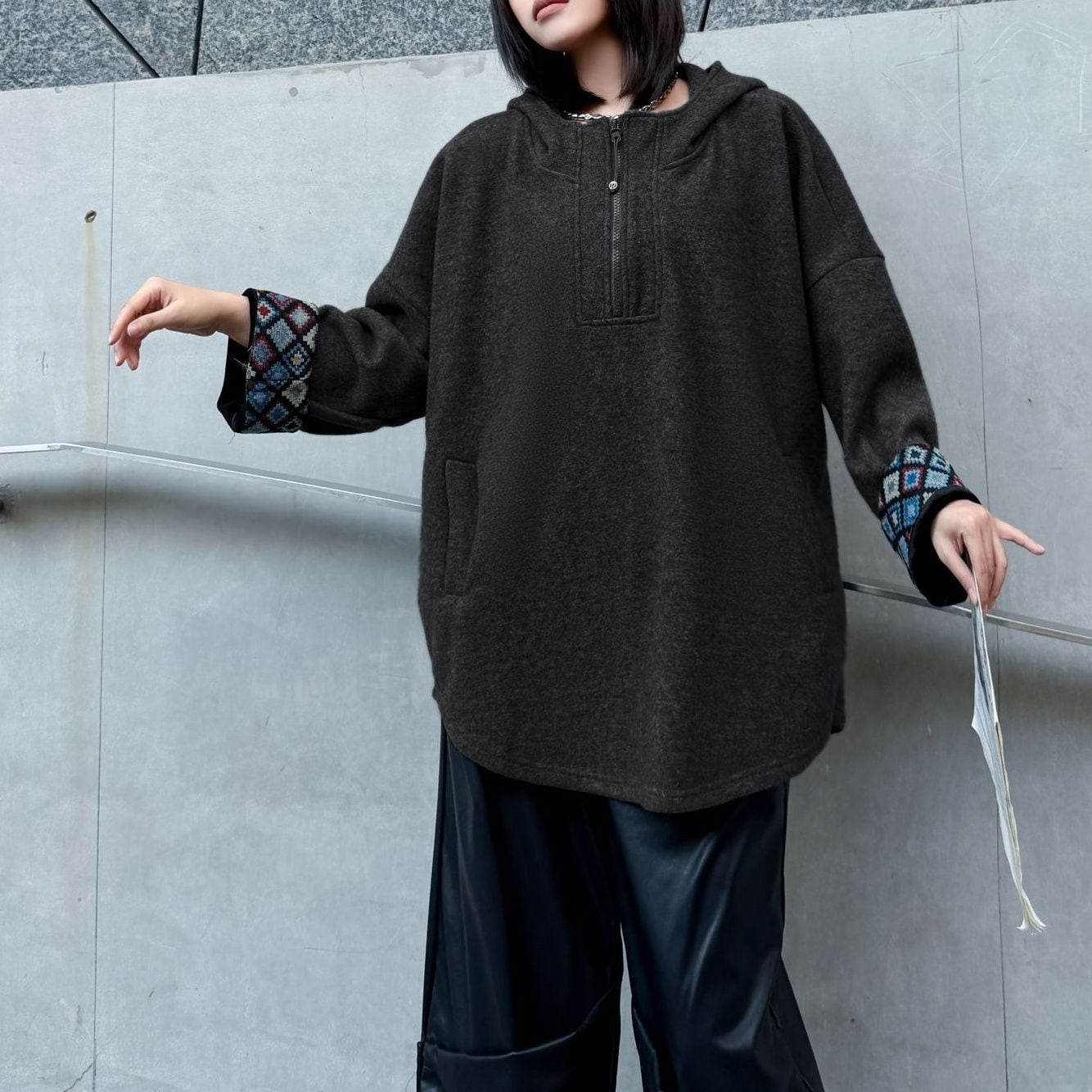 エスニックな柄生地をスティッチした袖口がアクセントになった、フード付き・ハーフジップ・長袖・チュニック丈のプルオーバージャケットです。ゆったりとしたシルエットと落ち着いた色味で合わせやすい、アウトドア系ファッションと相性が良いアイテムです。ライトグレーとダークグレーの2色から選べます。