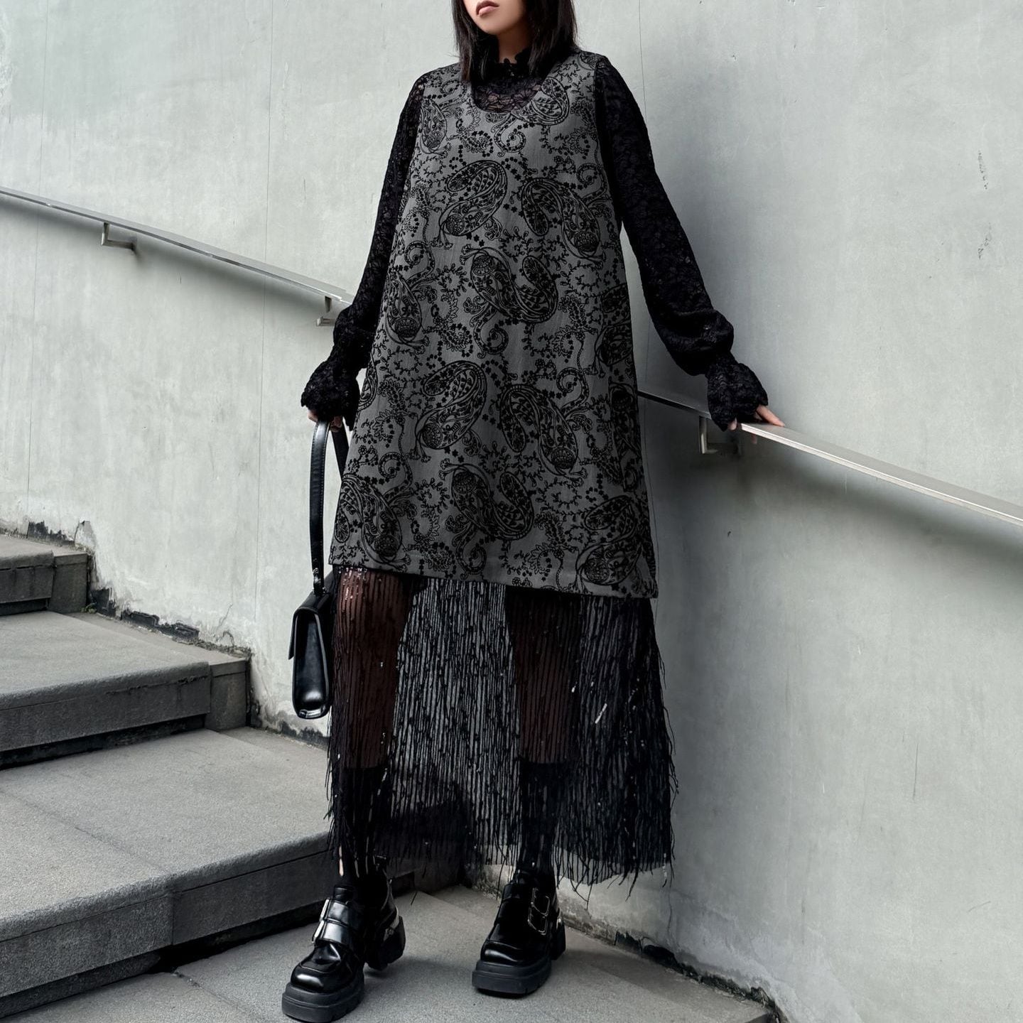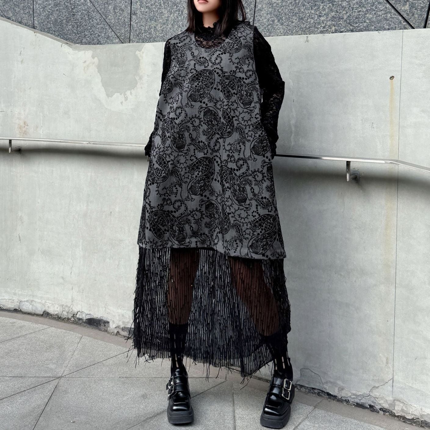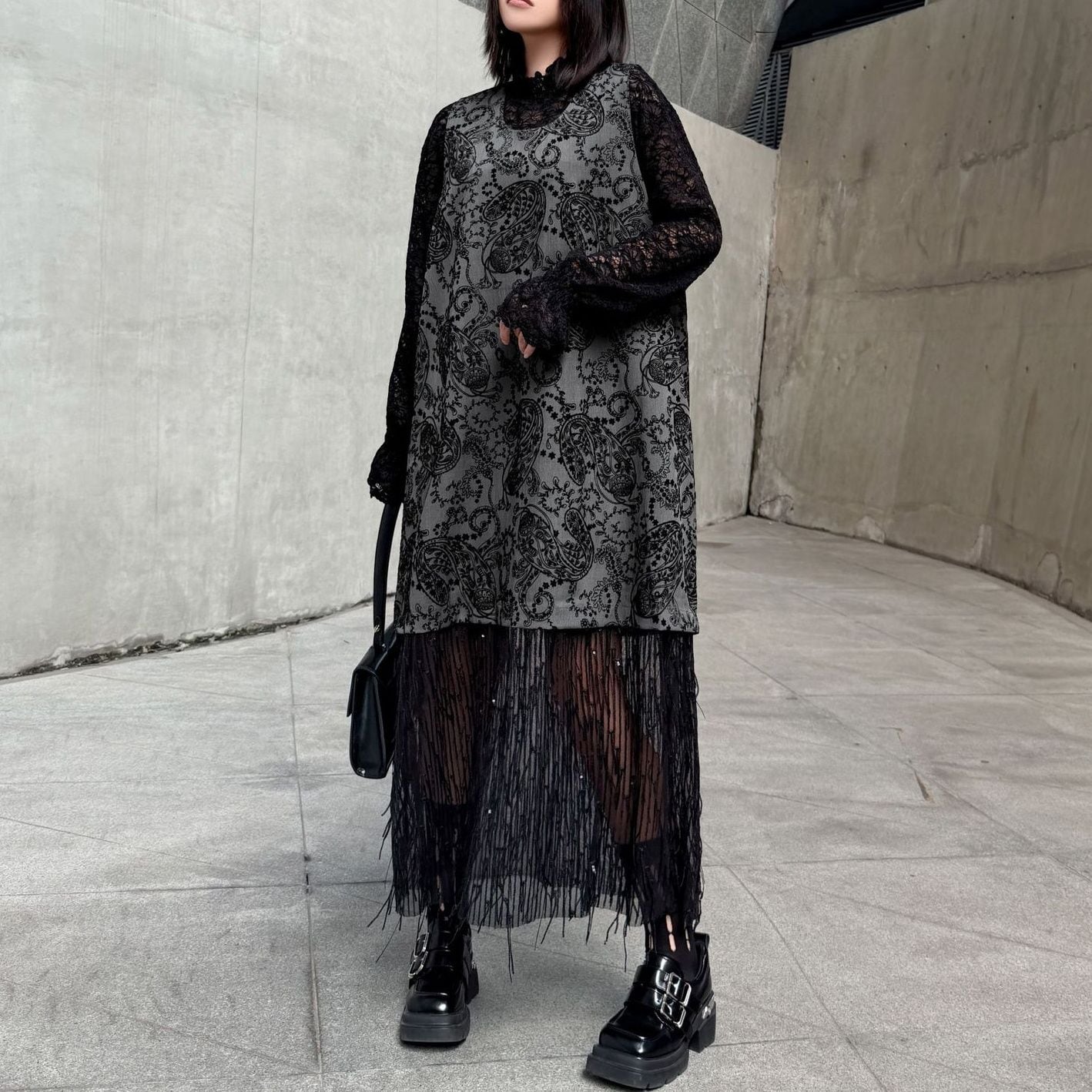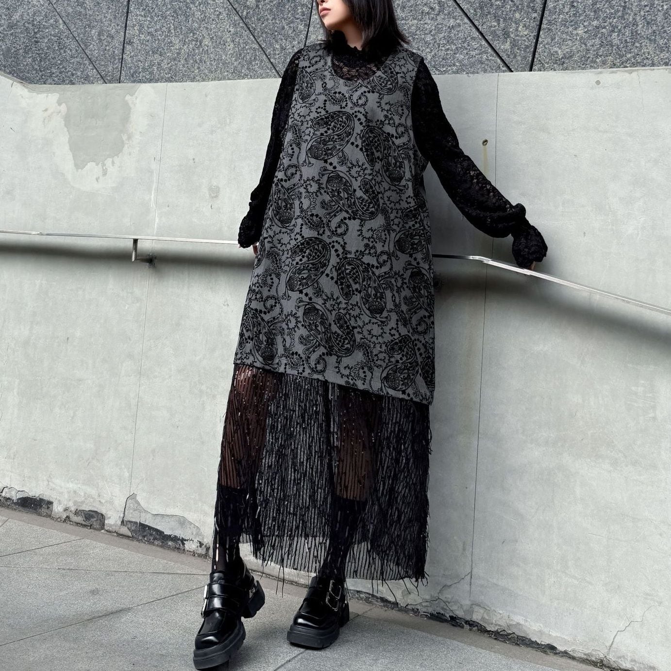 グレー地にブラックのレトロな刺繍が美しい、ラウンドネック・ノースリーブ・ロング丈のデザインワンピースと、インナー用のハイネックのレースシャツです。ワンピースとインナーは別売りです。透け感のある裾にはスパンコールのフリンジが散りばめられていて、広がりすぎないAラインのシルエットが上品なアイテムです。