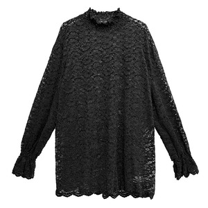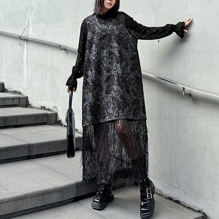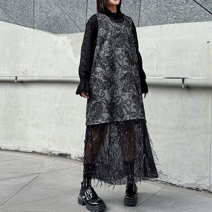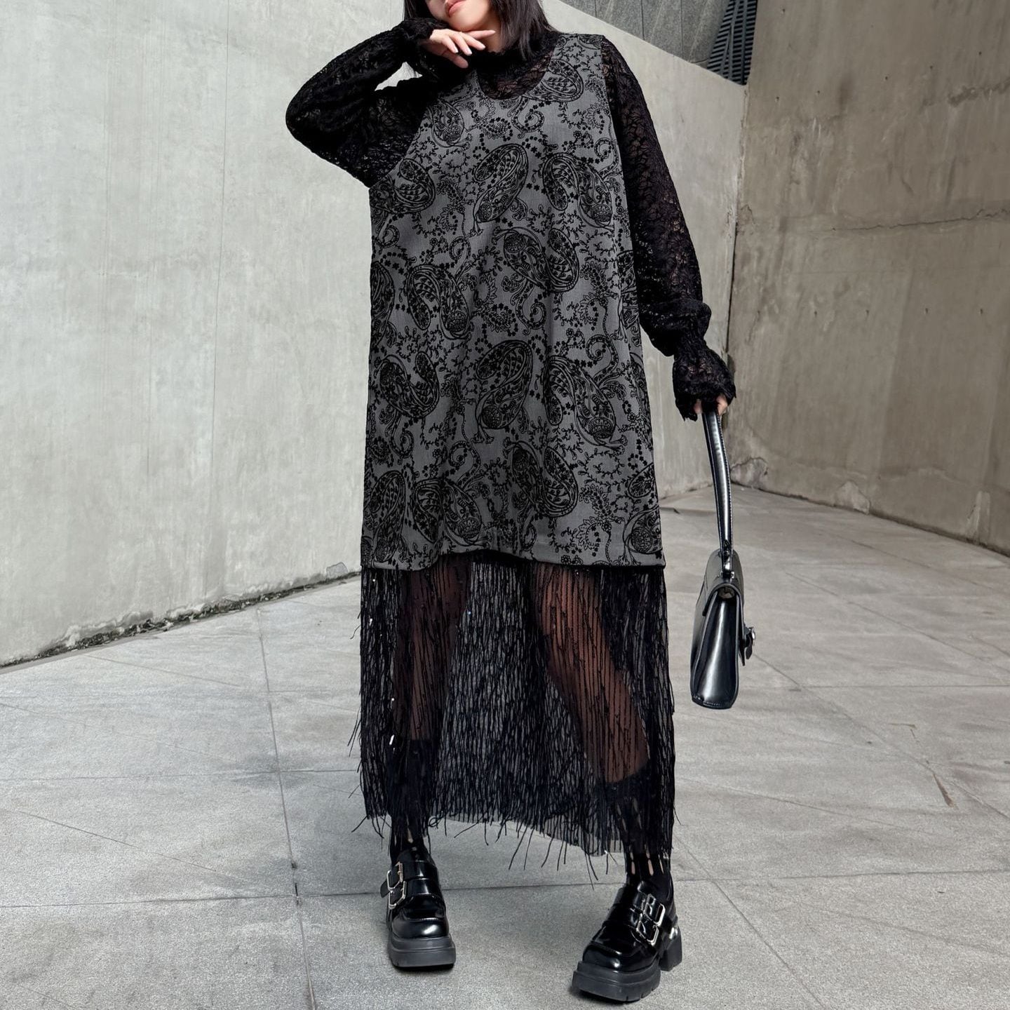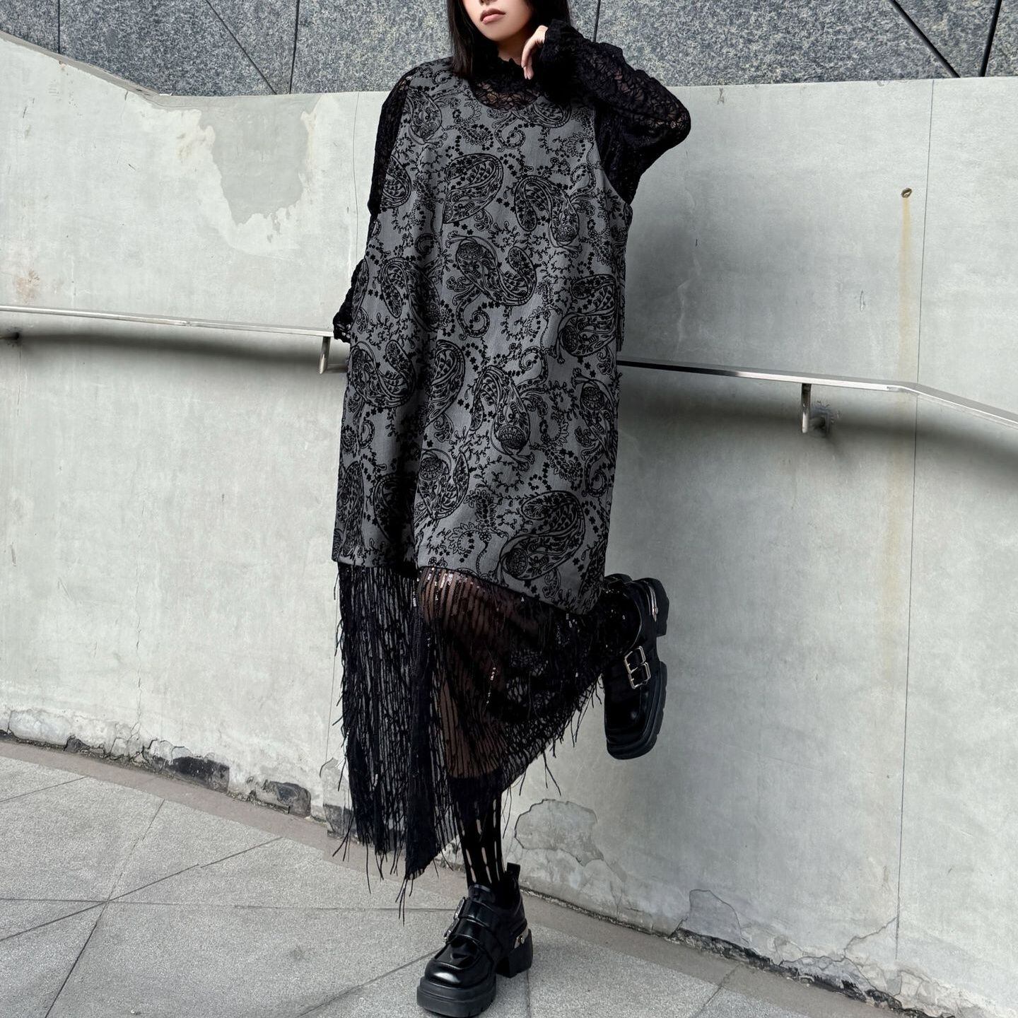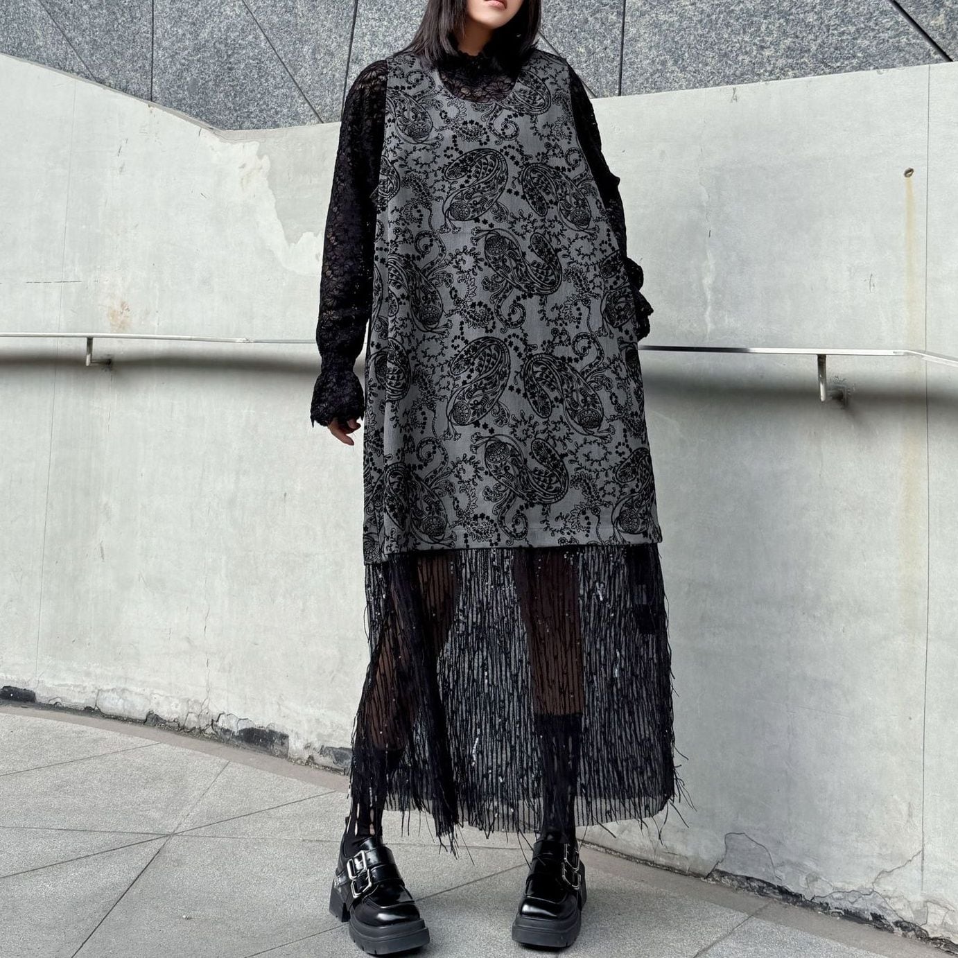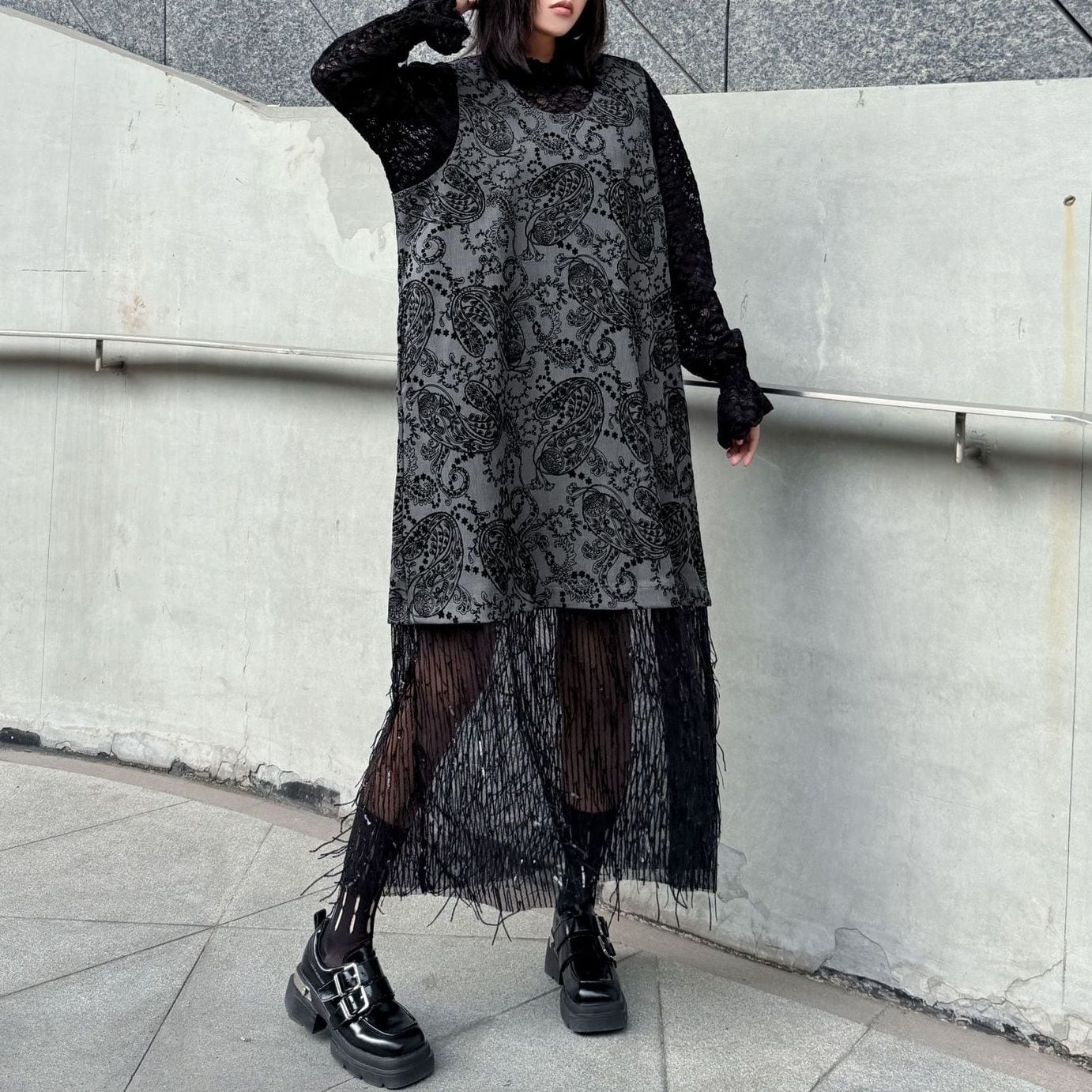 グレー地にブラックのレトロな刺繍が美しい、ラウンドネック・ノースリーブ・ロング丈のデザインワンピースと、インナー用のハイネックのレースシャツです。ワンピースとインナーは別売りです。透け感のある裾にはスパンコールのフリンジが散りばめられていて、広がりすぎないAラインのシルエットが上品なアイテムです。
