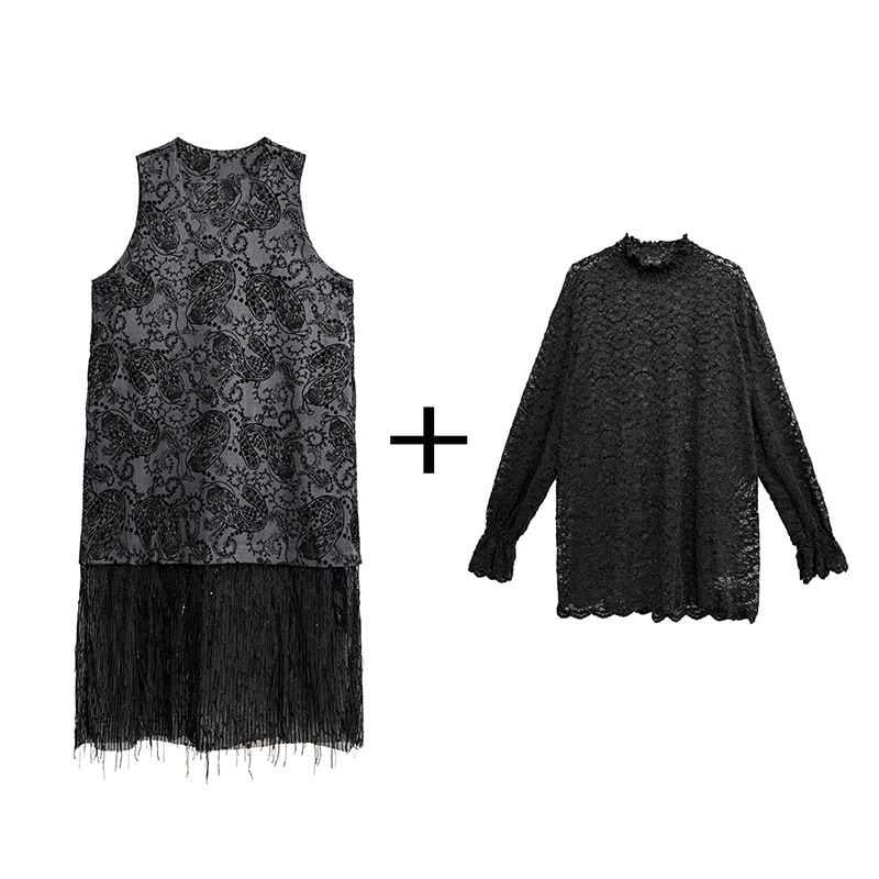 EMBROIDERED SEQUINS FRINGE HEM SLEEVELESS LONG DRESS & HIGH NECK LACE SHIRT 1color M-15267