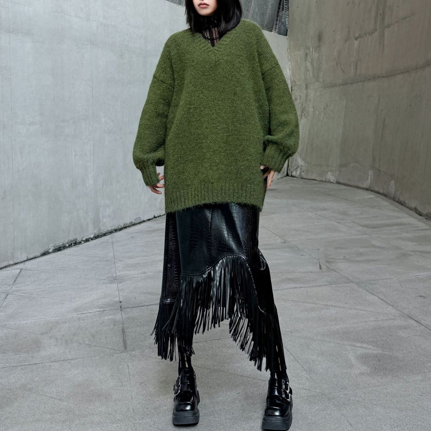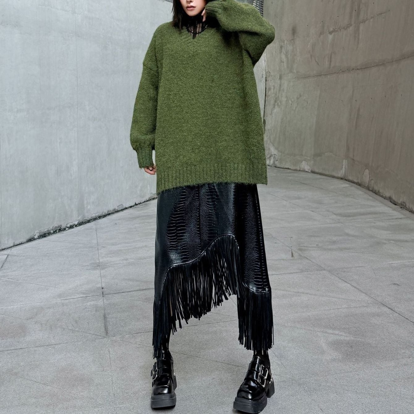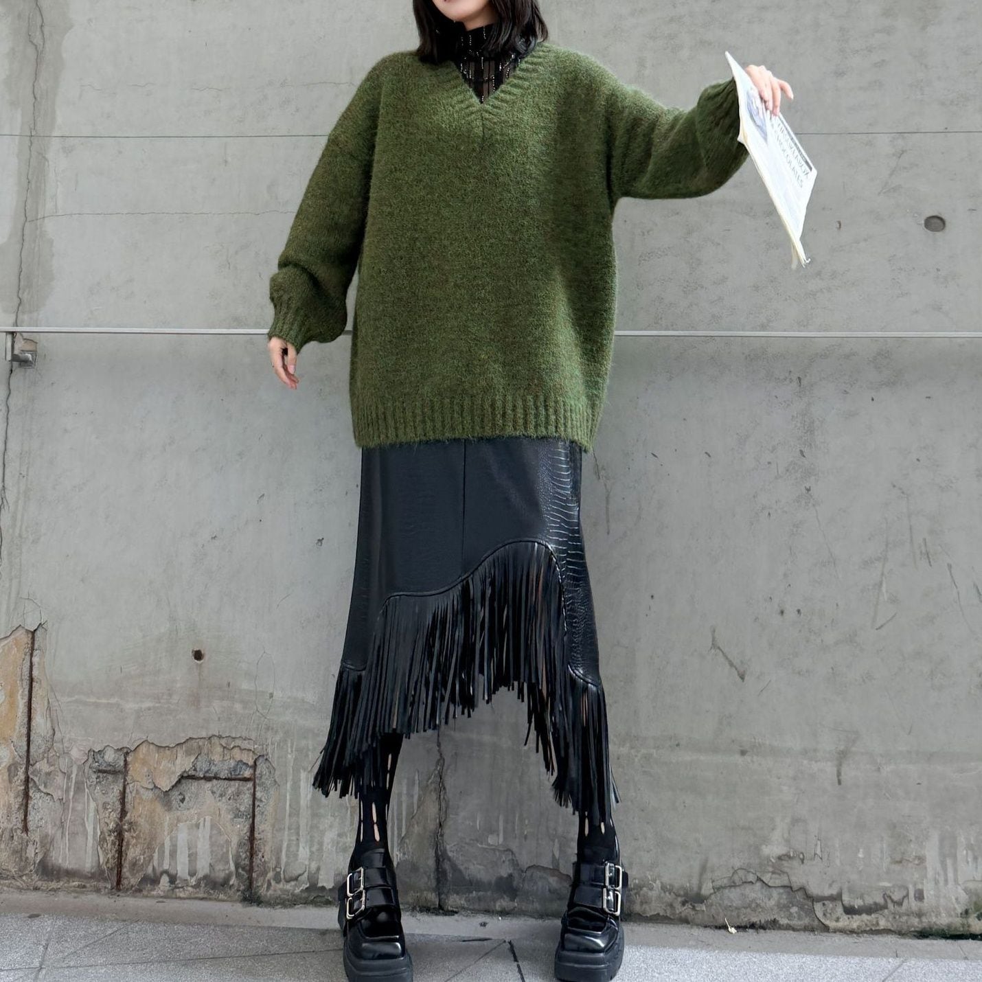 軽くて柔らかなニット素材でできた、Vネック・長袖・チュニック丈のプルオーバーニットです。首周り・袖口・裾がリブ加工された、ゆったりとしたシルエットで重ね着しやすい、シンプルなデザインのアイテムです。ブラックとグリーンの2色から選べます。