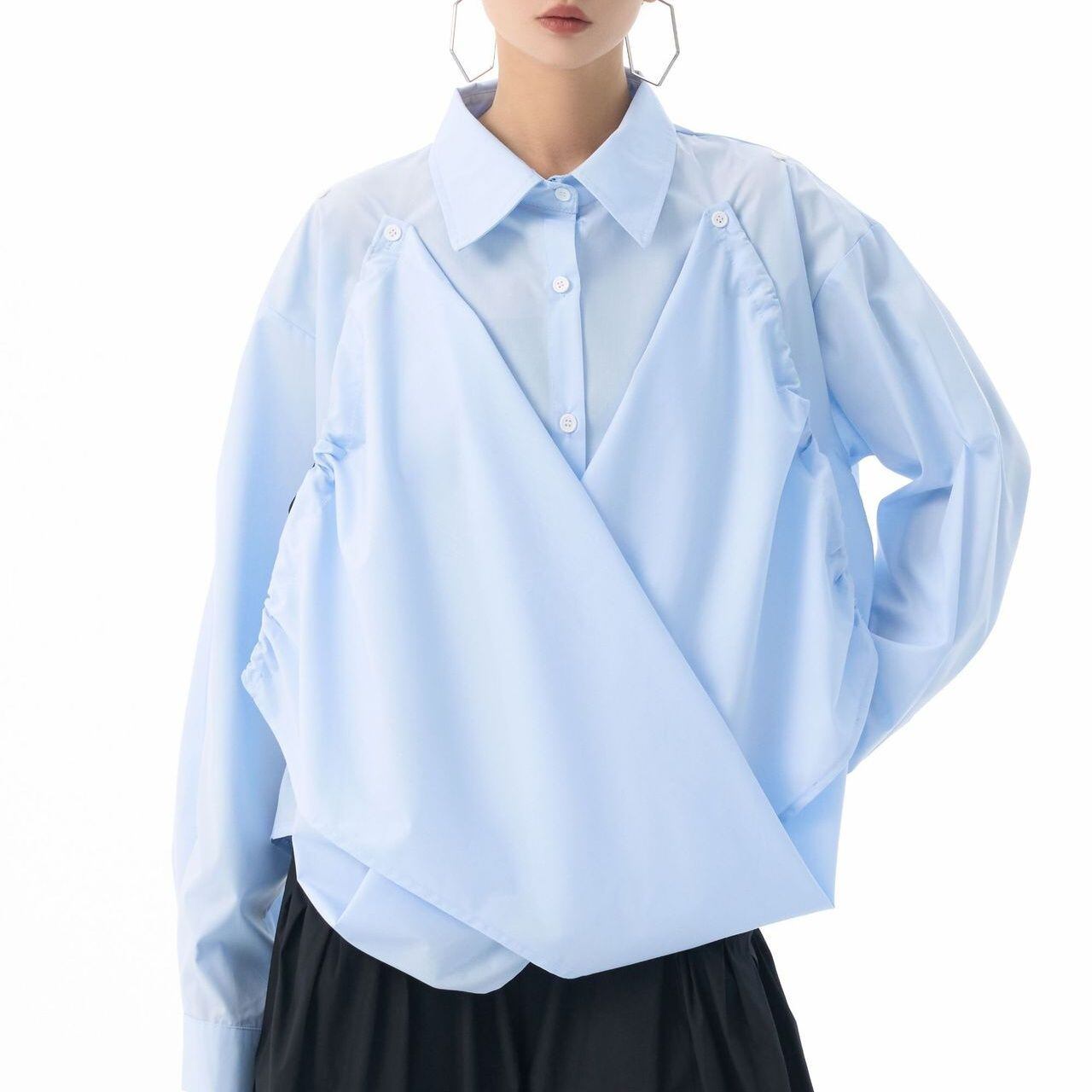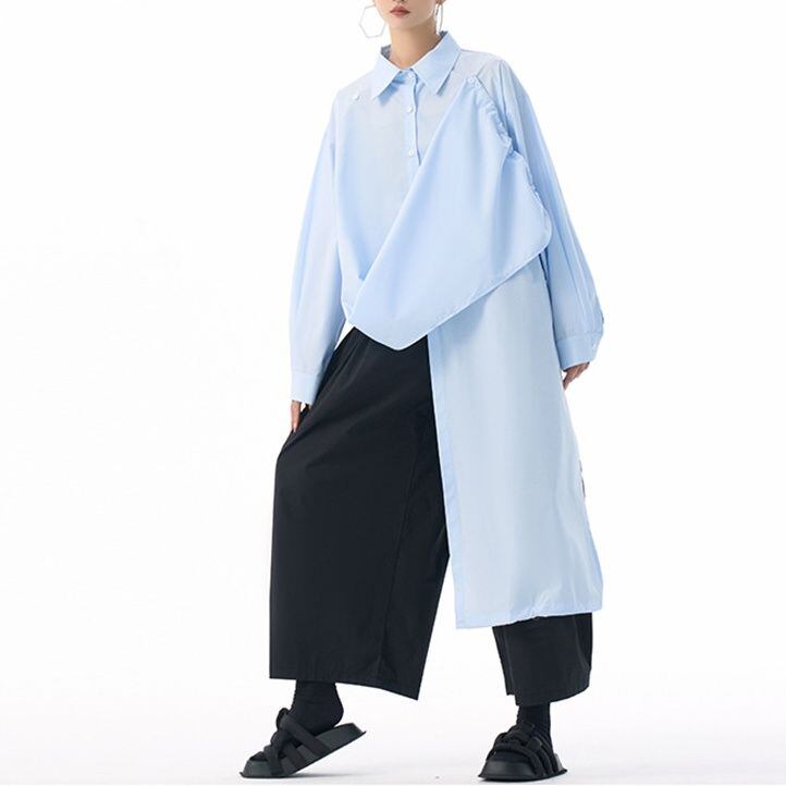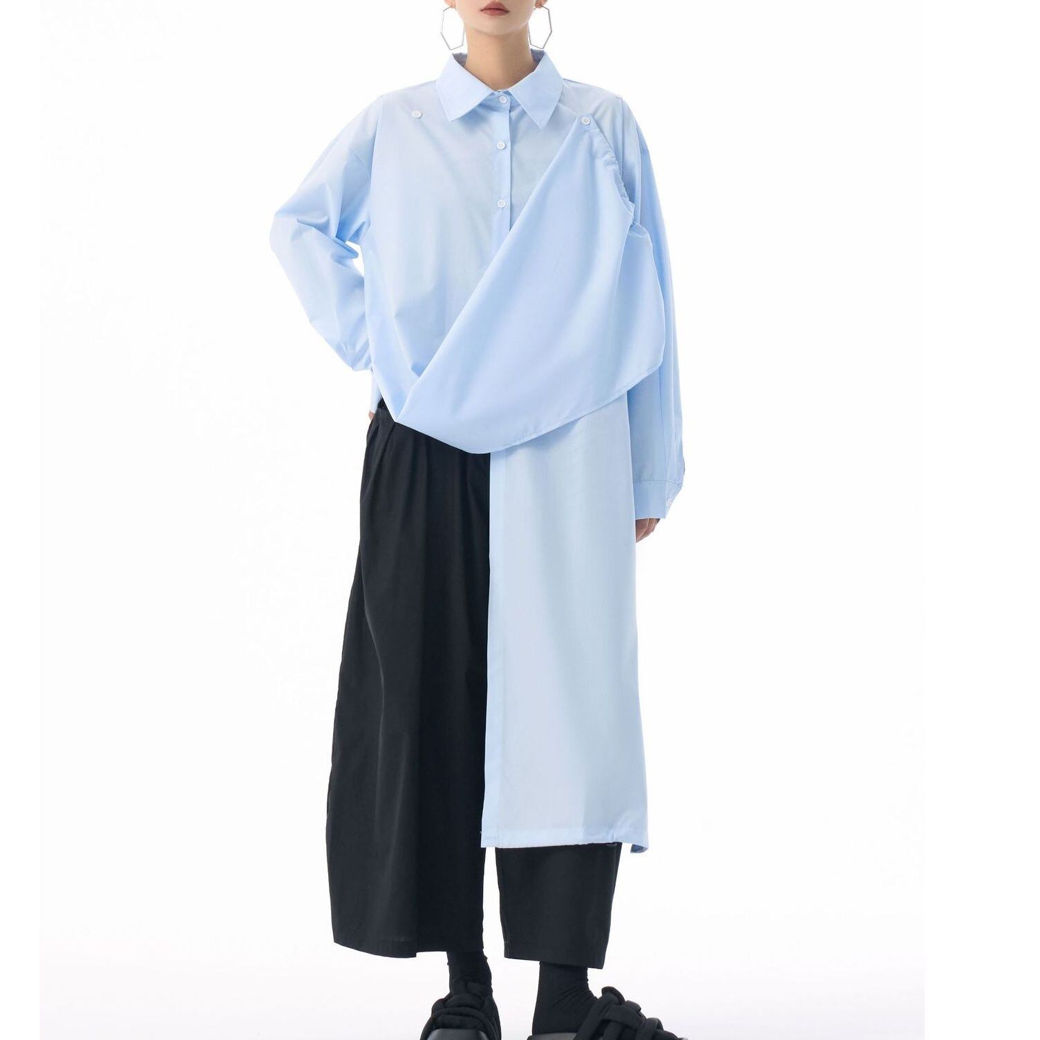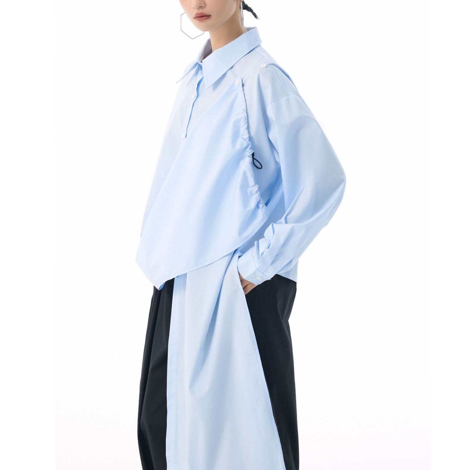 フロントのフラップのように長い裾をショルダーのボタンで留めるアレンジが特徴的な、ポロ襟・長袖・イレギュラーヘムのデザインシャツです。フロントの裾にはドローコードが付いていて、様々なアレンジが可能です。単色で合わせやすい、目を惹くシルエットのアイテムです。色は4色から選べます。 SIZE:※測り方によって2-3cmの差が生じる場合がございます。 【FREE SIZE】バスト118cm 肩幅56cm 袖丈55cm ウエスト120cm 着丈61cm COLOR:White、Blue、Black、Gray 素材:ポリエステル、その他 モデル情報:身長166cm 体重53kg バスト78cm ウエスト64cm ヒップ84cm お届けについて こちらの商品は海外店舗より直接発送となる為、 ご決済から到着までは、多くの場合【10日-2週間前後】でお届けしております。 ※在庫状況や輸送の混雑により、4週間前後かかる場合がございます。 注意事項 ・商品在庫切れにより注文キャンセルとさせていただく恐れもございますので、予めご了承くださいませ。 ・仕入れ工場を変えることがあるため、記載サイズと若干異なる場合がございます。 ・商品の色味は、お手持ちのスマートフォンの画面によって実物と若干異なる場合がございます。 ・イメージ違いやサイズ交換等、お客さまご都合による交換・返品はご遠慮ください。 送料について 全国一律580円。ただし10,000円以上のご注文で送料無料となります。 お支払い方法について ・クレジットカード決済(VISA/Mastercard/JCB/アメリカン・エクスプレス/ Diners Club) ・コンビニ決済/Pay-easy ※前払いのお支払い方法 ・Pay ID あと払い(コンビニ払い、口座振替) ※あと払いのお支払い方法 ・キャリア決済(d払い/au PAY(auかんたん決済)/ソフトバンク・ワイモバイルまとめて支払い) 管理番号:M-15271