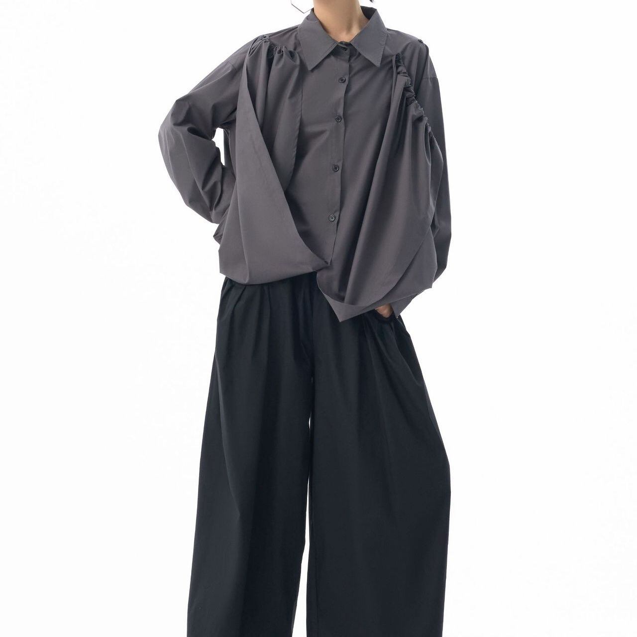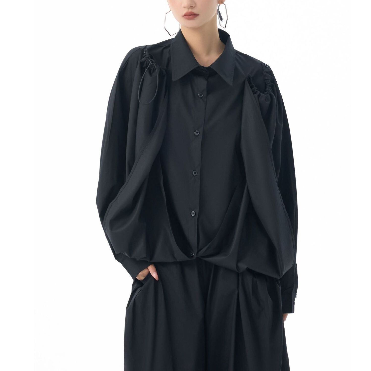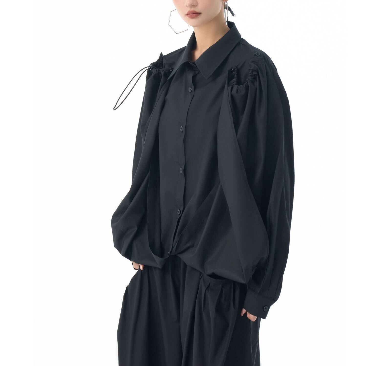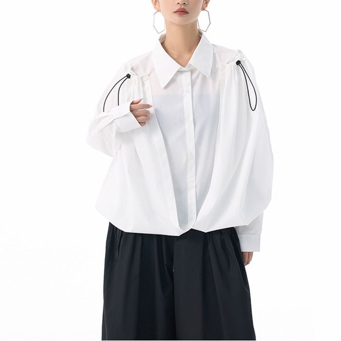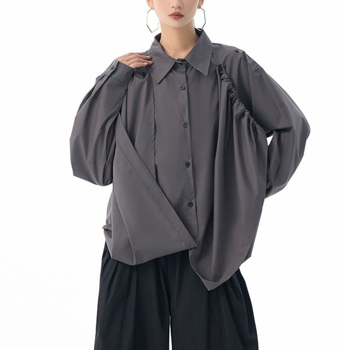 フロントのフラップのように長い裾をショルダーのボタンで留めるアレンジが特徴的な、ポロ襟・長袖・イレギュラーヘムのデザインシャツです。フロントの裾にはドローコードが付いていて、様々なアレンジが可能です。単色で合わせやすい、目を惹くシルエットのアイテムです。色は4色から選べます。 SIZE:※測り方によって2-3cmの差が生じる場合がございます。 【FREE SIZE】バスト118cm 肩幅56cm 袖丈55cm ウエスト120cm 着丈61cm COLOR:White、Blue、Black、Gray 素材:ポリエステル、その他 モデル情報:身長166cm 体重53kg バスト78cm ウエスト64cm ヒップ84cm お届けについて こちらの商品は海外店舗より直接発送となる為、 ご決済から到着までは、多くの場合【10日-2週間前後】でお届けしております。 ※在庫状況や輸送の混雑により、4週間前後かかる場合がございます。 注意事項 ・商品在庫切れにより注文キャンセルとさせていただく恐れもございますので、予めご了承くださいませ。 ・仕入れ工場を変えることがあるため、記載サイズと若干異なる場合がございます。 ・商品の色味は、お手持ちのスマートフォンの画面によって実物と若干異なる場合がございます。 ・イメージ違いやサイズ交換等、お客さまご都合による交換・返品はご遠慮ください。 送料について 全国一律580円。ただし10,000円以上のご注文で送料無料となります。 お支払い方法について ・クレジットカード決済(VISA/Mastercard/JCB/アメリカン・エクスプレス/ Diners Club) ・コンビニ決済/Pay-easy ※前払いのお支払い方法 ・Pay ID あと払い(コンビニ払い、口座振替) ※あと払いのお支払い方法 ・キャリア決済(d払い/au PAY(auかんたん決済)/ソフトバンク・ワイモバイルまとめて支払い) 管理番号:M-15271