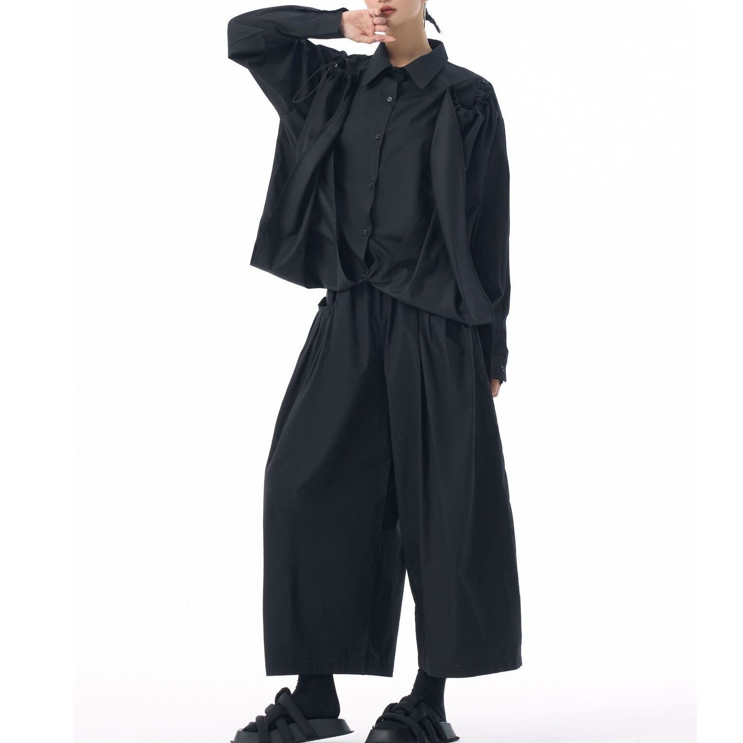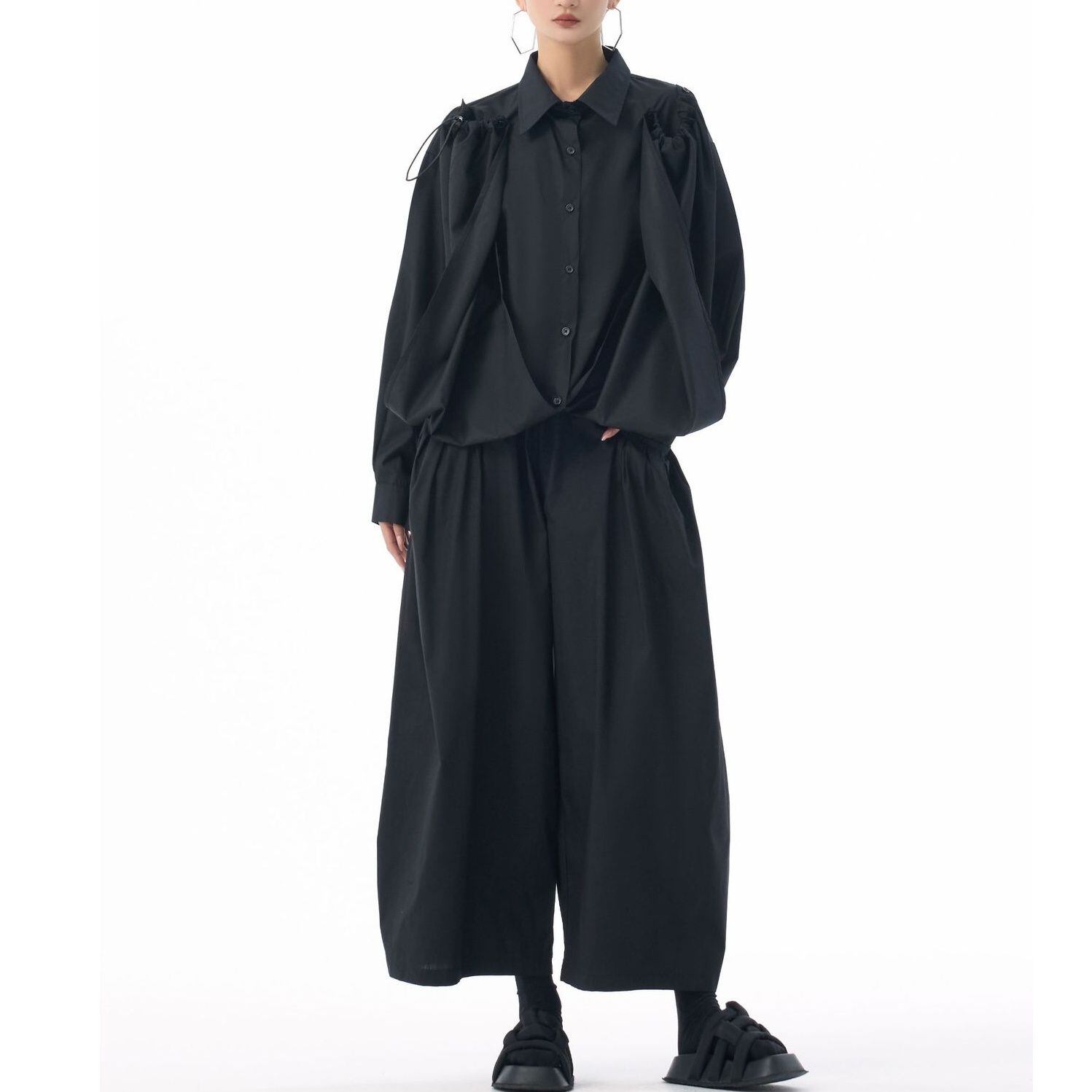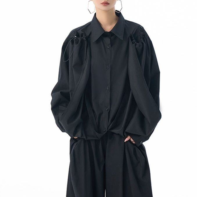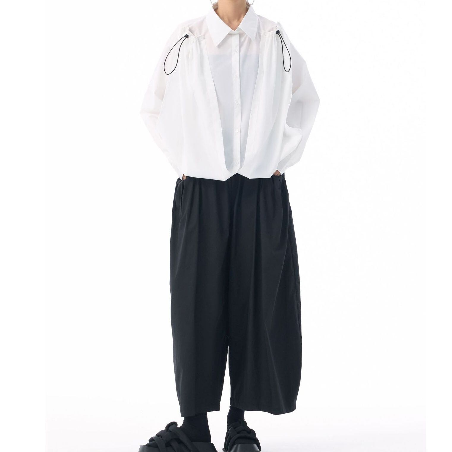 フロントのフラップのように長い裾をショルダーのボタンで留めるアレンジが特徴的な、ポロ襟・長袖・イレギュラーヘムのデザインシャツです。フロントの裾にはドローコードが付いていて、様々なアレンジが可能です。単色で合わせやすい、目を惹くシルエットのアイテムです。色は4色から選べます。 SIZE:※測り方によって2-3cmの差が生じる場合がございます。 【FREE SIZE】バスト118cm 肩幅56cm 袖丈55cm ウエスト120cm 着丈61cm COLOR:White、Blue、Black、Gray 素材:ポリエステル、その他 モデル情報:身長166cm 体重53kg バスト78cm ウエスト64cm ヒップ84cm お届けについて こちらの商品は海外店舗より直接発送となる為、 ご決済から到着までは、多くの場合【10日-2週間前後】でお届けしております。 ※在庫状況や輸送の混雑により、4週間前後かかる場合がございます。 注意事項 ・商品在庫切れにより注文キャンセルとさせていただく恐れもございますので、予めご了承くださいませ。 ・仕入れ工場を変えることがあるため、記載サイズと若干異なる場合がございます。 ・商品の色味は、お手持ちのスマートフォンの画面によって実物と若干異なる場合がございます。 ・イメージ違いやサイズ交換等、お客さまご都合による交換・返品はご遠慮ください。 送料について 全国一律580円。ただし10,000円以上のご注文で送料無料となります。 お支払い方法について ・クレジットカード決済(VISA/Mastercard/JCB/アメリカン・エクスプレス/ Diners Club) ・コンビニ決済/Pay-easy ※前払いのお支払い方法 ・Pay ID あと払い(コンビニ払い、口座振替) ※あと払いのお支払い方法 ・キャリア決済(d払い/au PAY(auかんたん決済)/ソフトバンク・ワイモバイルまとめて支払い) 管理番号:M-15271