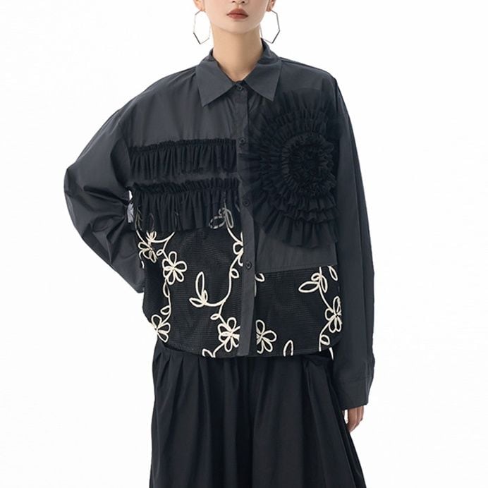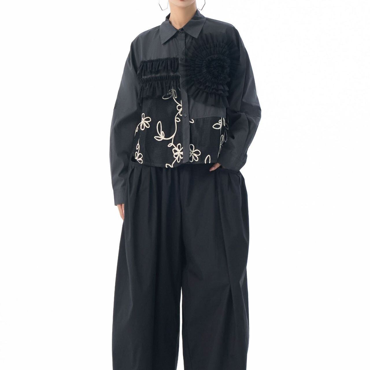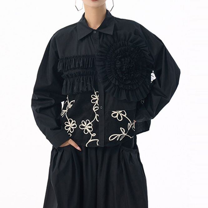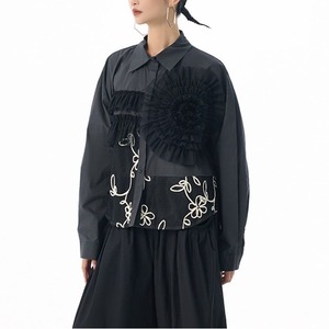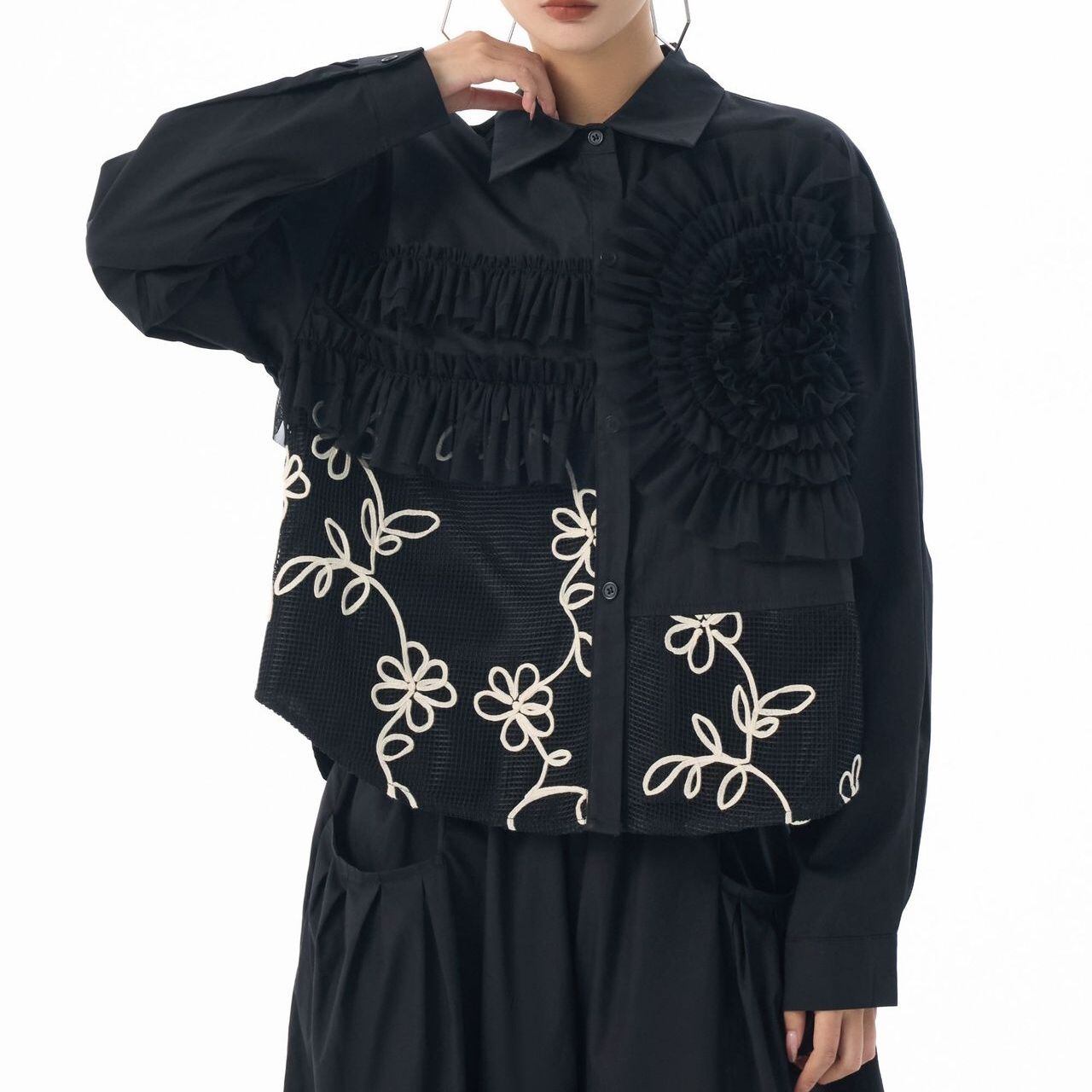 花柄プリントのスティッチがキュートな、ポロ襟・長袖・ショート丈のデザインシャツです。メッシュ素材のフリルで作られたライン飾りやりっらい的なお花のモチーフが目を惹く、コーディネートの主役になるアイテムです。ブラックとダークグレーの2色から選べます。