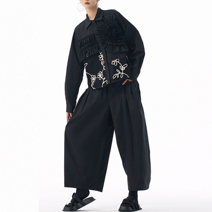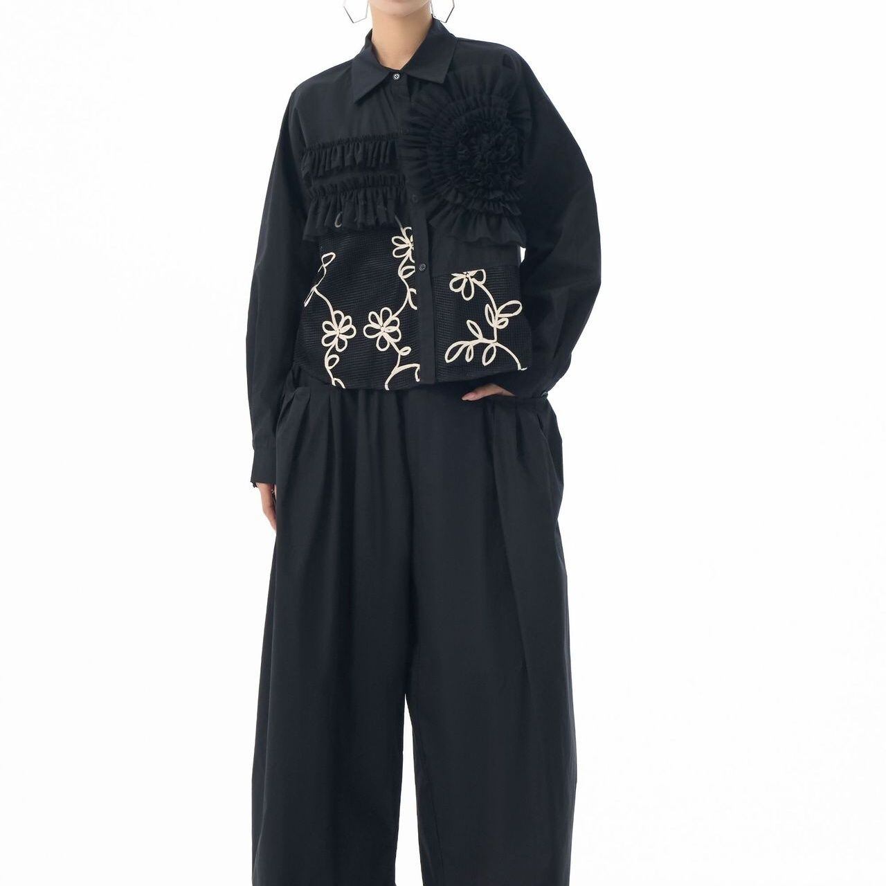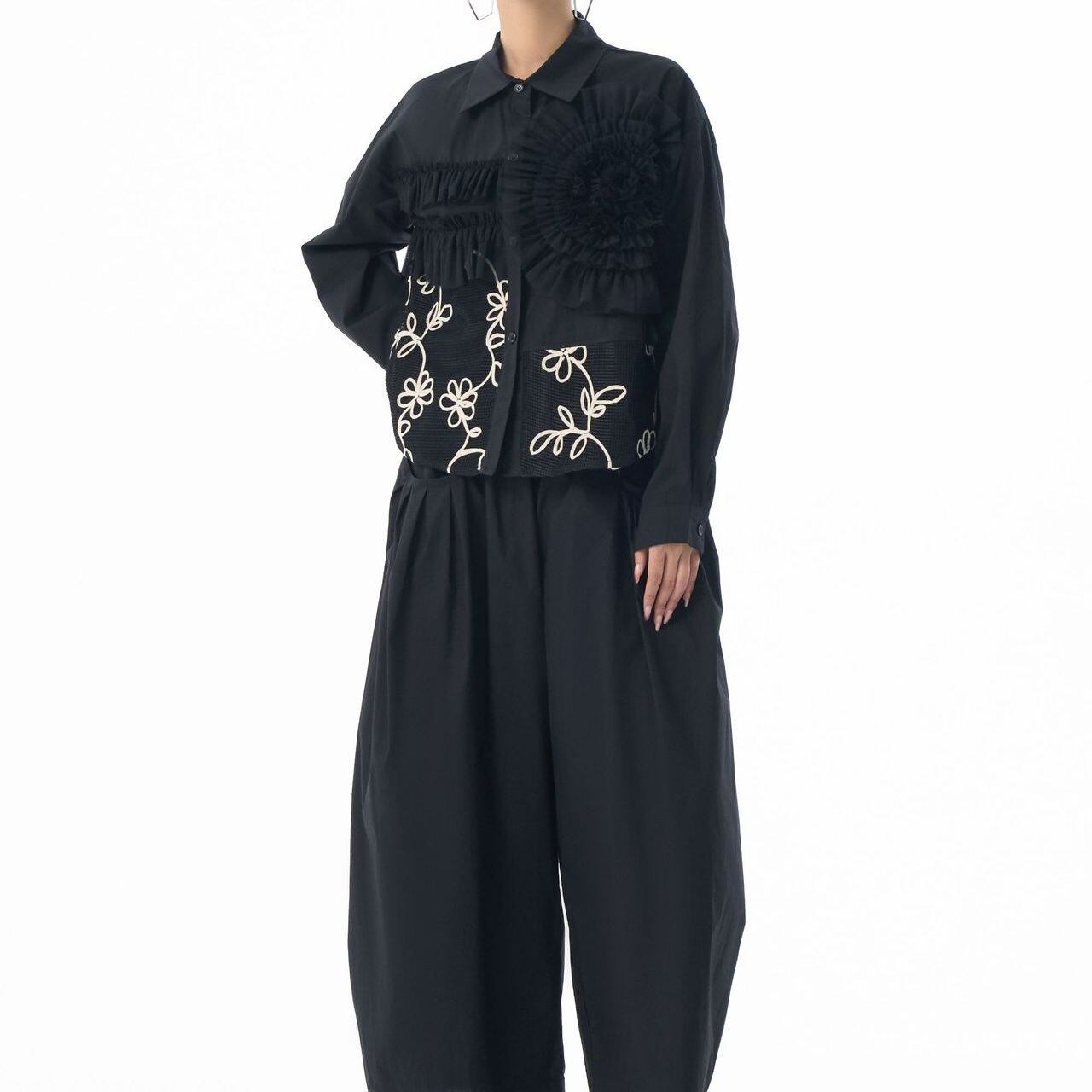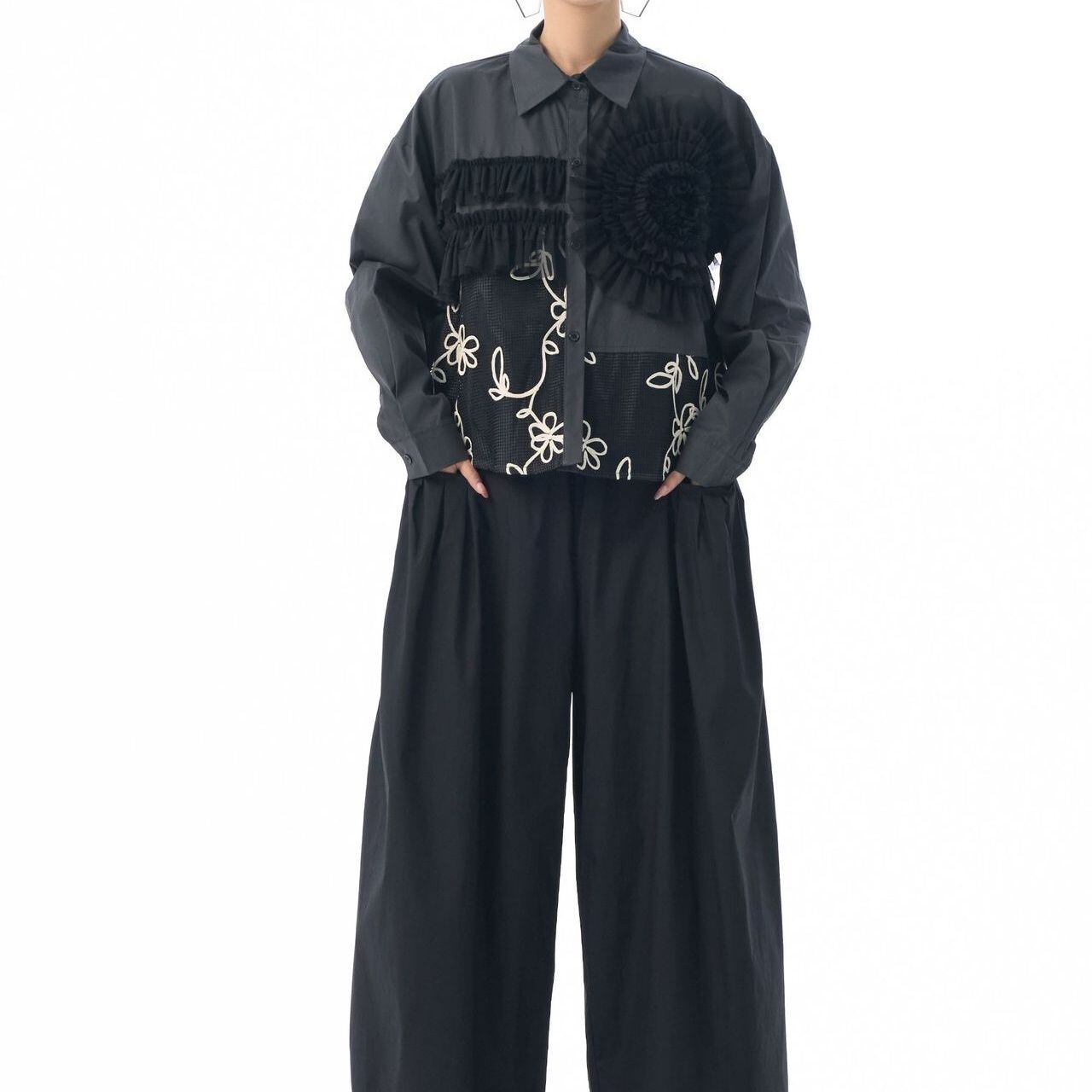 花柄プリントのスティッチがキュートな、ポロ襟・長袖・ショート丈のデザインシャツです。メッシュ素材のフリルで作られたライン飾りやりっらい的なお花のモチーフが目を惹く、コーディネートの主役になるアイテムです。ブラックとダークグレーの2色から選べます。