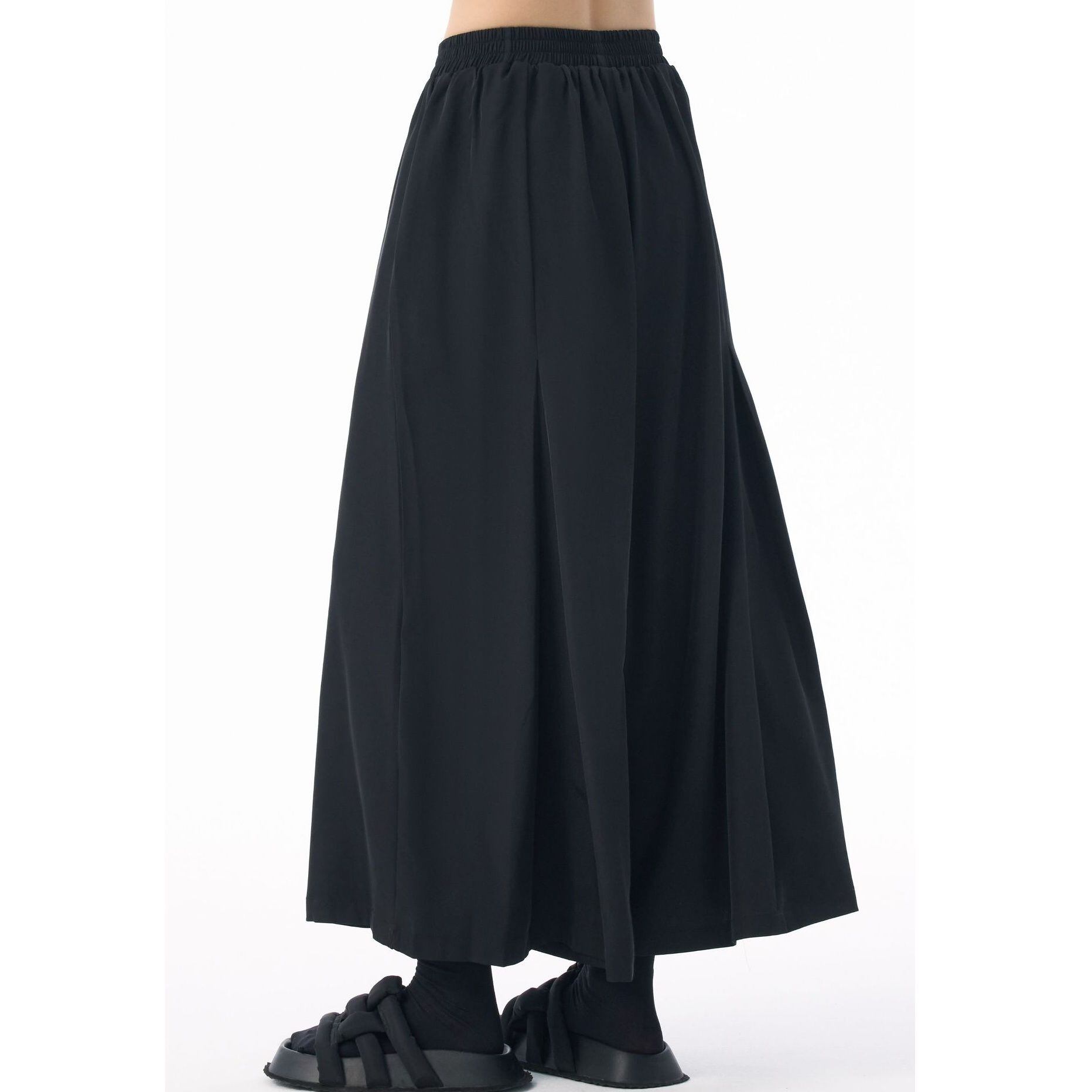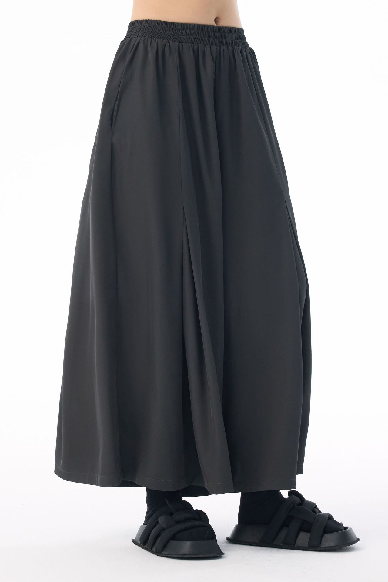 ボックスプリーツが作りだすAラインのシルエットが美しい、ワイドレッグ・クロップドパンツです。ウエストはゴムなので、着脱が簡単で履き心地が良いです。単色のシンプルなデザインで合わせやすい、着まわし力の高いアイテムです。ブラックとダークグレーの2色から選べます。
