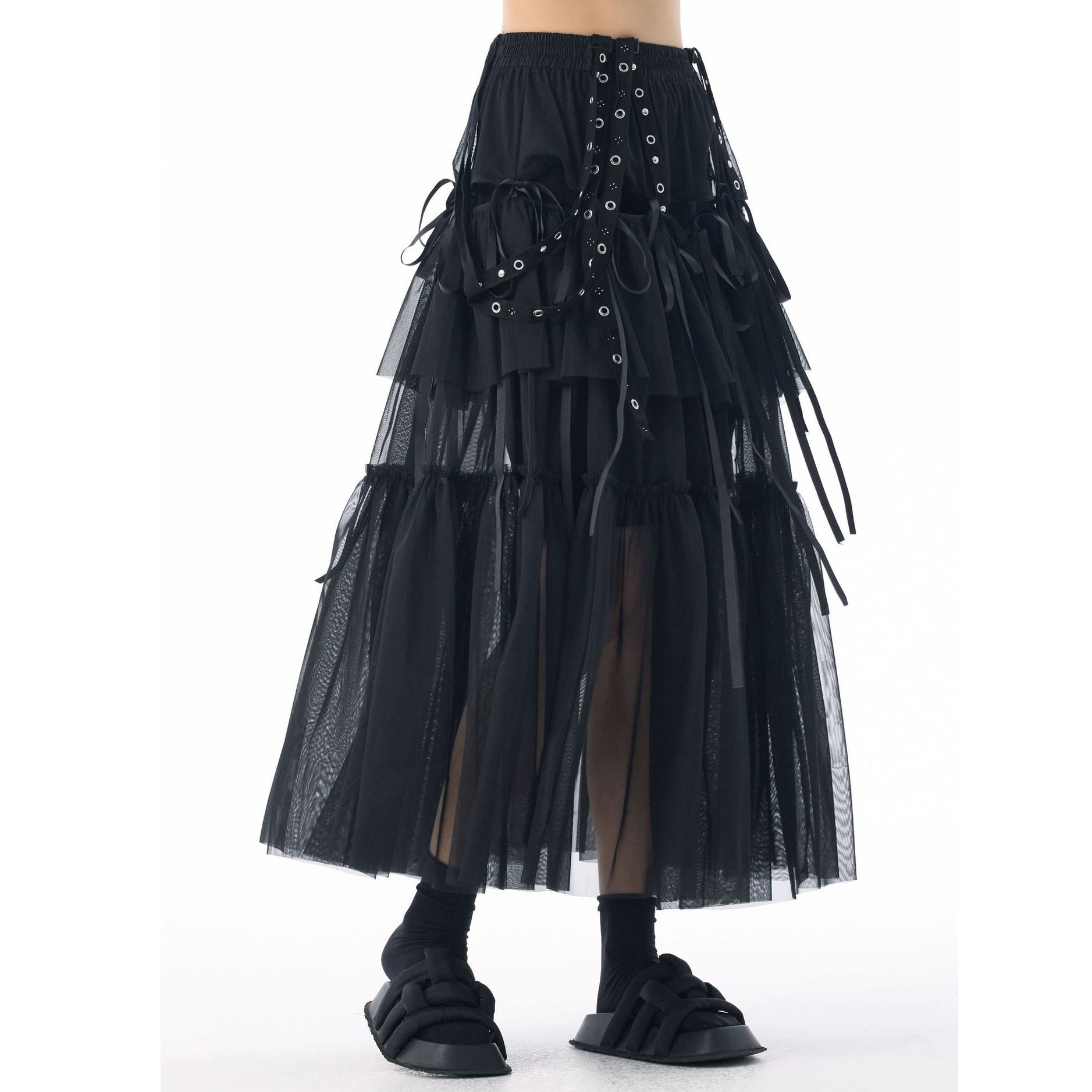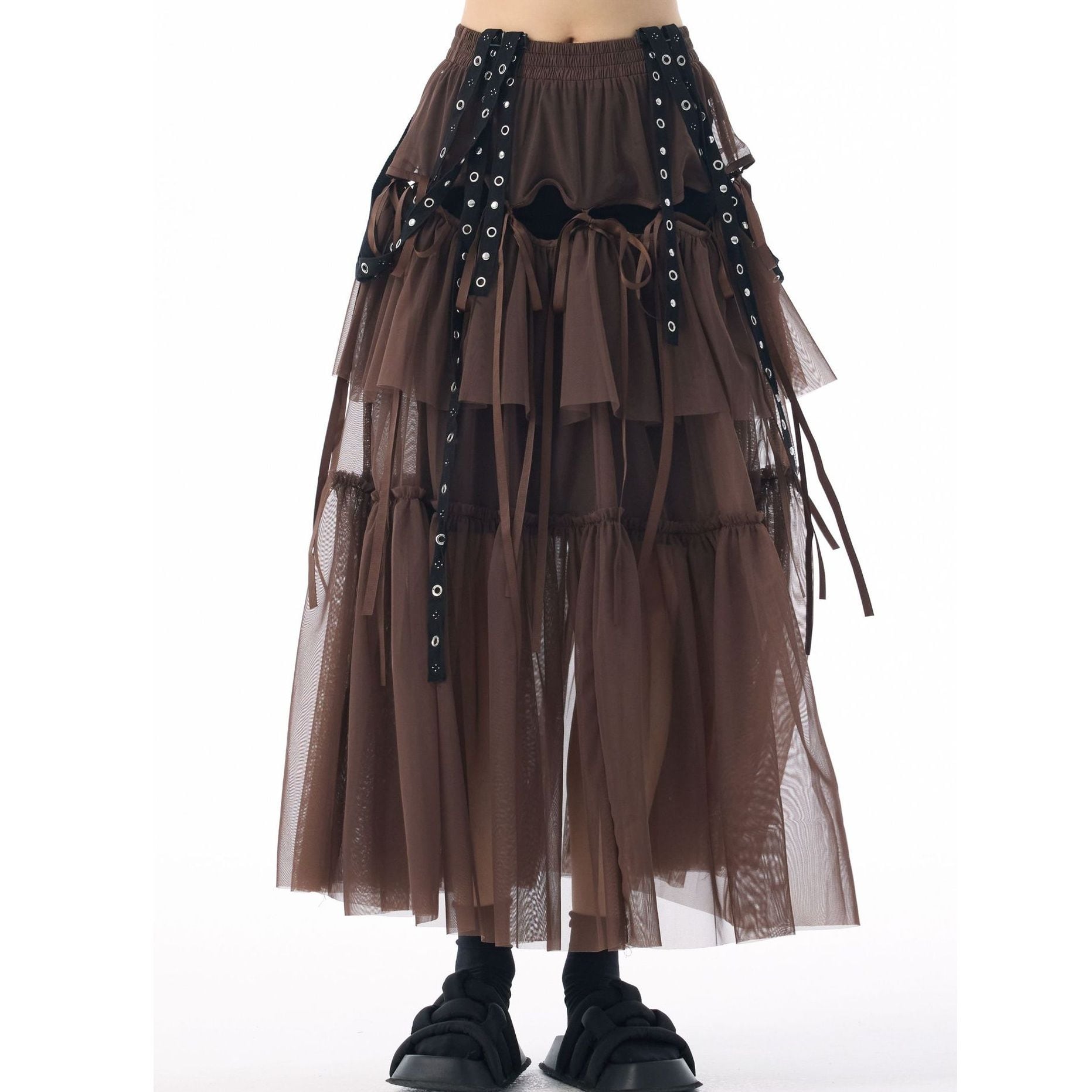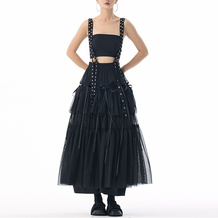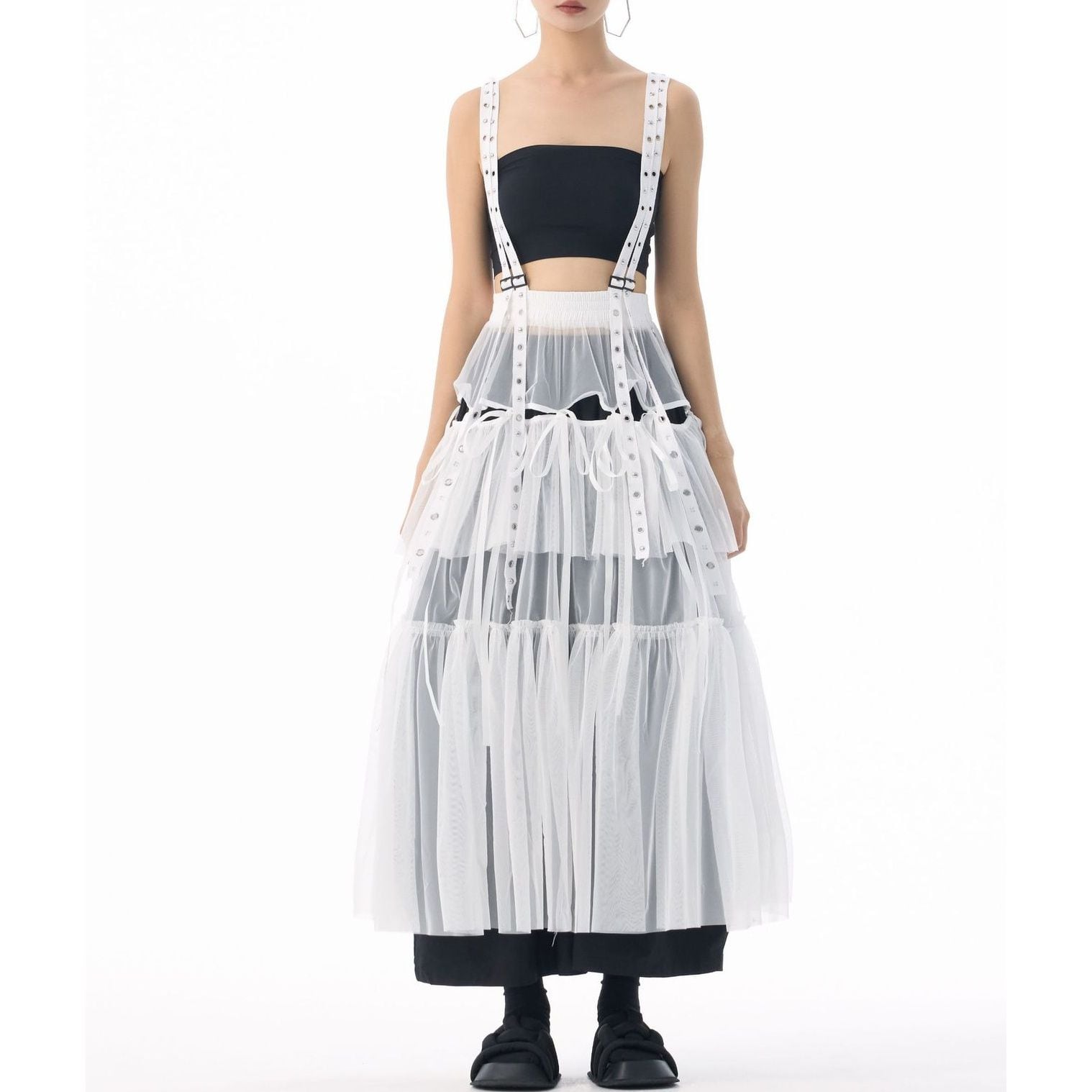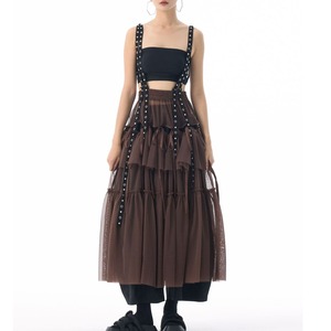 ハトメやスタッズの付いたダブルのサスペンダーが目を惹く、単色のメッシュ素材でできた膝下丈のデザインスカートです。フリルを重ねたようなティアードデザインで、ふんわりとしたAラインのシルエットやリボン飾りがスウィートな印象のアイテムです。色は3色から選べます。