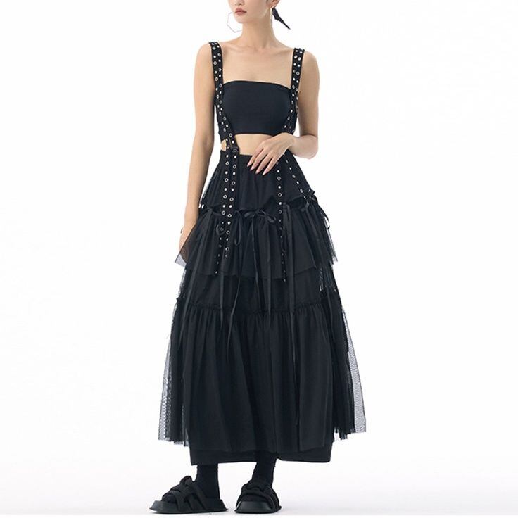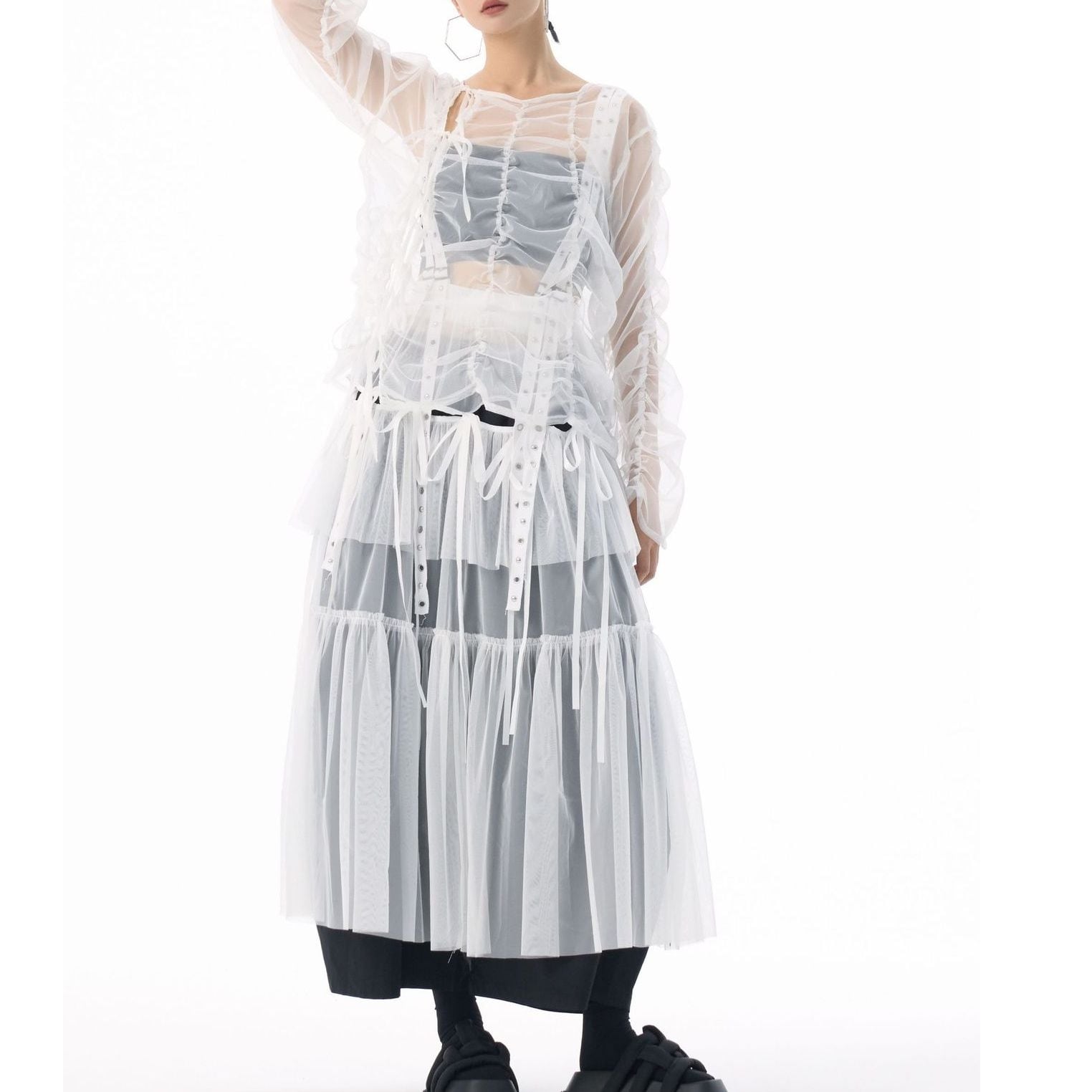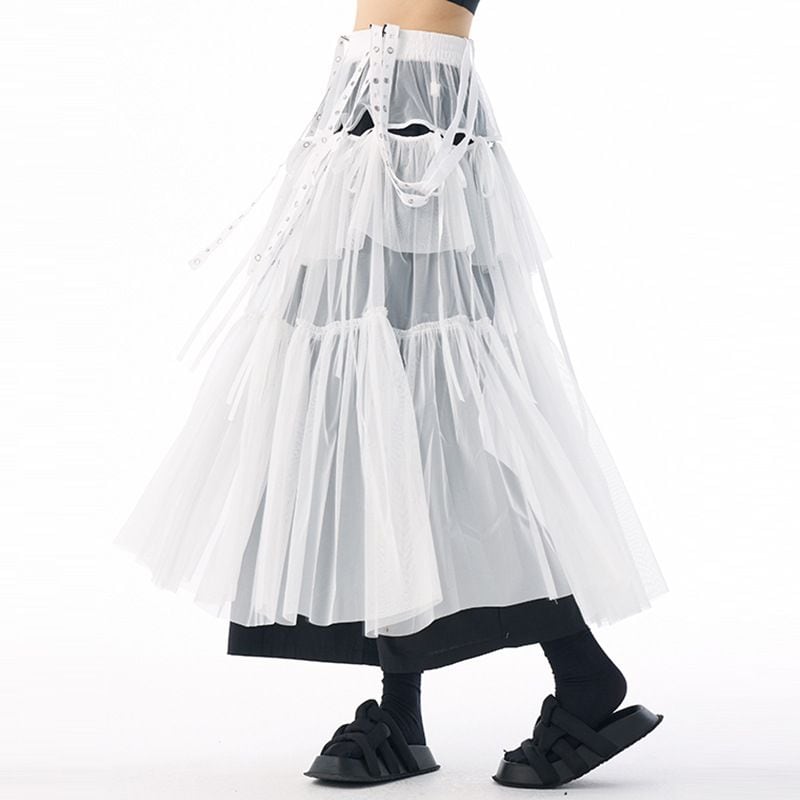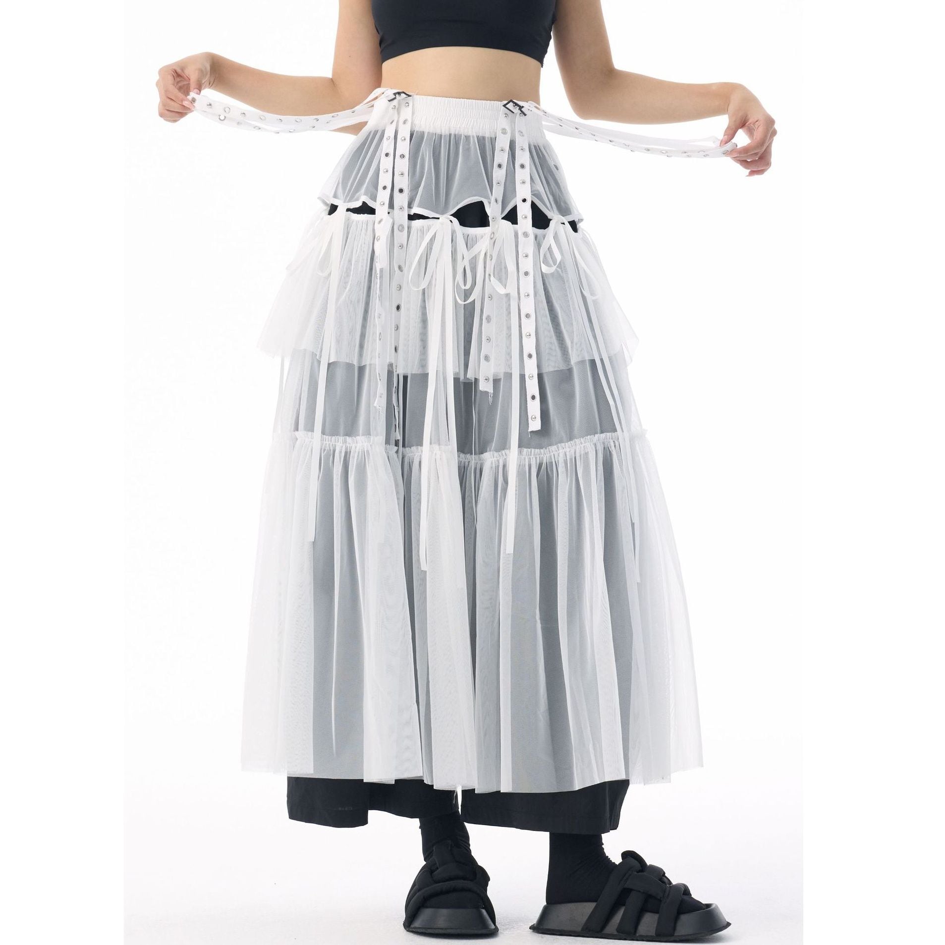 ハトメやスタッズの付いたダブルのサスペンダーが目を惹く、単色のメッシュ素材でできた膝下丈のデザインスカートです。フリルを重ねたようなティアードデザインで、ふんわりとしたAラインのシルエットやリボン飾りがスウィートな印象のアイテムです。色は3色から選べます。