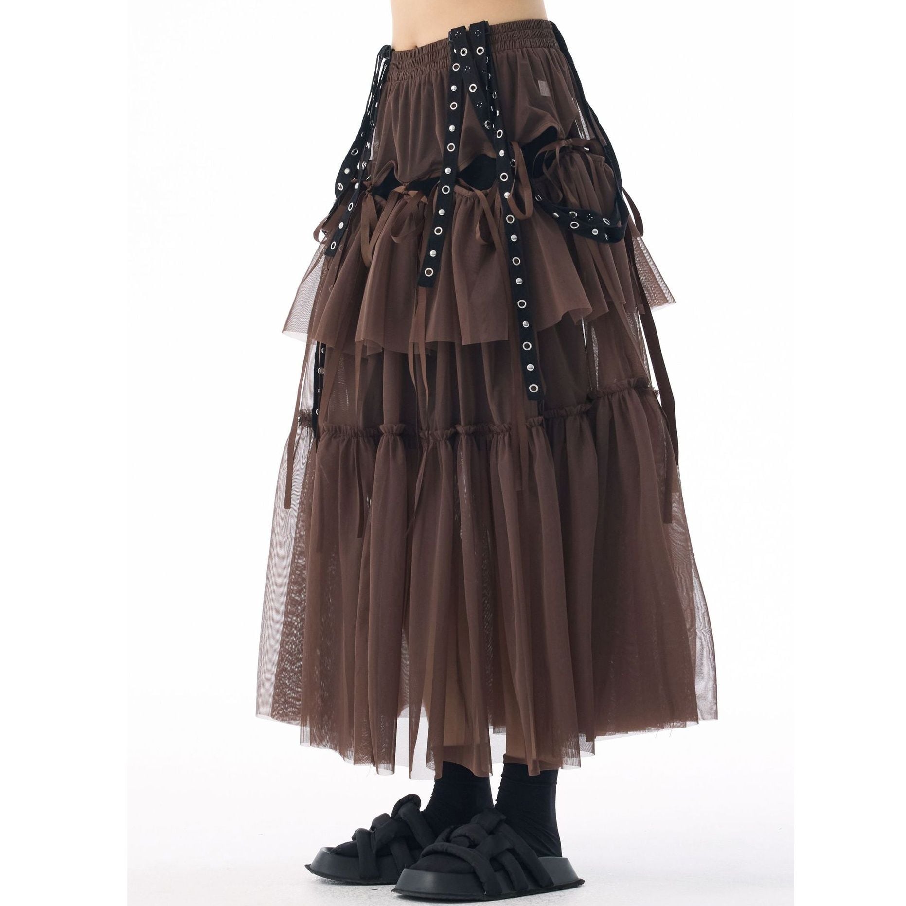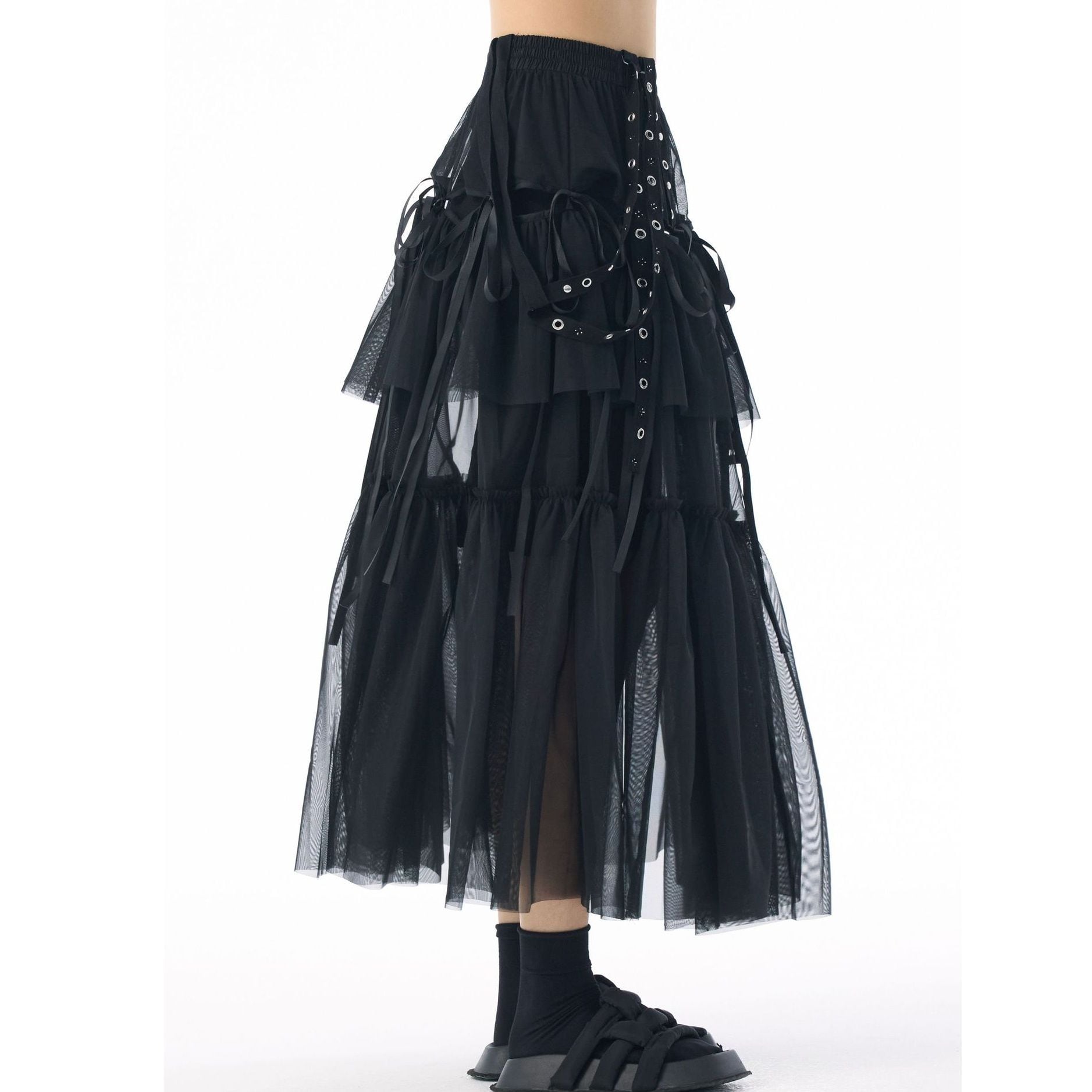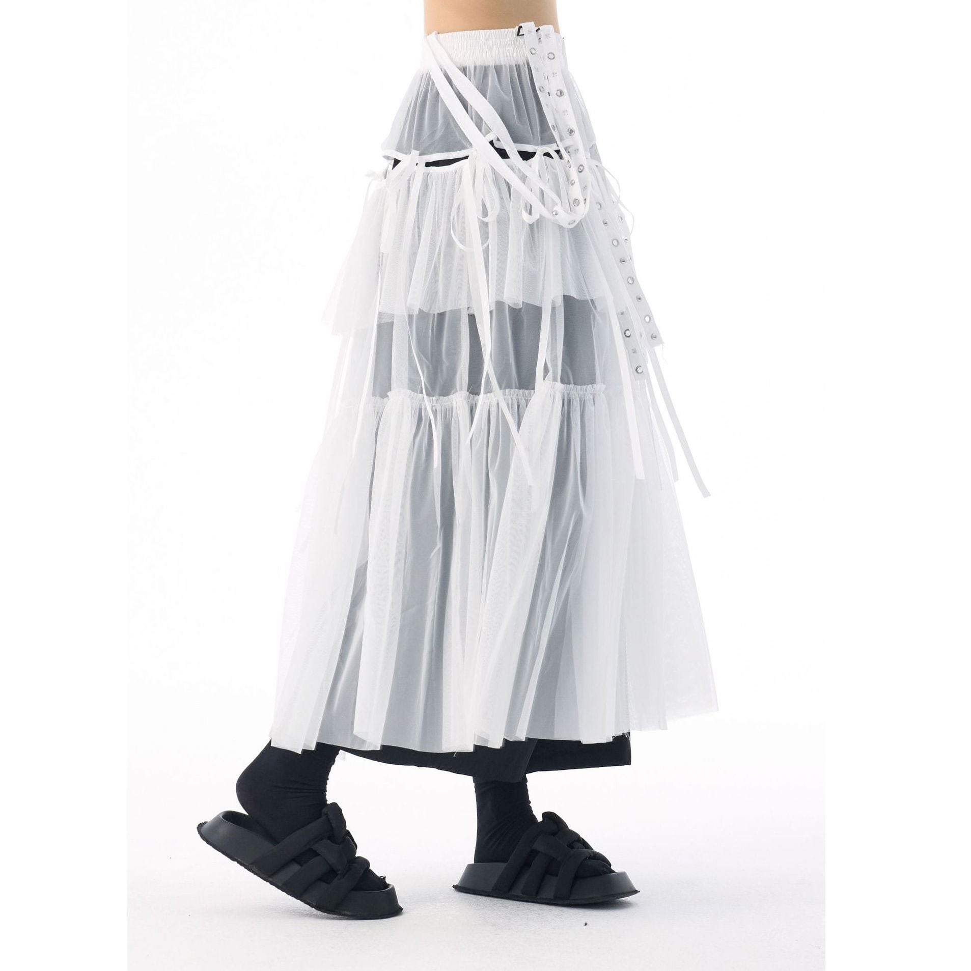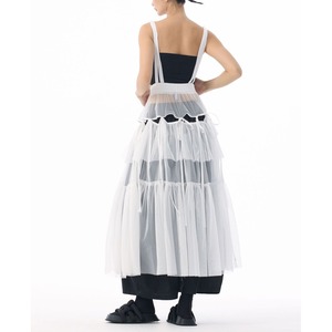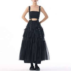 MESH TIERED A-LINE SUSPENDERED LONG DESIGN SKIRT 3colors M-15280