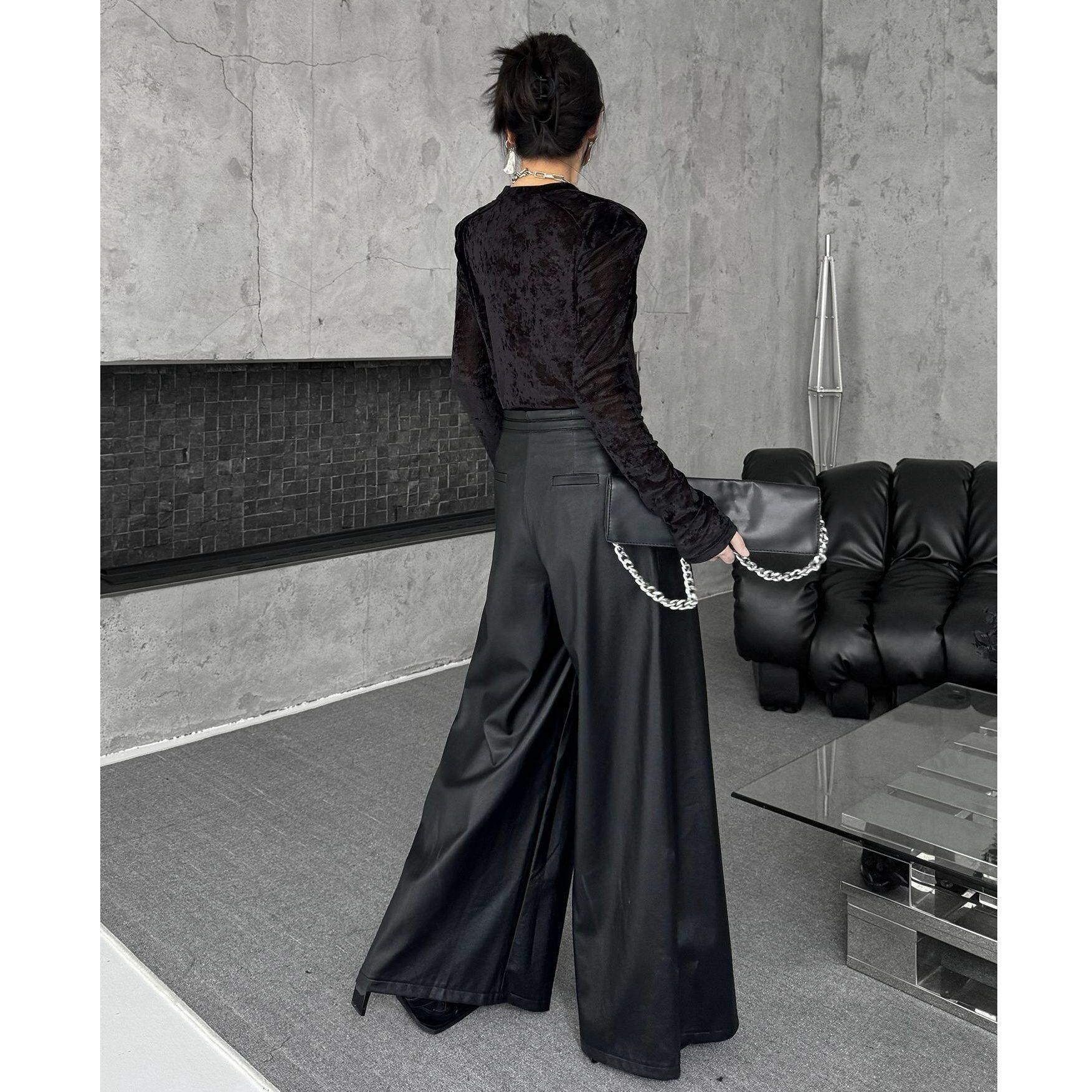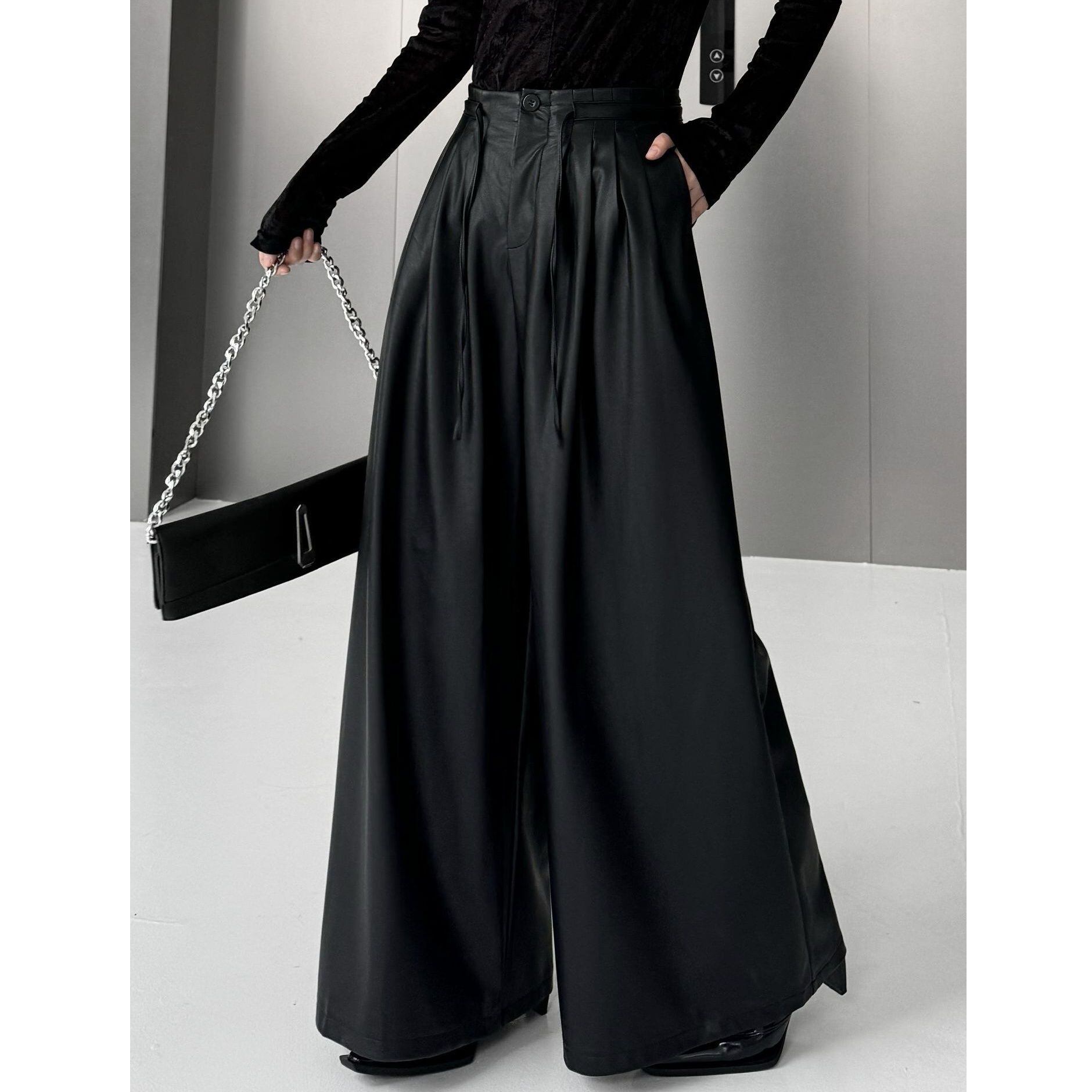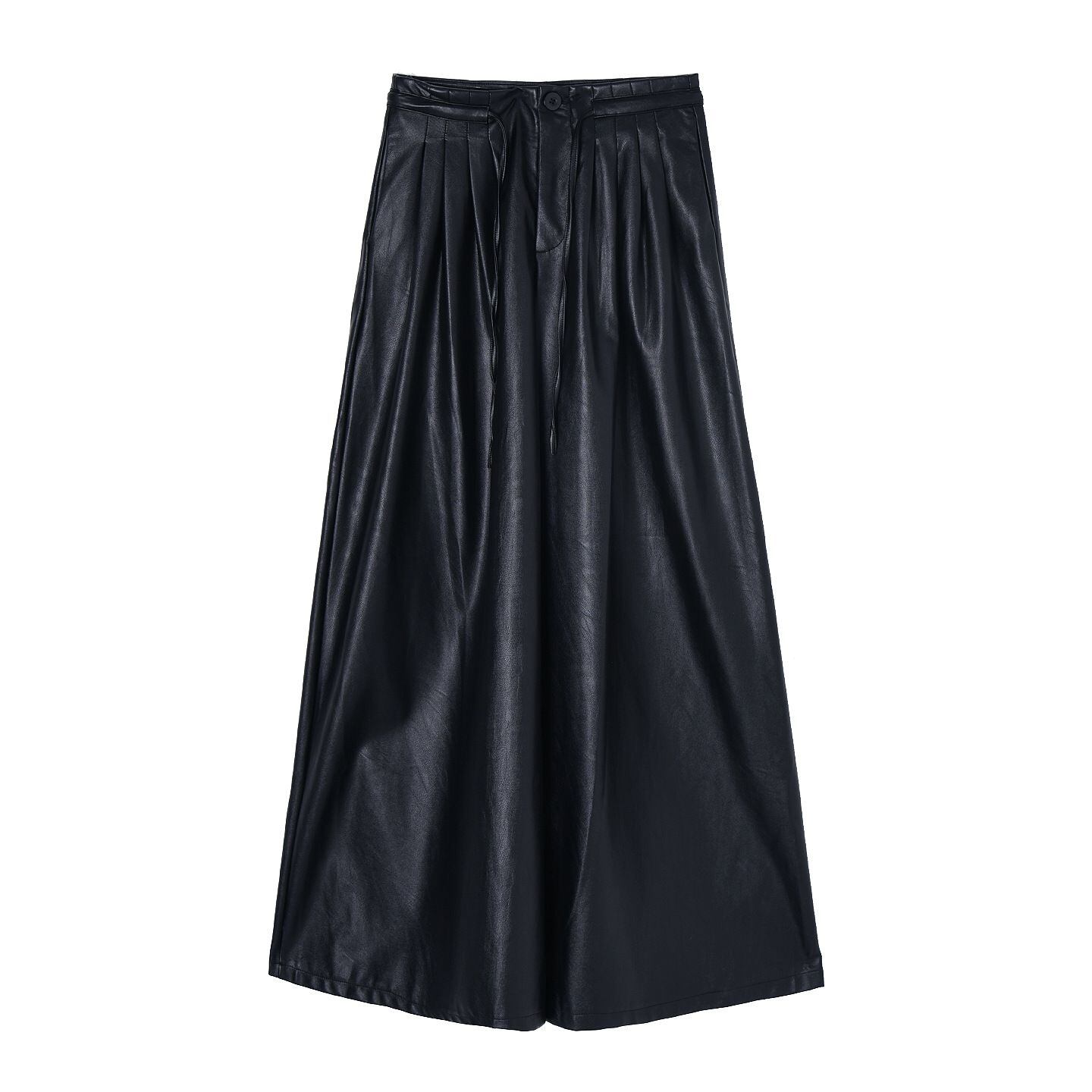 BLACK PU LEATHER A-LINE WIDE LEG PANTS 1color M-15283