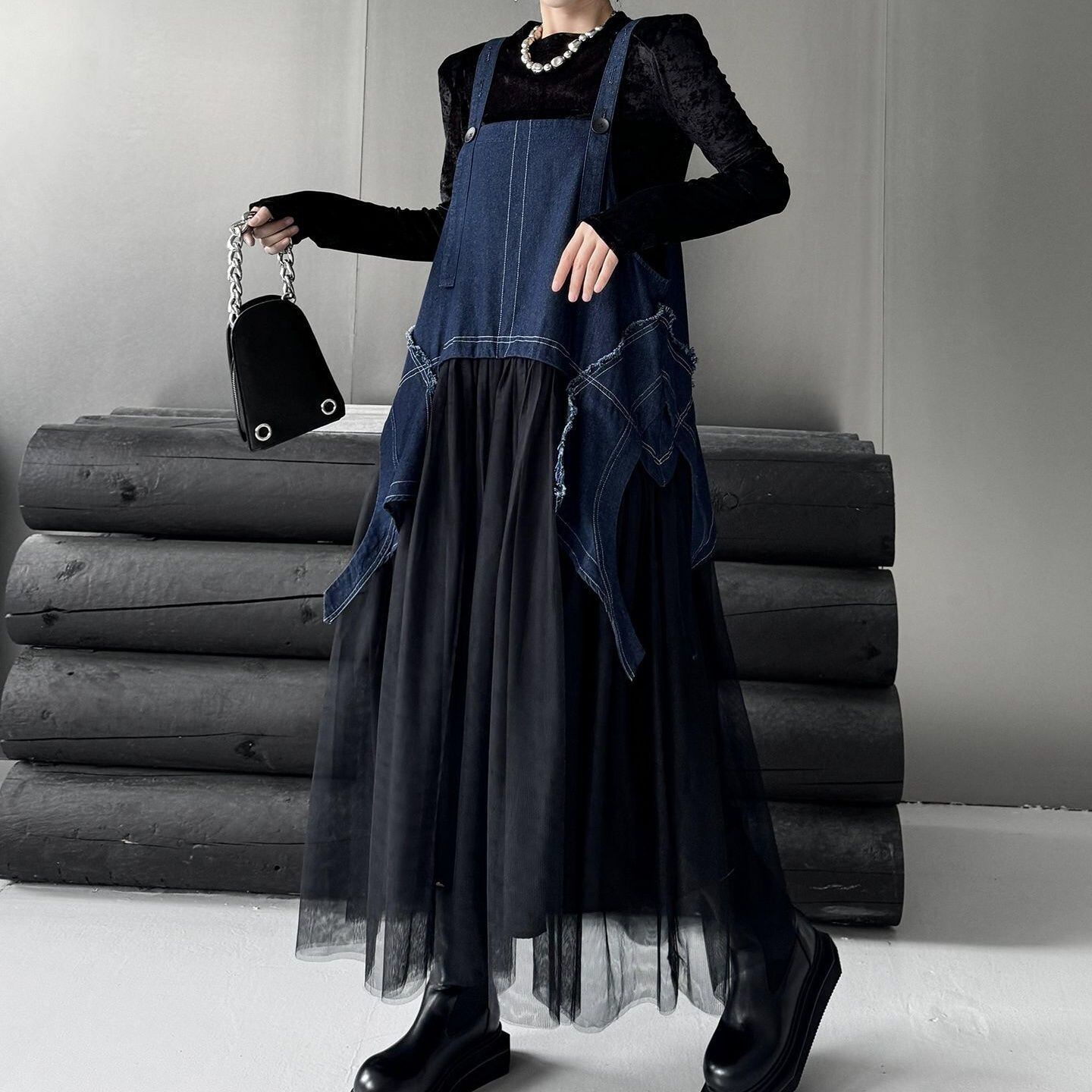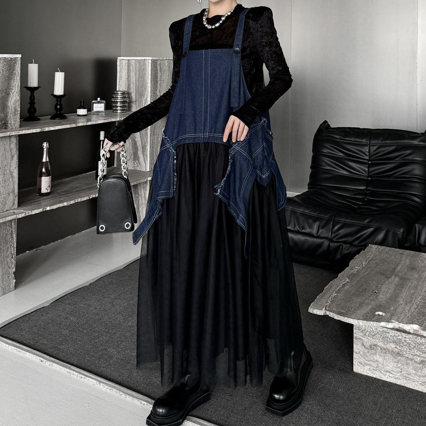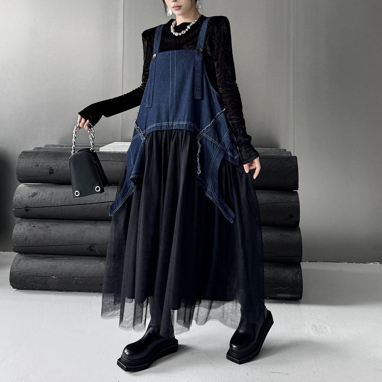 DENIM STITCH MESH LAYERED A-LINE LONG JUMPER DRESS 2colors M-15284