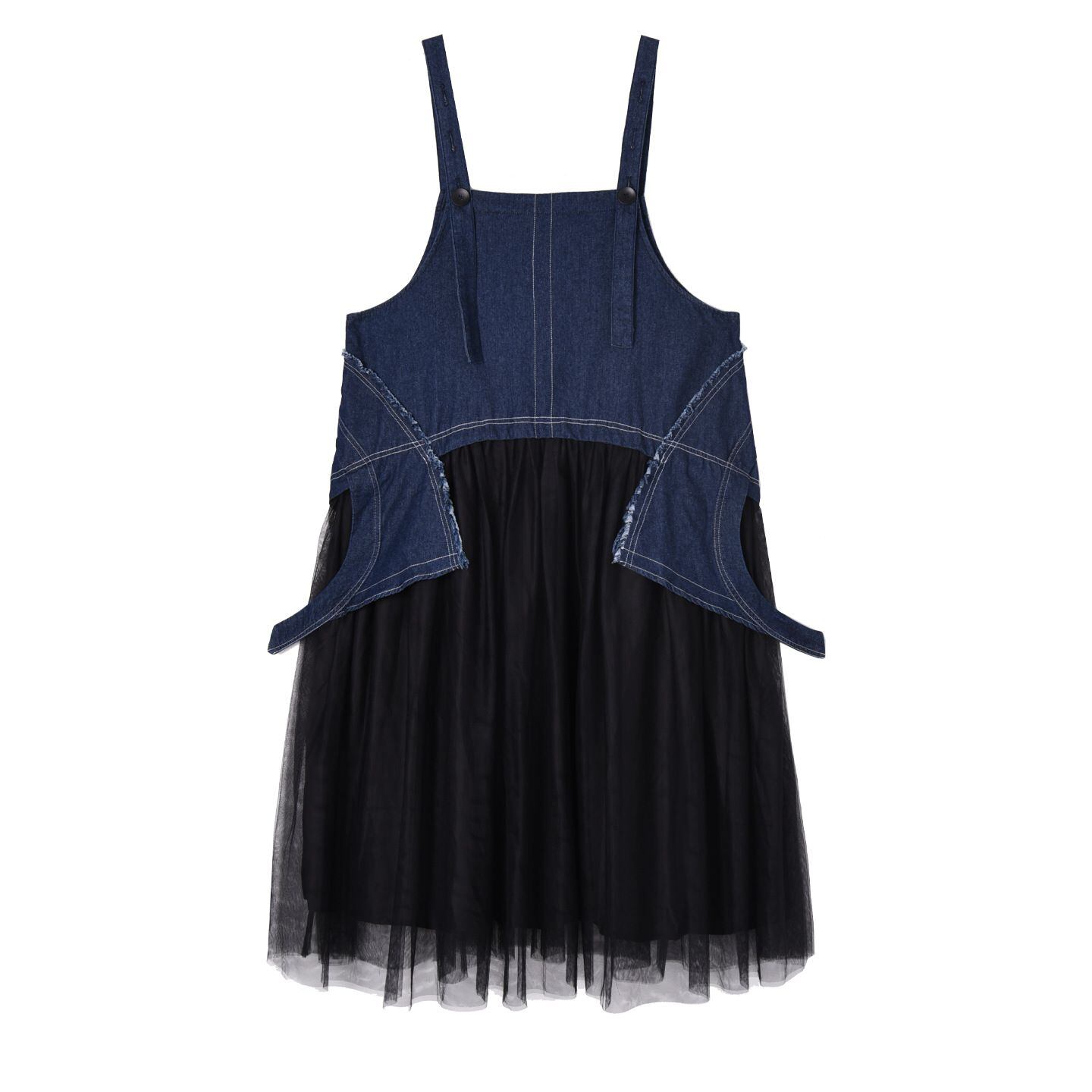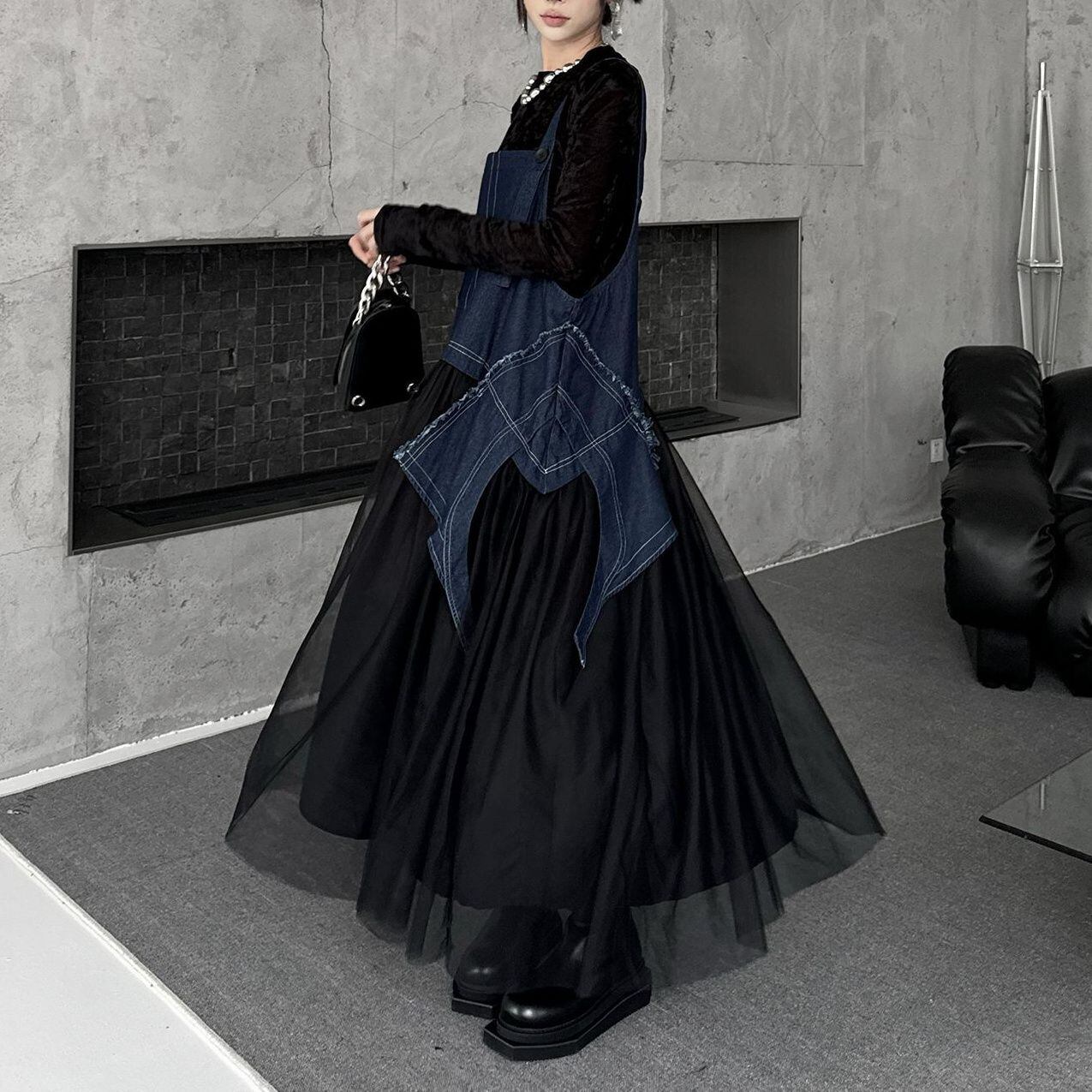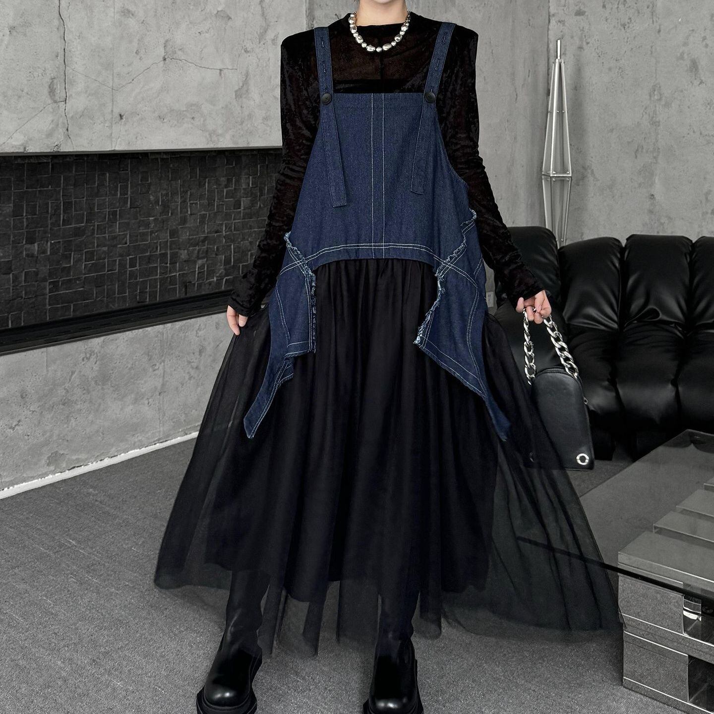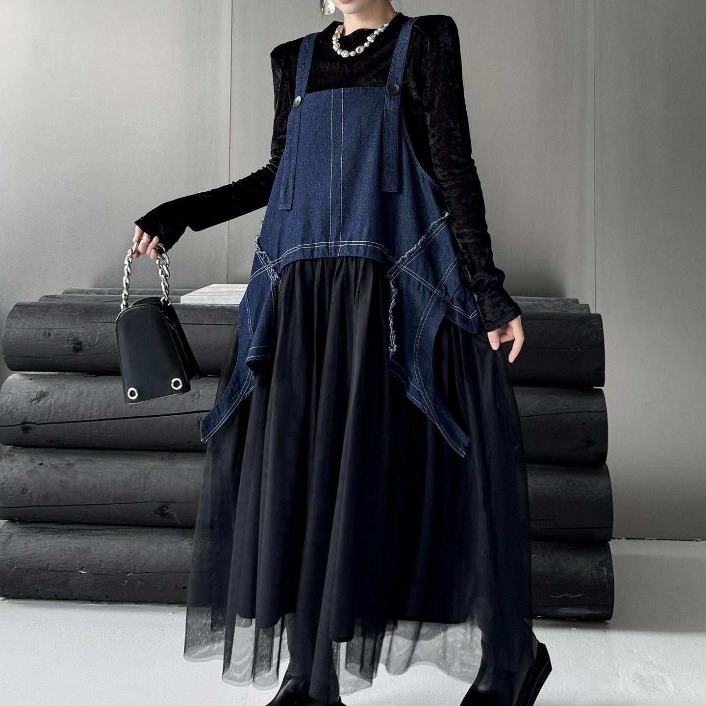 DENIM STITCH MESH LAYERED A-LINE LONG JUMPER DRESS 2colors M-15284