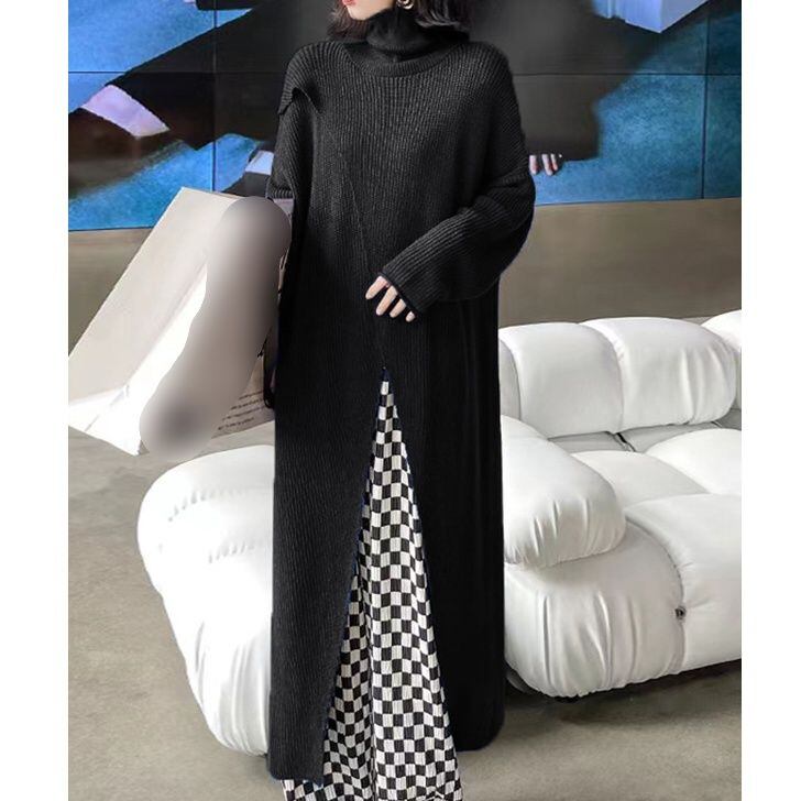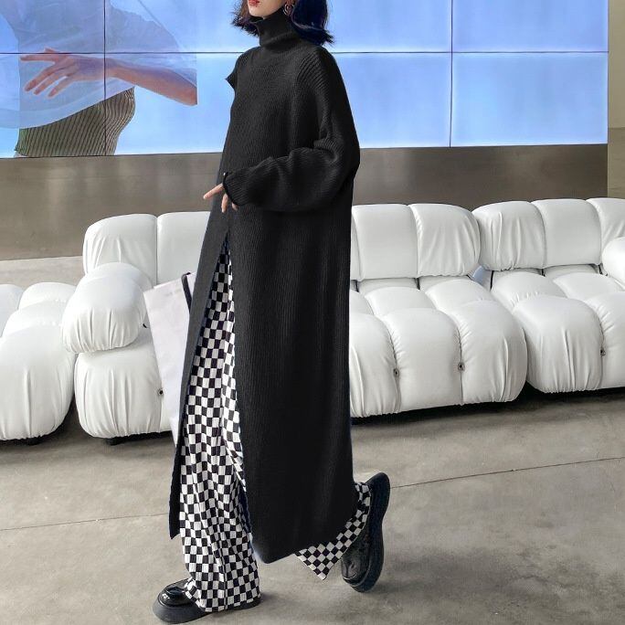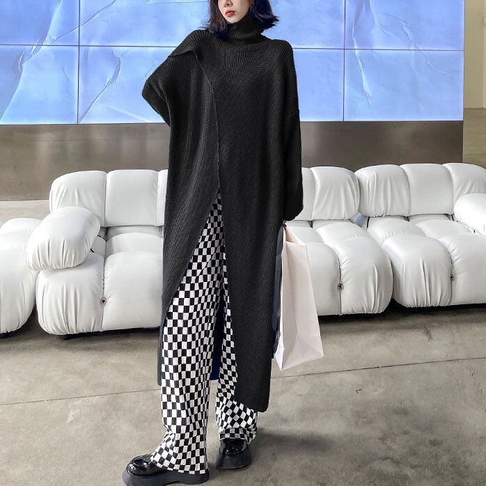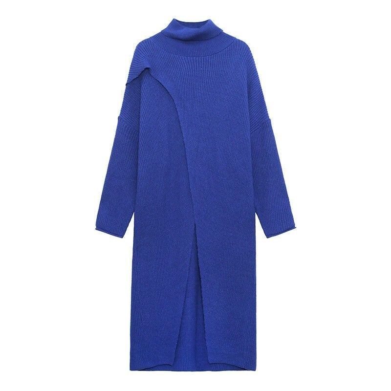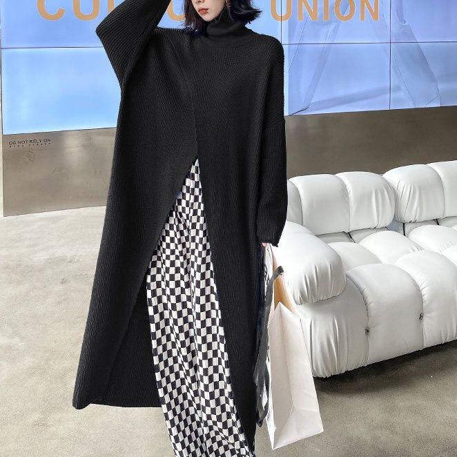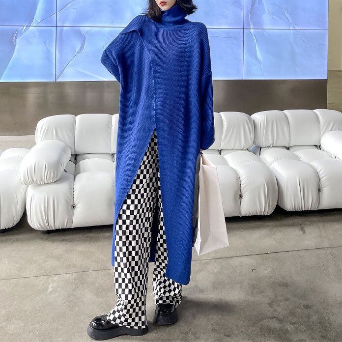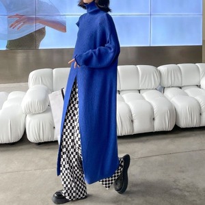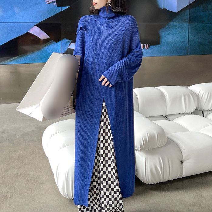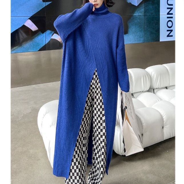 フロントの深いスリットがクールな、タートルネック・長袖・ロング丈のプルオーバーニットです。単色リブニットのシンプルなデザインで、シルエットが際立つアイテムです。ブラックとブルーの2色から選べます。