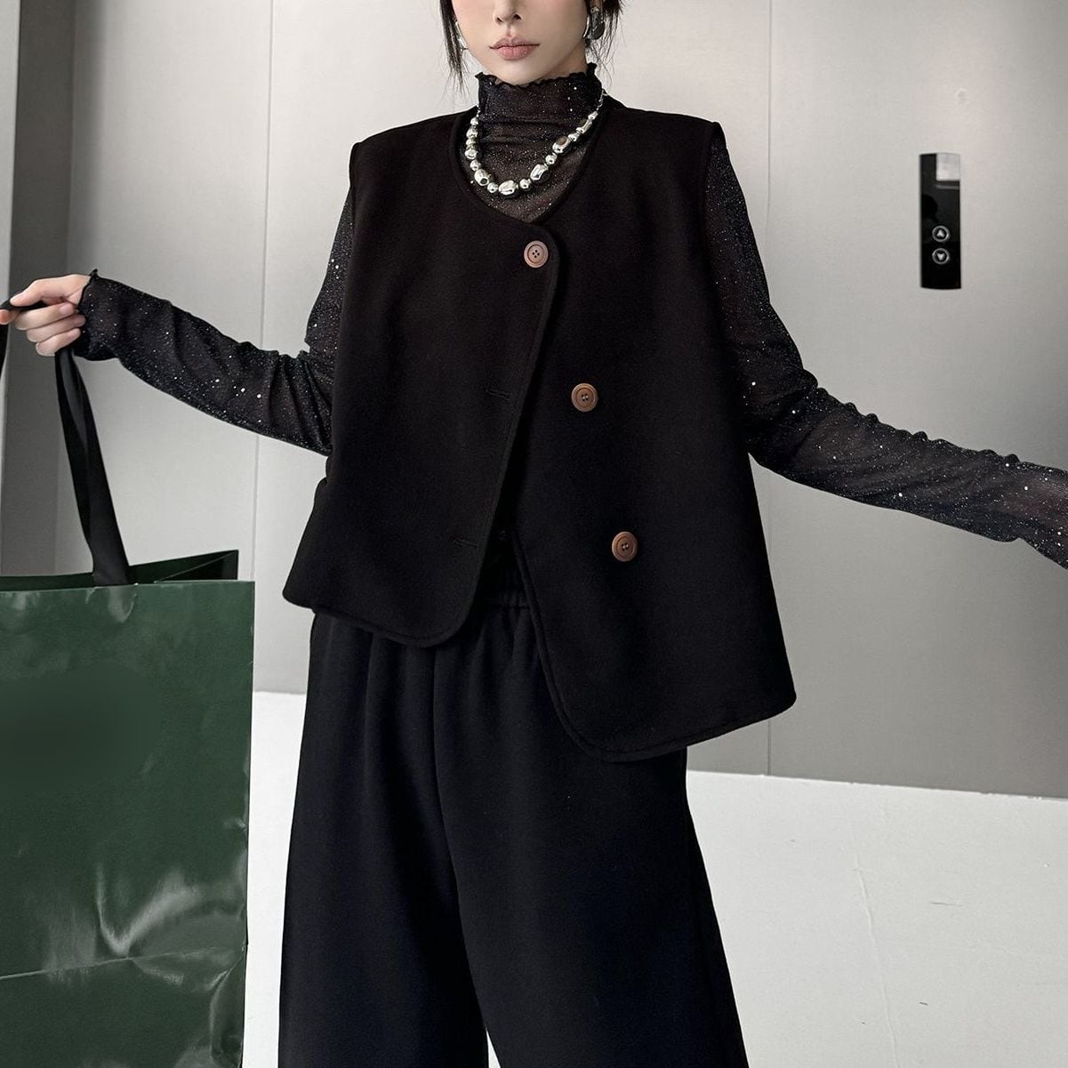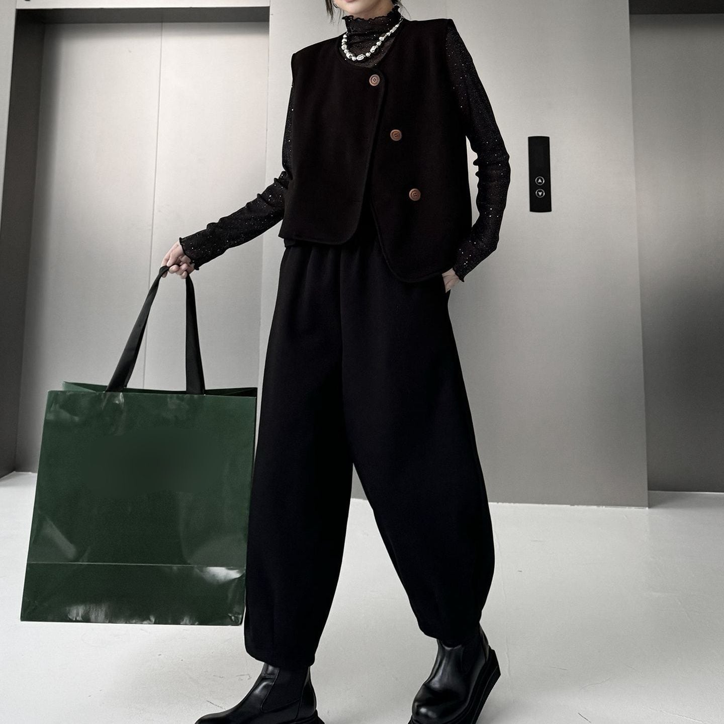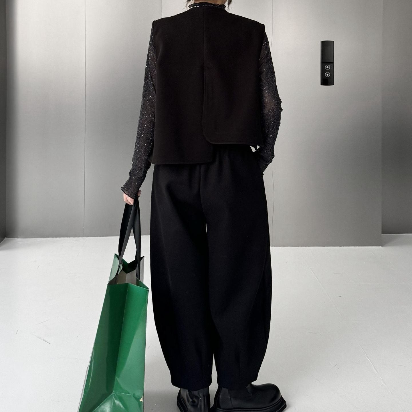BLACK ASYMMETRIC DESIGN VEST & CROPPED PANTS 1color M-15297
