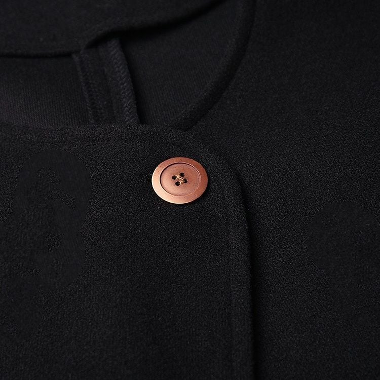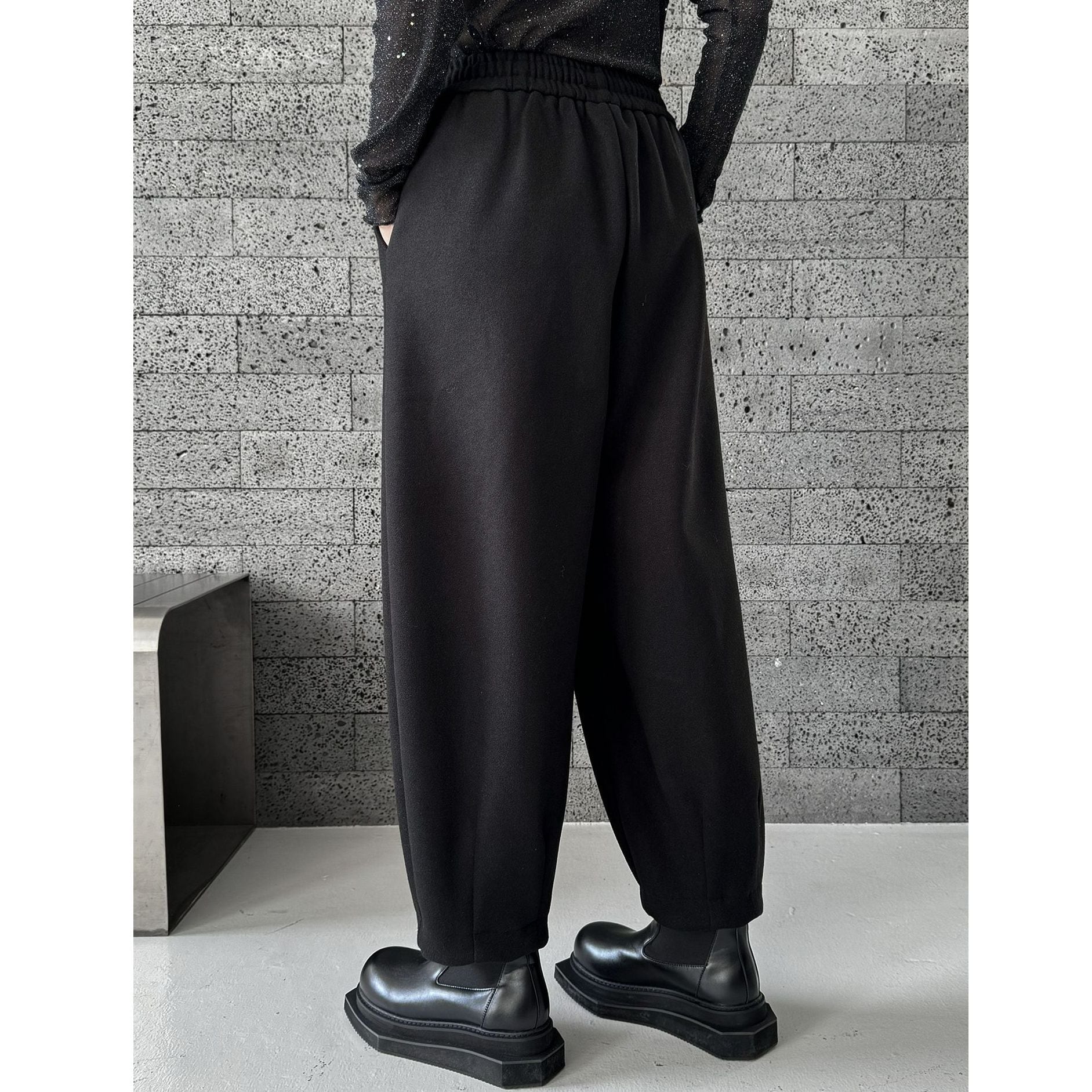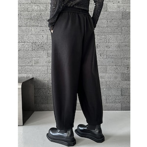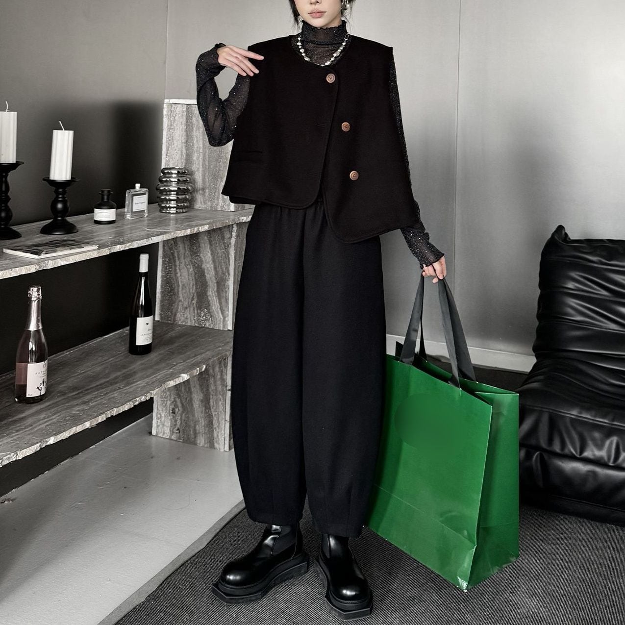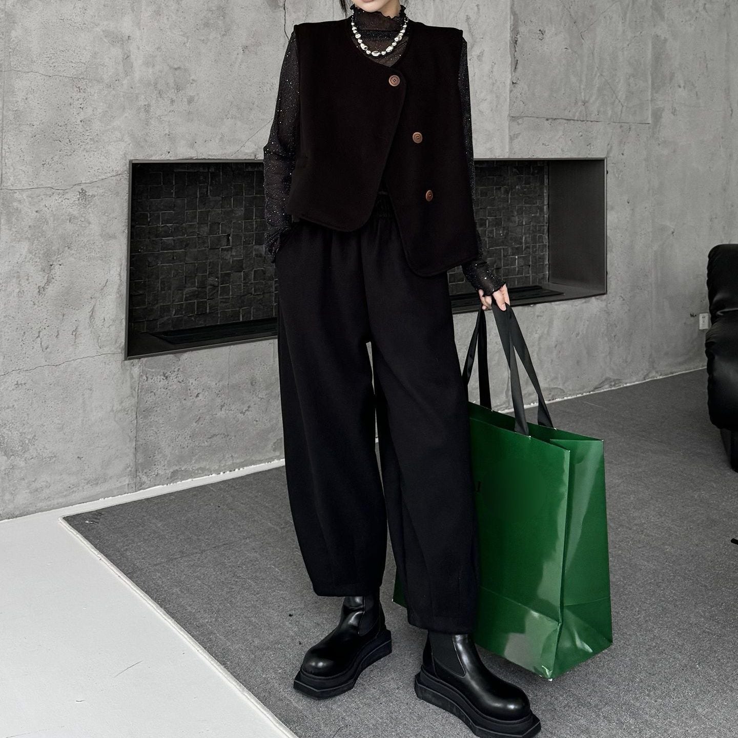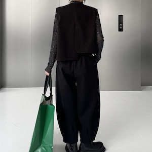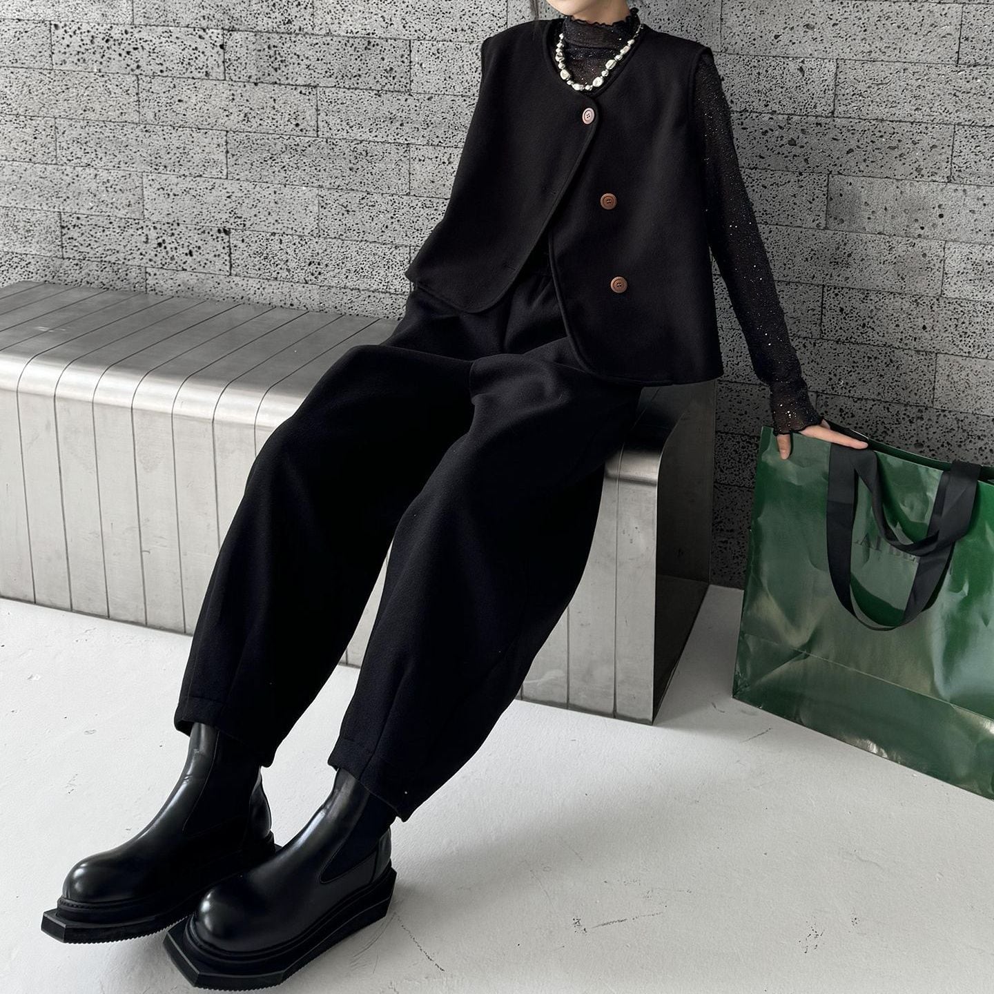 ブラックのウールのような素材が上品な、デザインベストとクロップドパンツのセットアップです。ベストは、大きなボタンがアクセントになった、アシンメトリックなシルエットがお洒落なアイテムです。パンツはウエストがドローストリングで履き心地が良く、バルーンのようなシルエットがキュートなアイテムです。