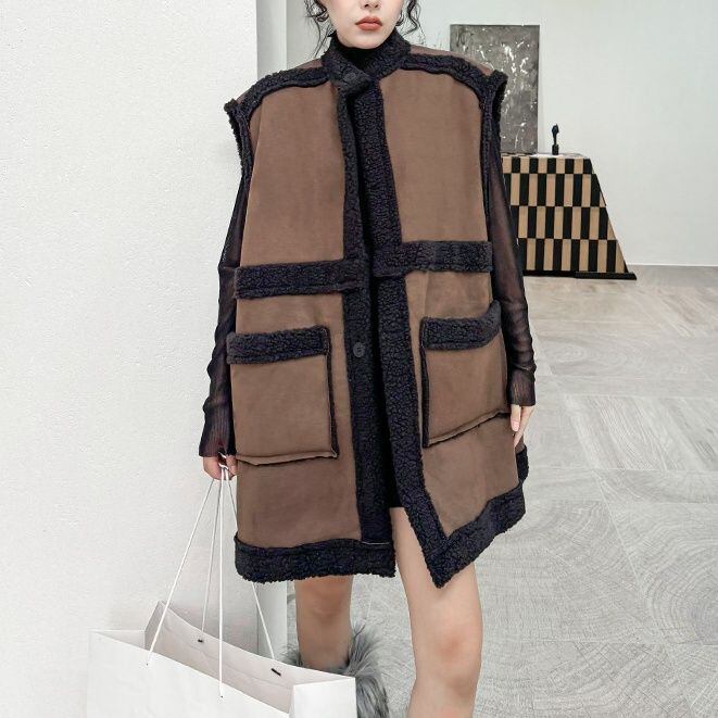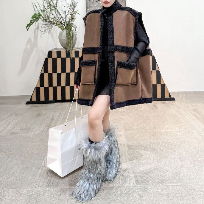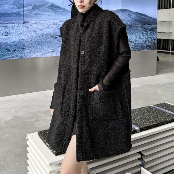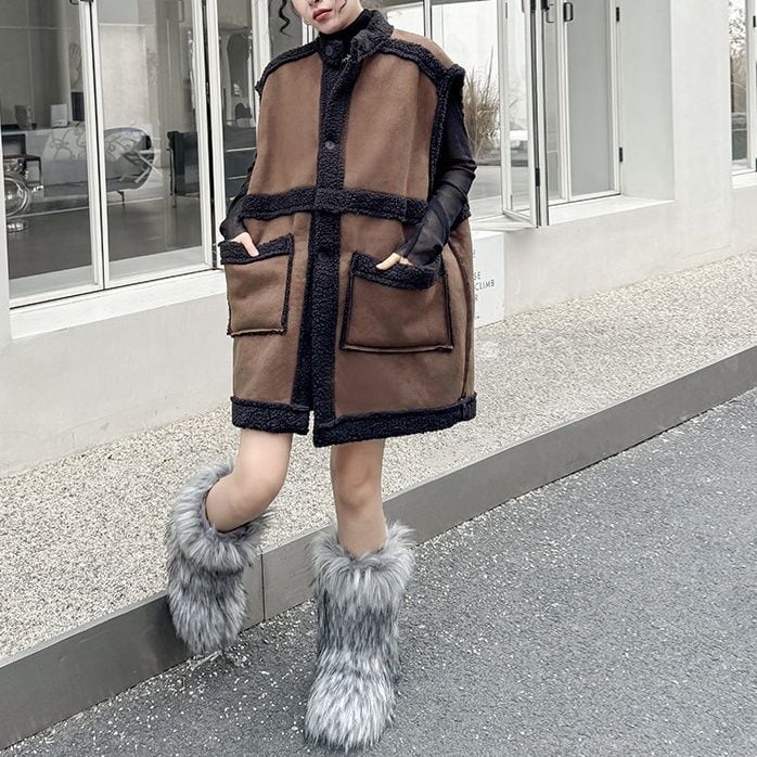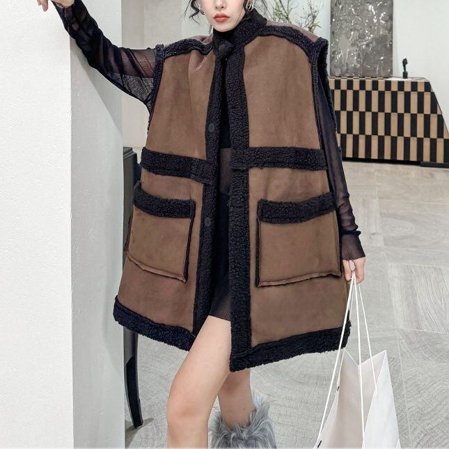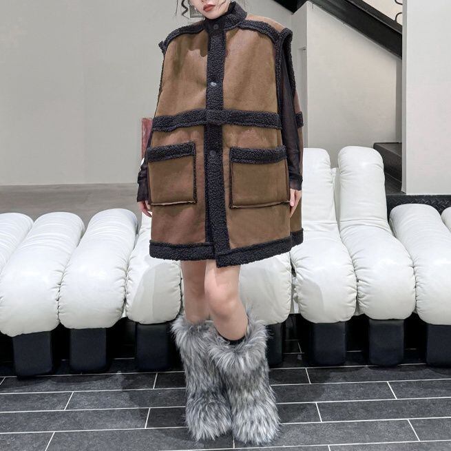 スウェードとボア素材のリバーシブルデザインが嬉しい、スタンドカラー・ノースリーブ・ミドル丈のベストコートです。ゆったりとしたシルエットで重ね着しやすい、着まわし力の高いカジュアルアイテムです。