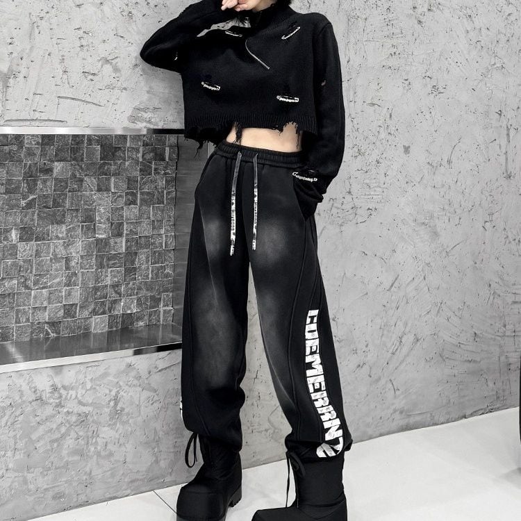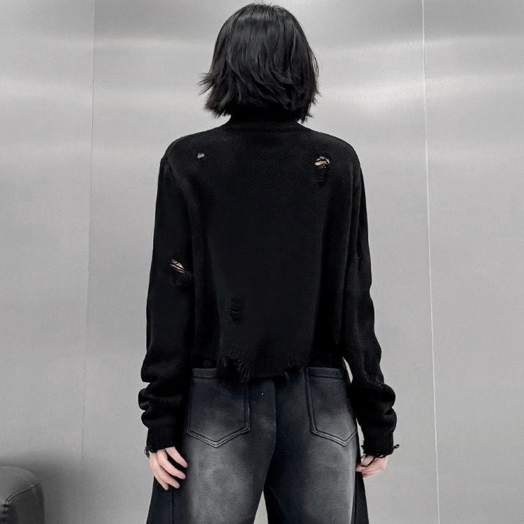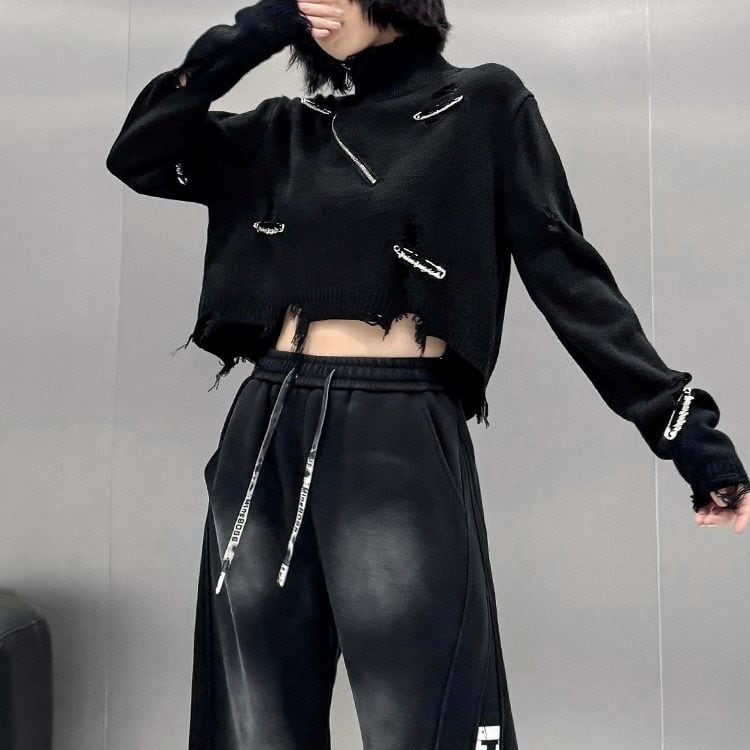 曲線のハーフジップに安全ピンの飾りやダメージ加工がクールな、ハイネック・長袖・ショート丈のプルオーバーニットです。短い丈と対照的な長さのある袖やワイド幅のシルエットが魅力的な、コーディネートのアクセントになるカジュアルアイテムです。