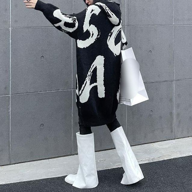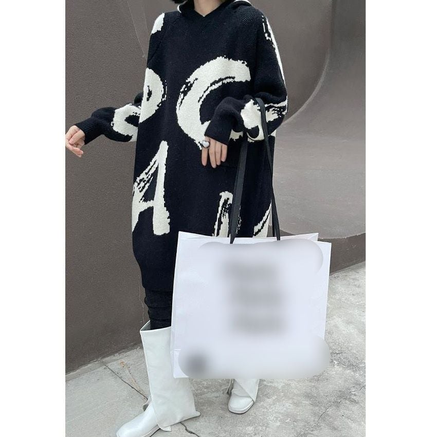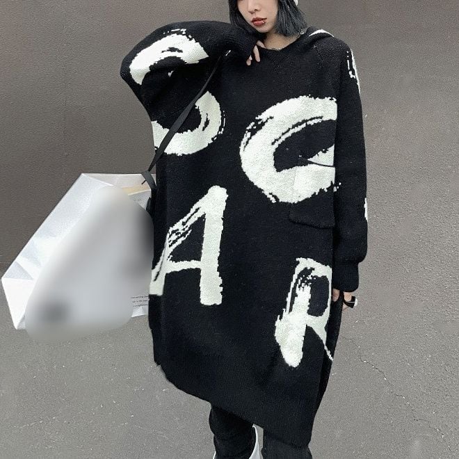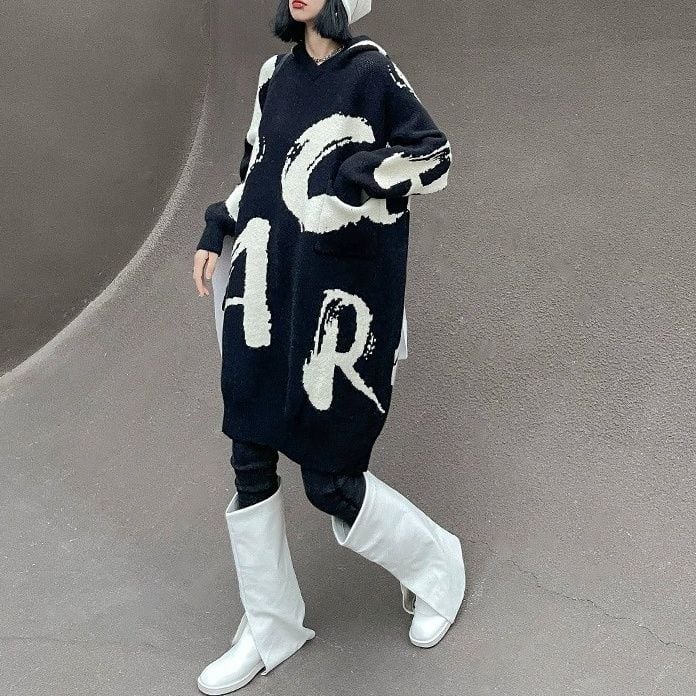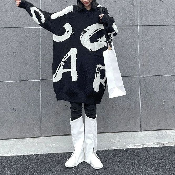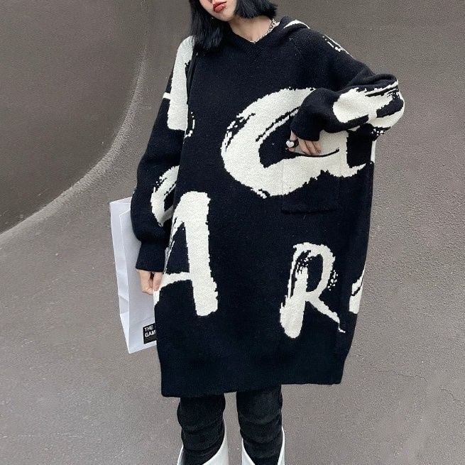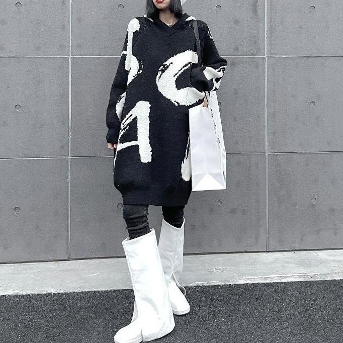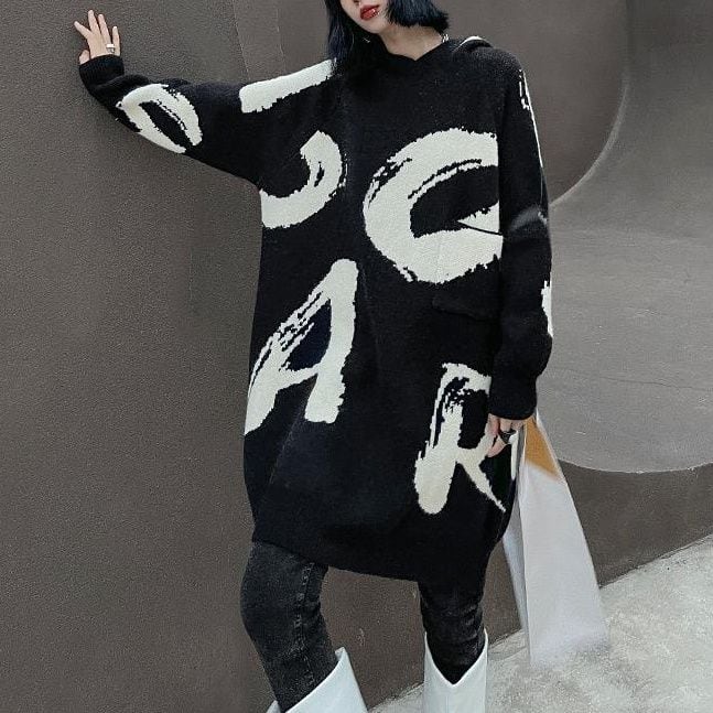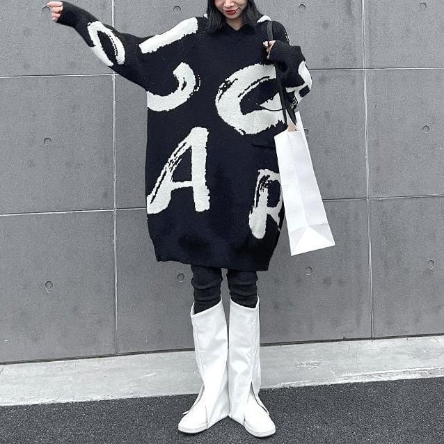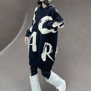大きなアルファベットのプリントが目を惹く、フード付き・長袖・ミニ丈のプルオーバー・ニットワンピースです。ゆったりとしたオーバーサイズのシルエットがリラックスした雰囲気の、モノトーンで合わせやすいカジュアルアイテムです。