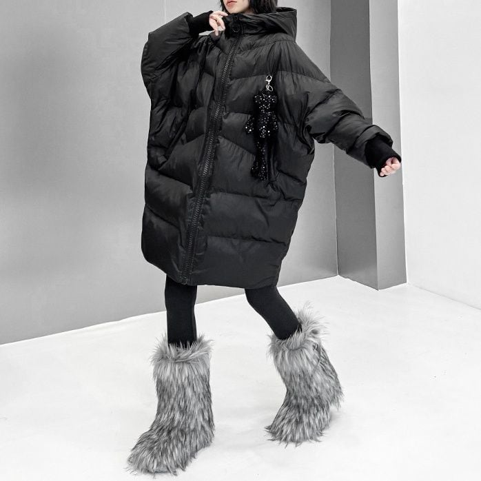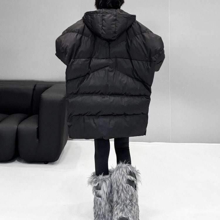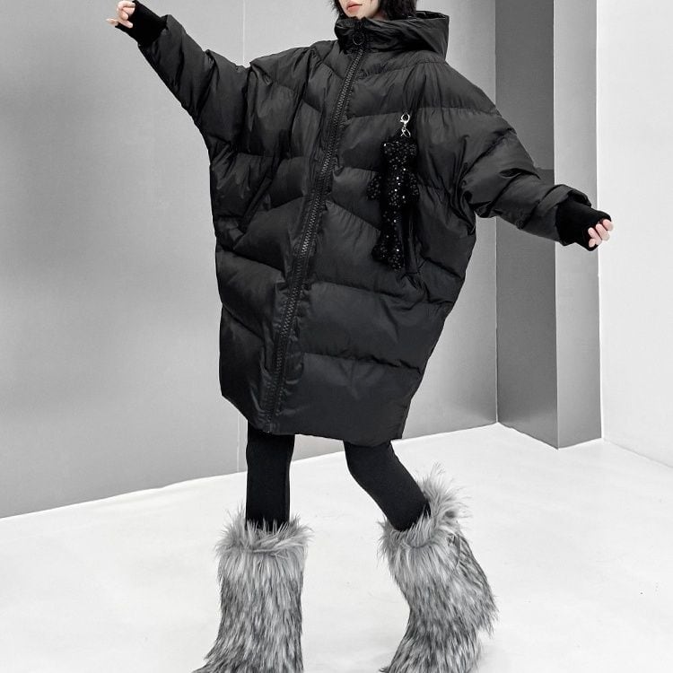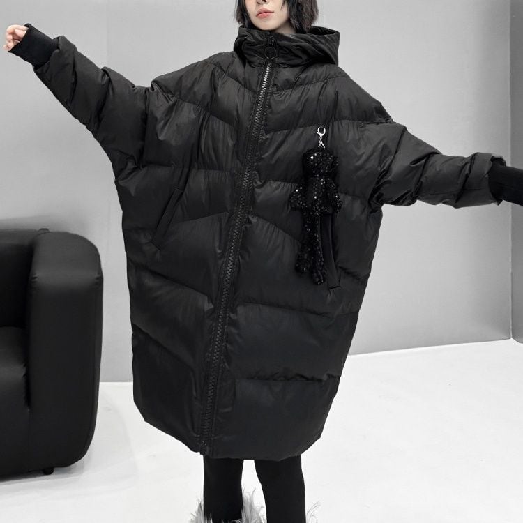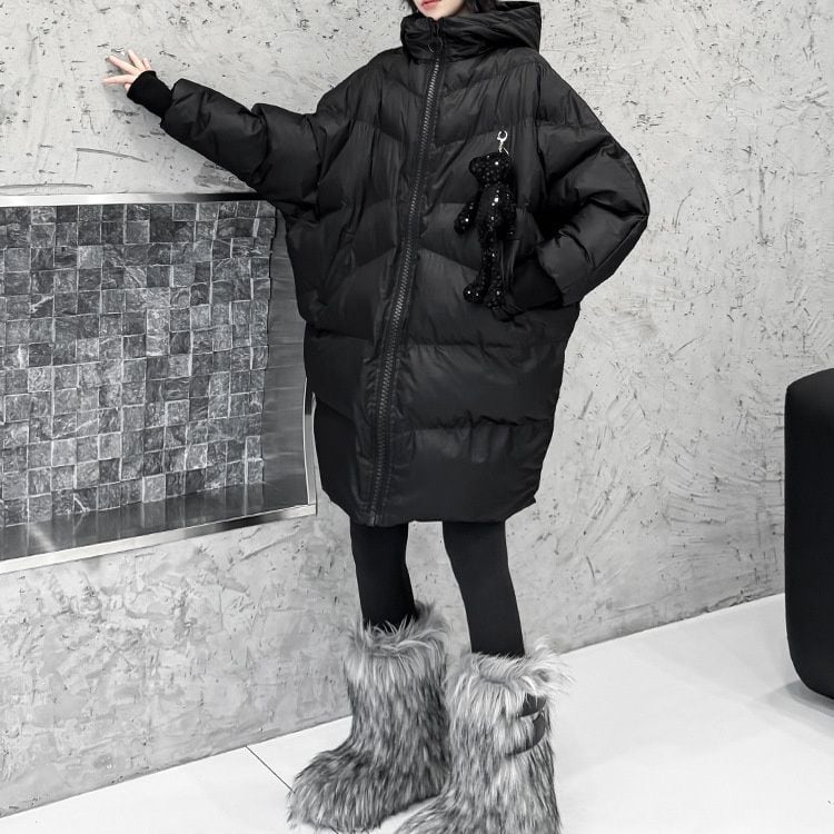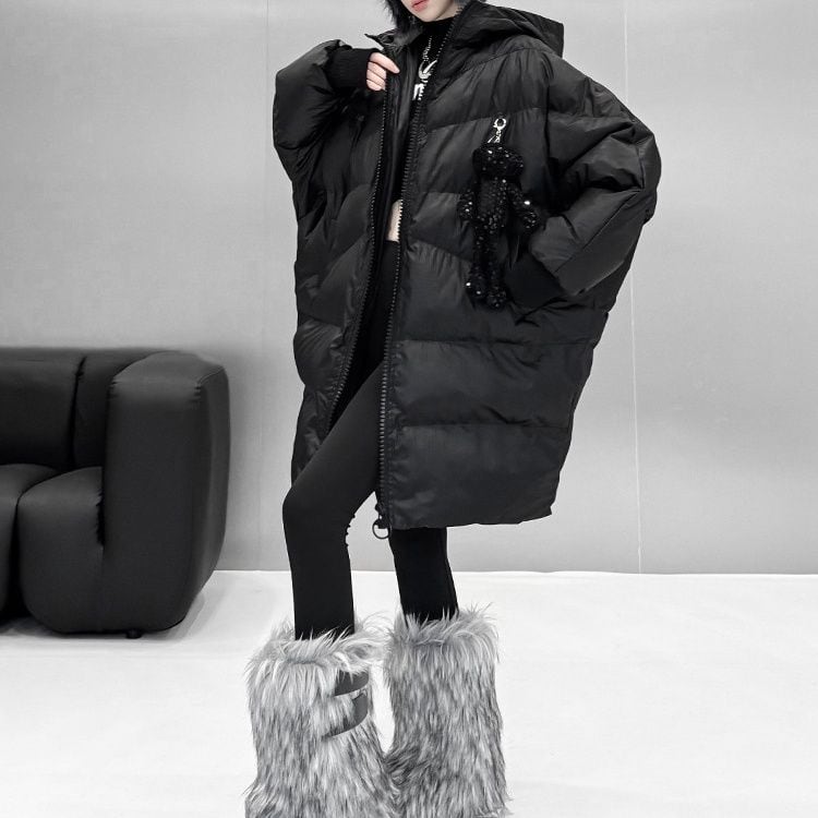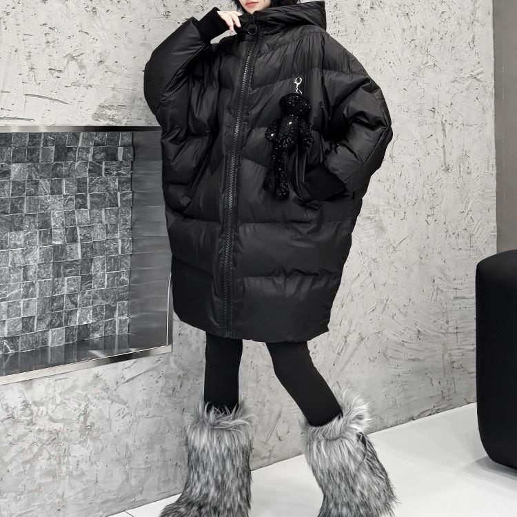左胸のドールがキュートな、フード付き・長袖・ミドル丈のフルジップ・中綿コートです。コクーンのようなシルエットが特徴的な、ブラックの単色で何にでも合わせやすい防寒アイテムです。