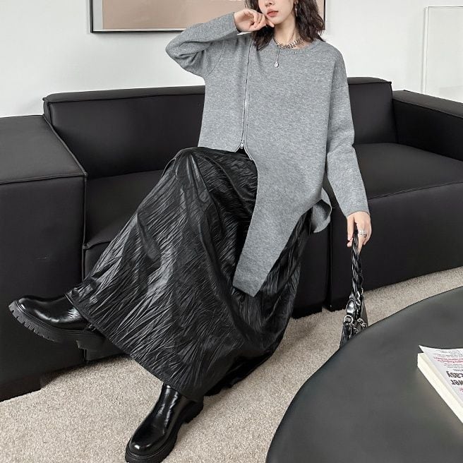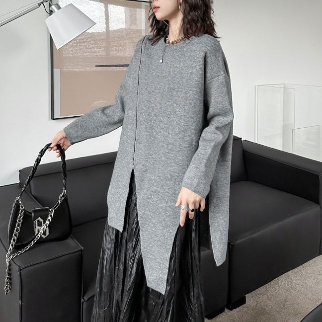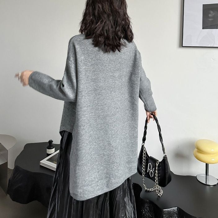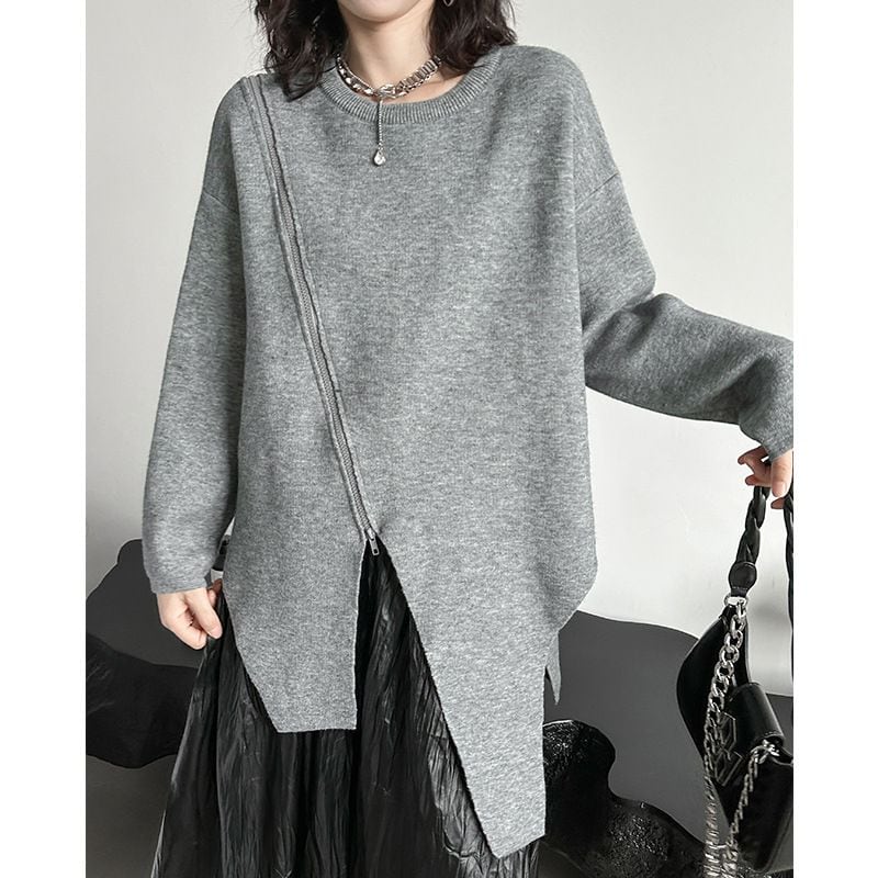 SOLID ROUND NECK ZIP TRIMMED IRREGULAR HEM PULLOVER KNIT 2colors M-15309