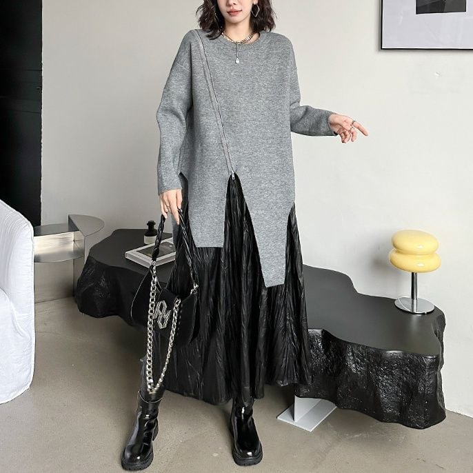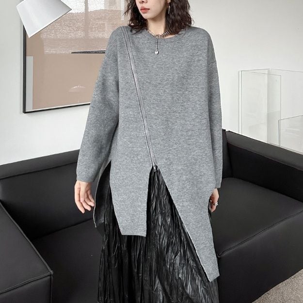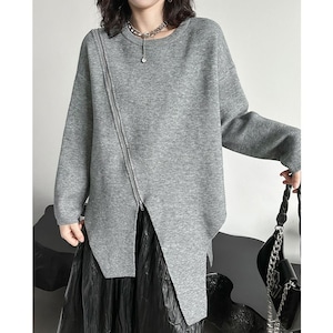 イレギュラーにカットされた裾のラインが目を惹く、ラウンドネック・長袖・チュニック丈のプルオーバーニットです。右肩から斜めに下りるZIPラインがアクセントになった、単色でコーディネートしやすいアイテムです。ブラックとグレーの2色から選べます。