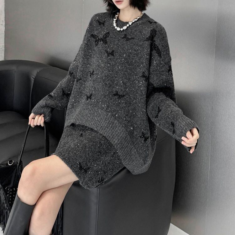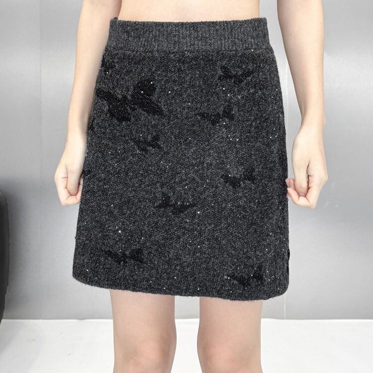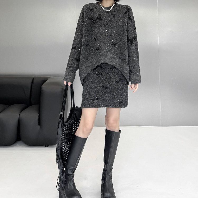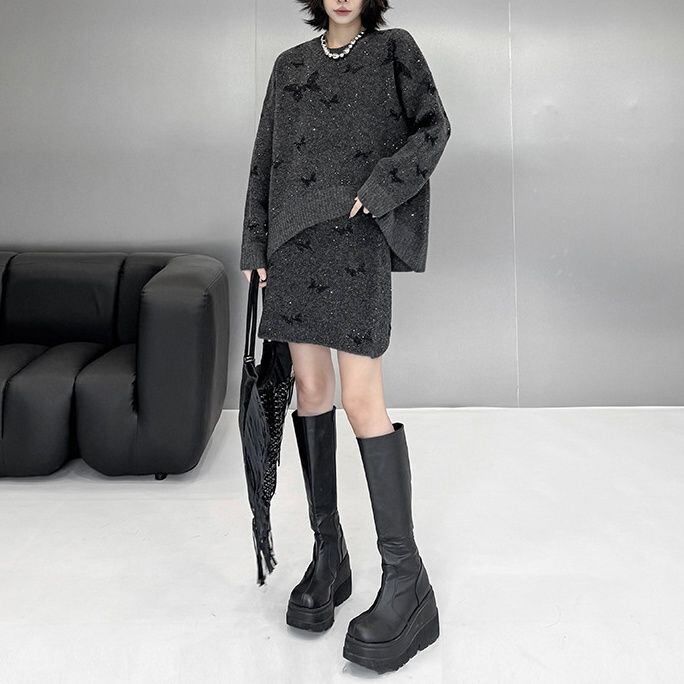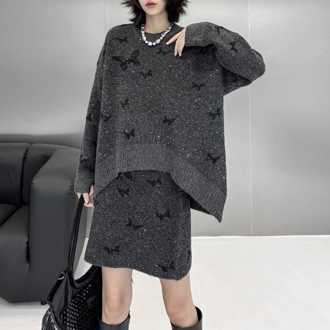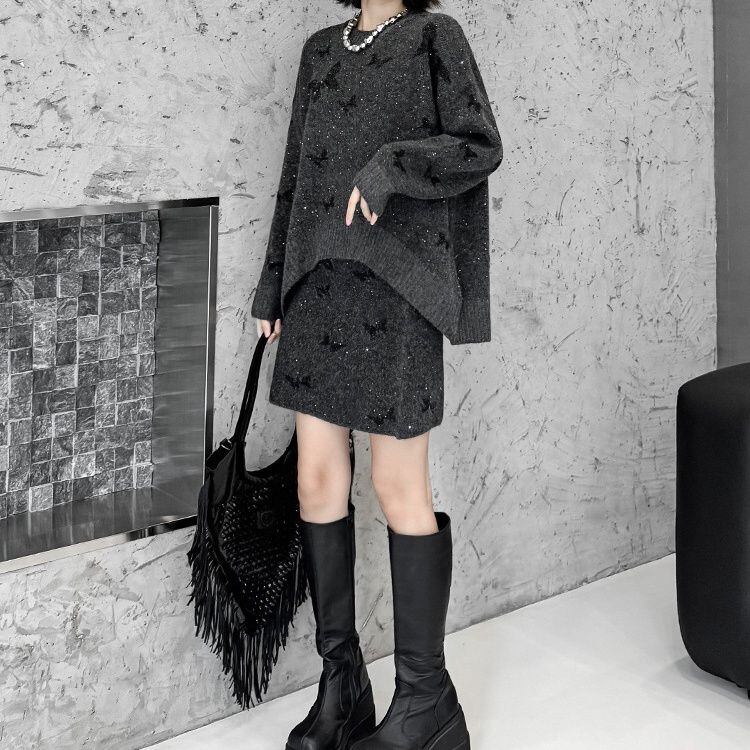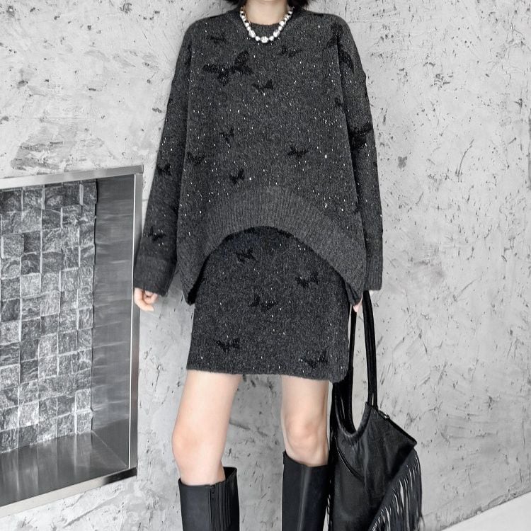 ダークグレーにブラックの蝶やラメが散りばめられた、ラウンドネックのプルオーバーニットとミニスカートのセットアップです。トップは弧を描くハイローヘムが特徴的なゆったりとしたシルエットで、スカートはウエストがゴムのタイト目なシルエットです。上下共に他アイテムとも合わせやすいです。
