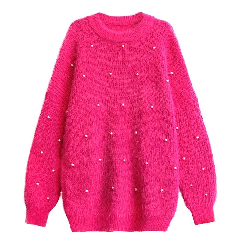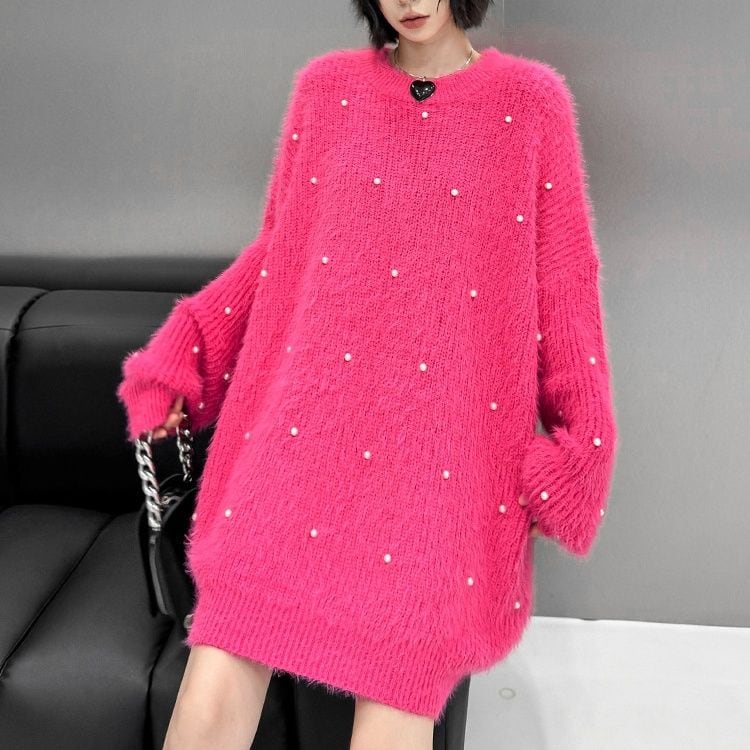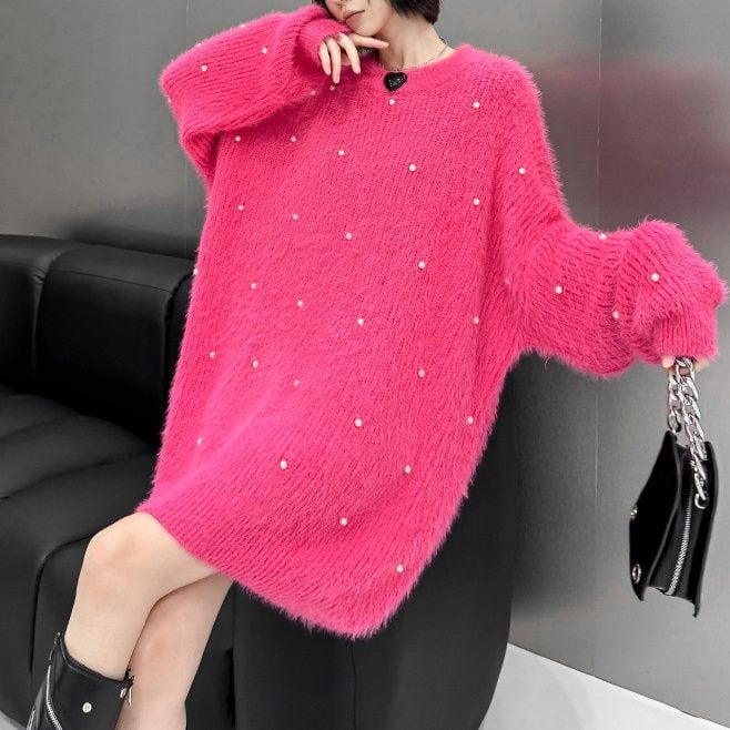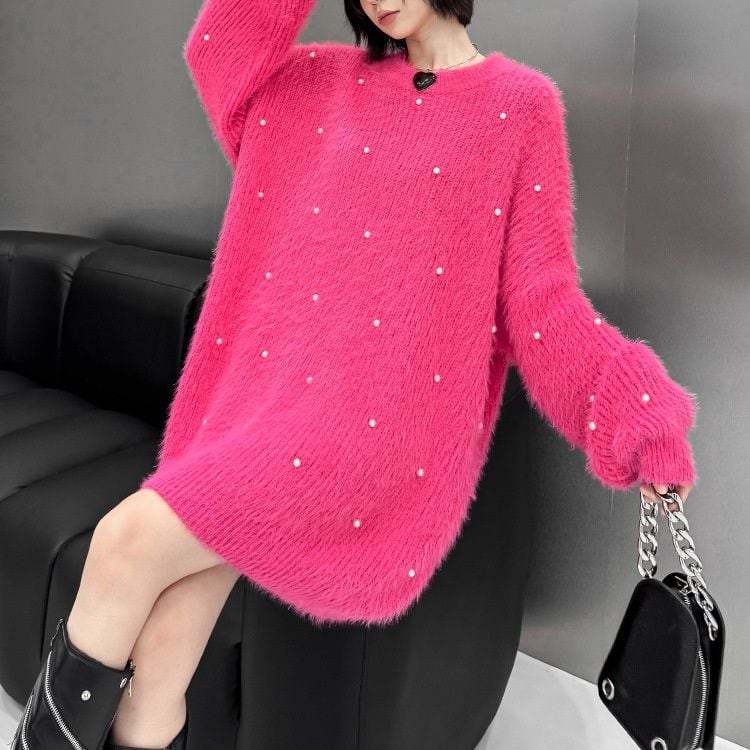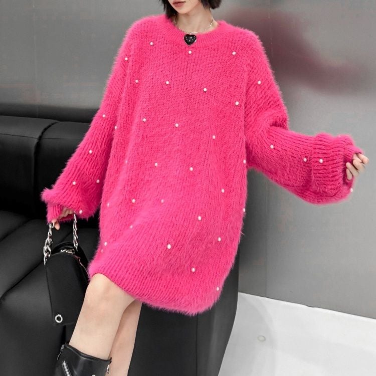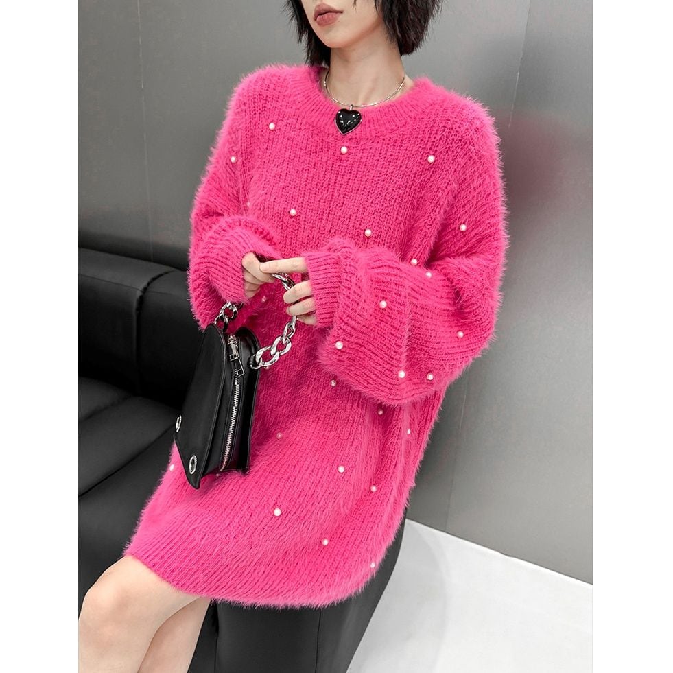 鮮やかなローズピンクにパールが散りばめられた、ラウンドネック・長袖・ミニ丈のプルオーバー・ニットワンピースです。モヘアのような毛足の長い素材のゆったりとしたシルエットが、スウィートでガーリーな印象のアイテムです。