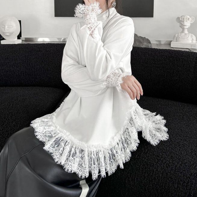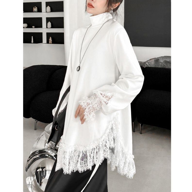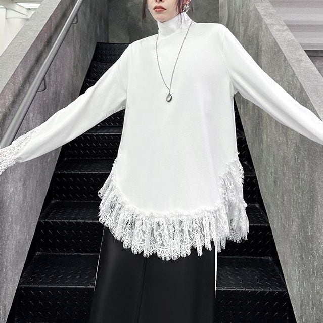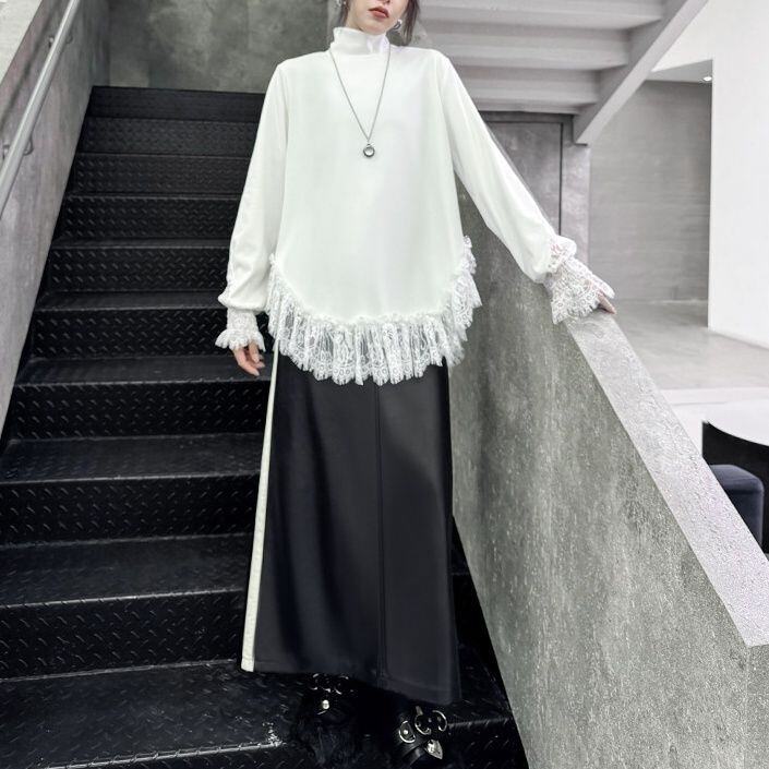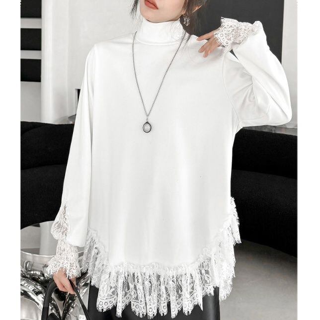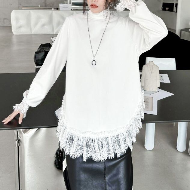 袖口や裾にあしらわれたレースのフリルが美しい、ハイネック・長袖・チュニック丈のプルオーバートップです。深めのラウンドカットでサイドがスリットのようになった裾のシルエットが魅力的な、単色で合わせやすいアイテムです。ブラックとホワイトの2色から選べます。