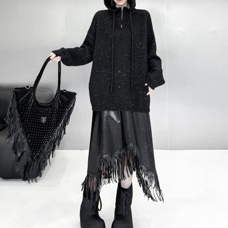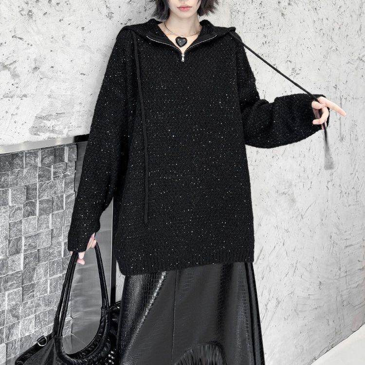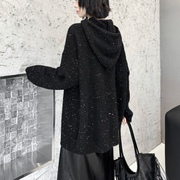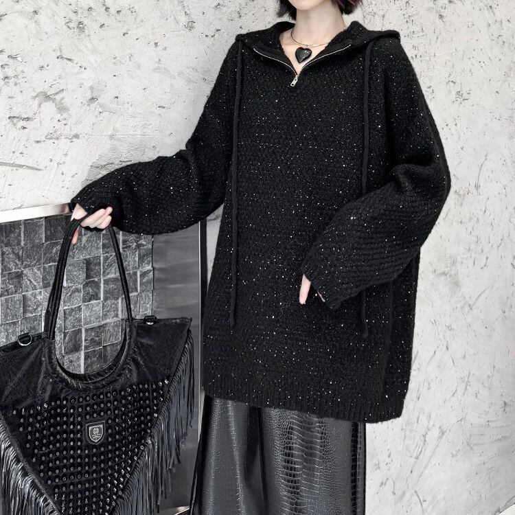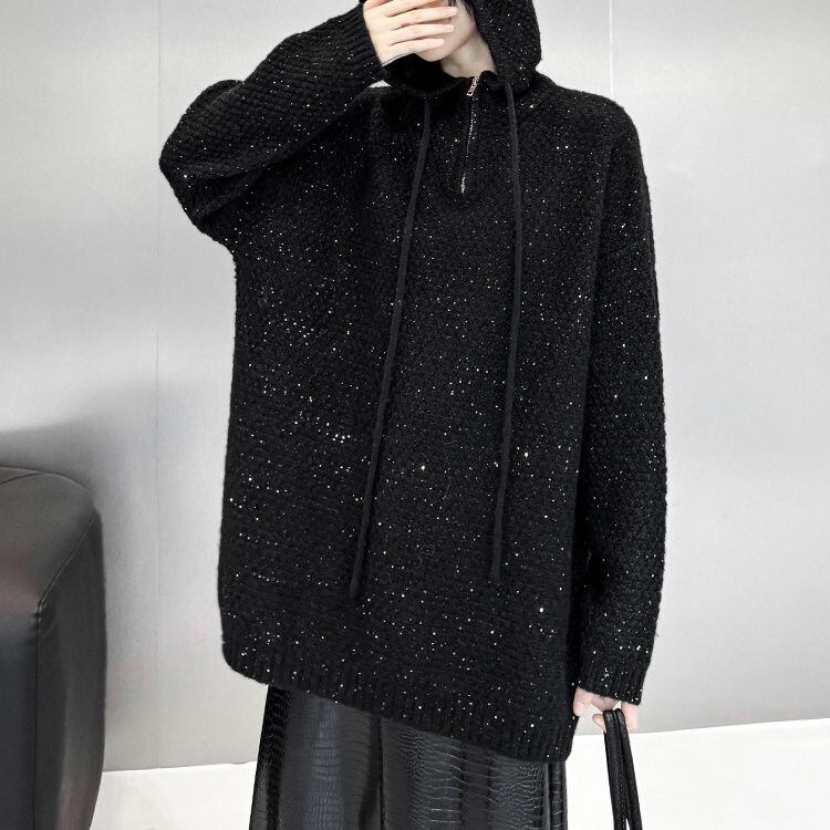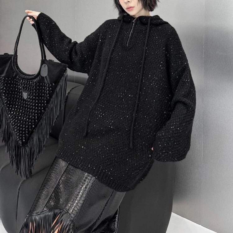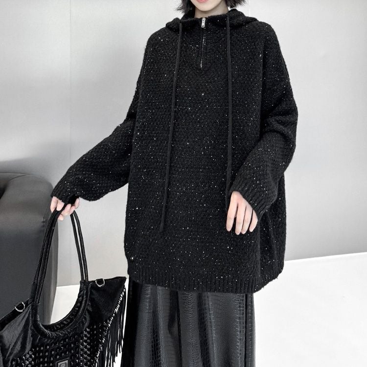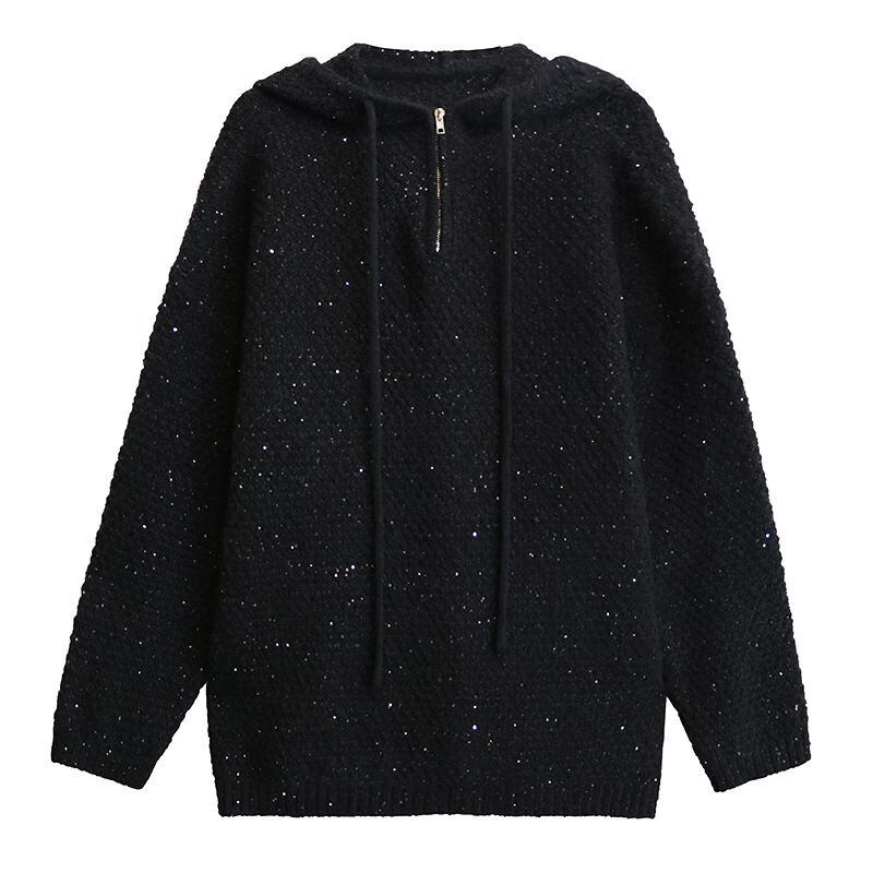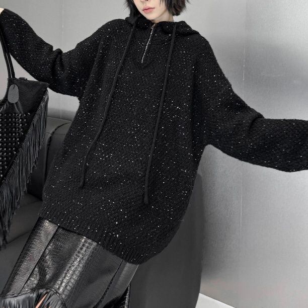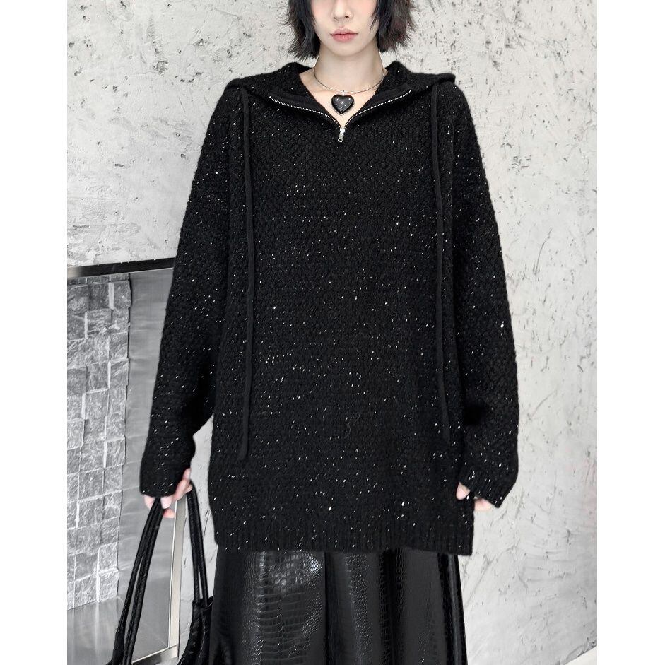 ラメが散りばめられたブラックの、フード付き・ハーフジップ・長袖・プルオーバーニットです。ゆったりとしたシルエットのチュニック丈で、フードの長いドローストリングがアクセントになったカジュアルアイテムです。