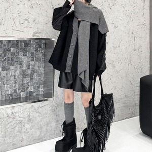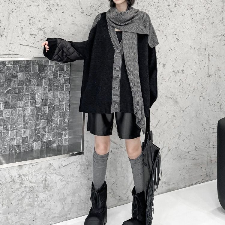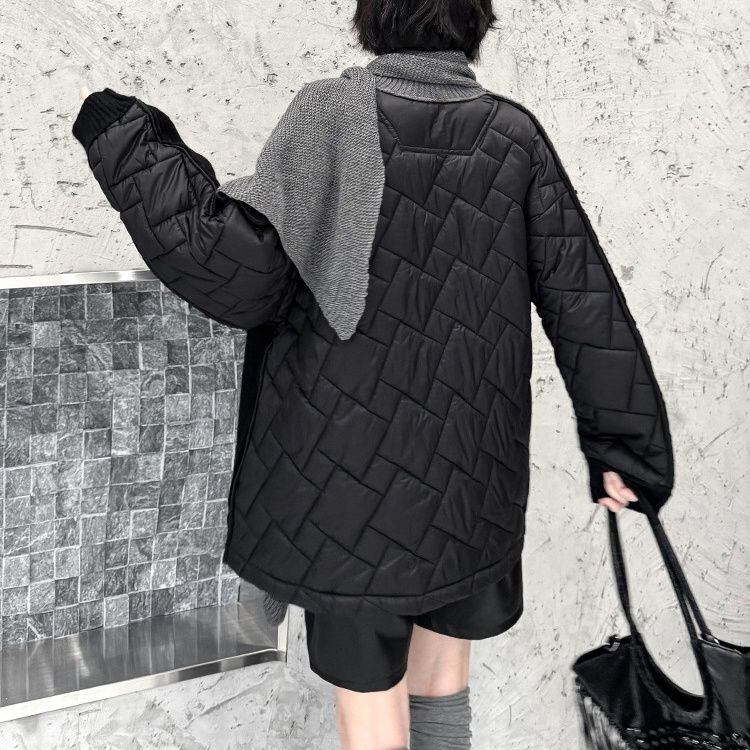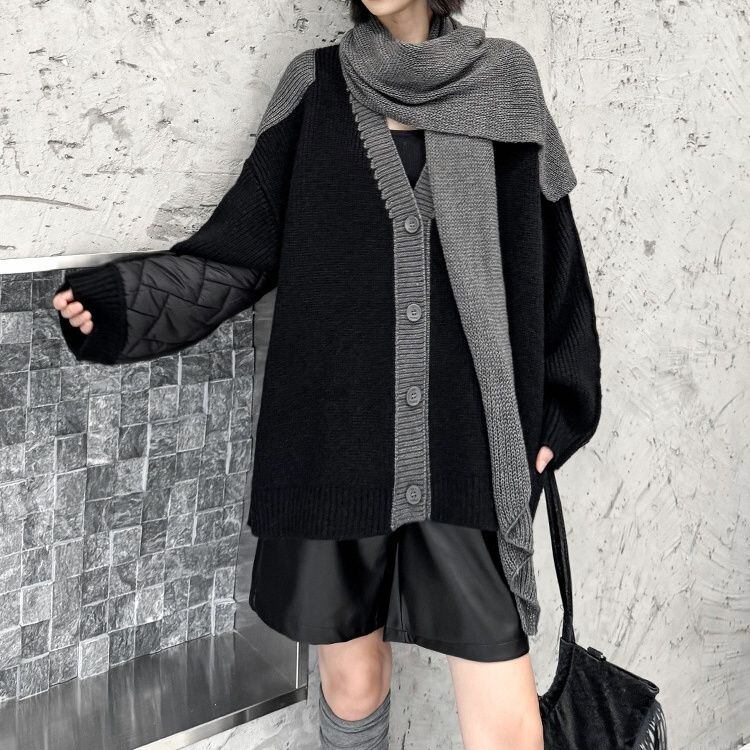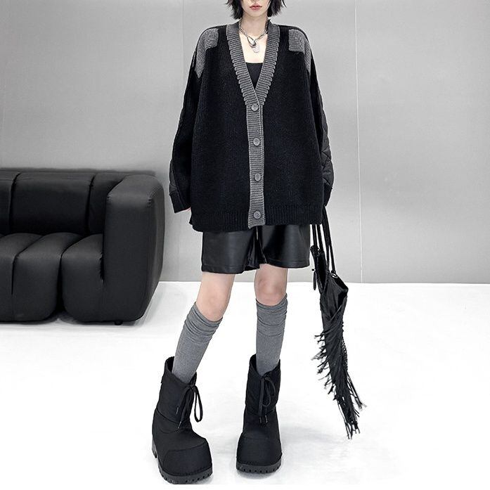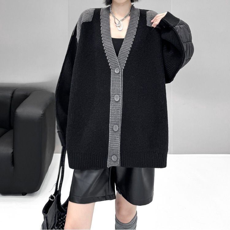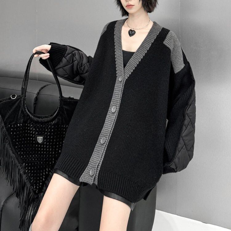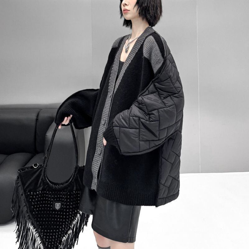 バックが艶のあるキルティング素材で温かい、Vネック・長袖・チュニック丈のニットカーディガン・ジャケットです。ブラックとグレーのコントラストデザインがお洒落な、ゆったりとしたシルエットの合わせやすいアイテムです。