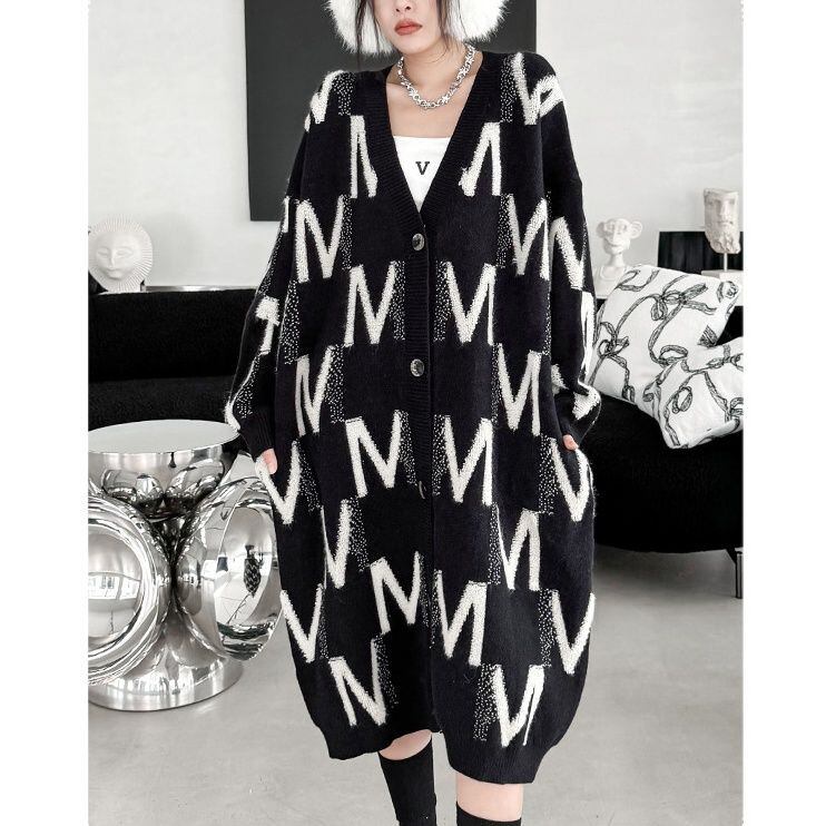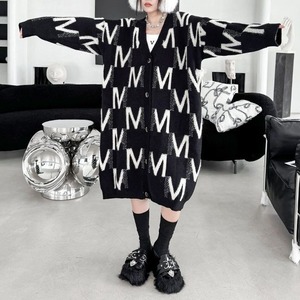 モノトーンカラーの英字レタープリントがキュートな、Vネック・長袖・膝下丈のニットカーディガンです。ゆったりとしたワイド幅のシルエットでボディラインをカバーする、コーディネートの主役になるアイテムです。