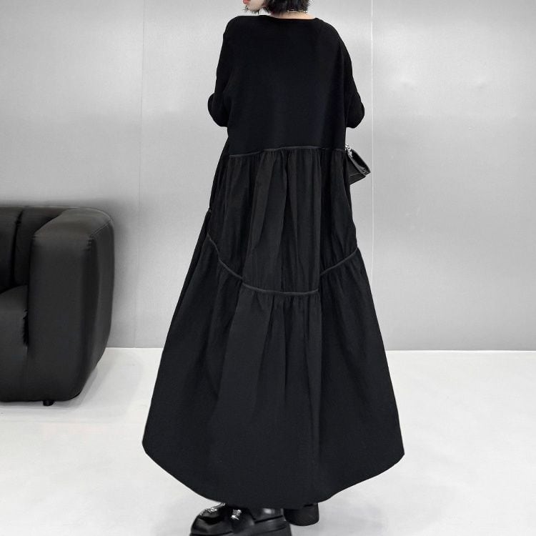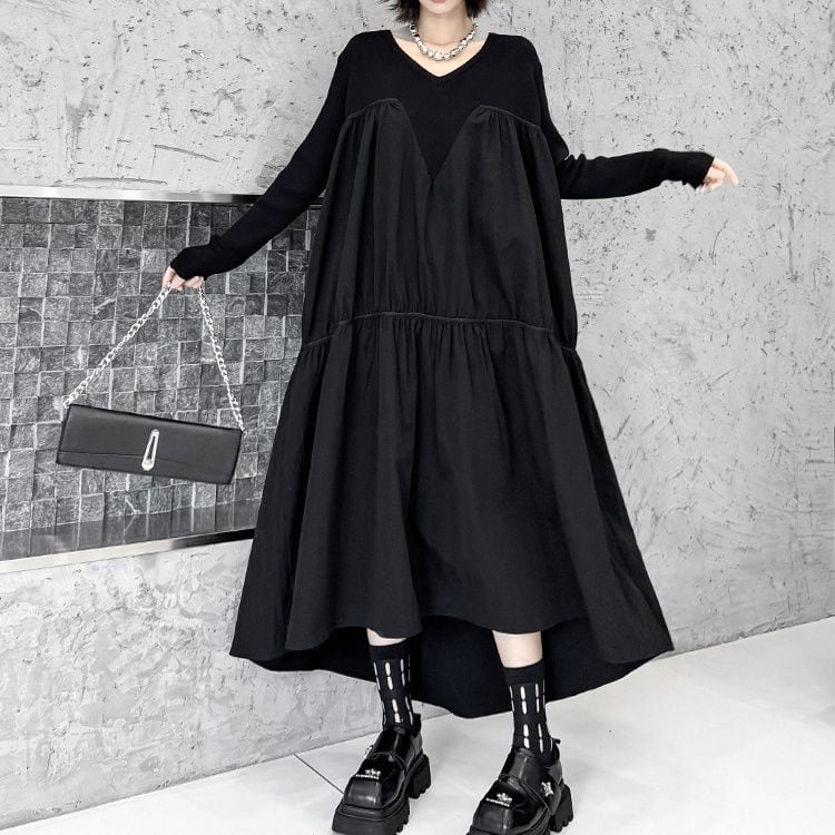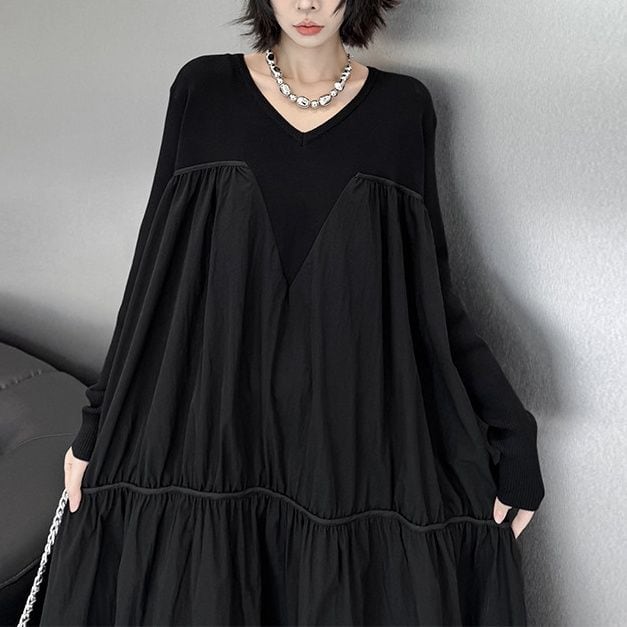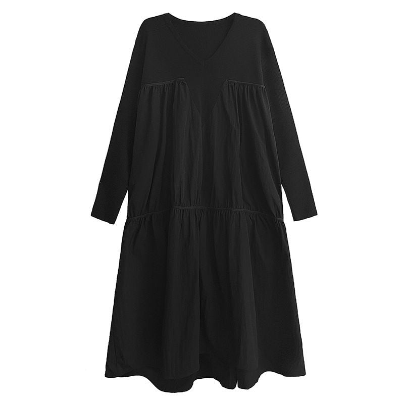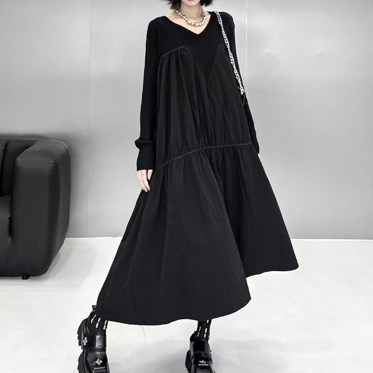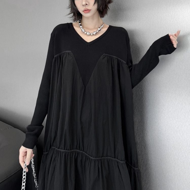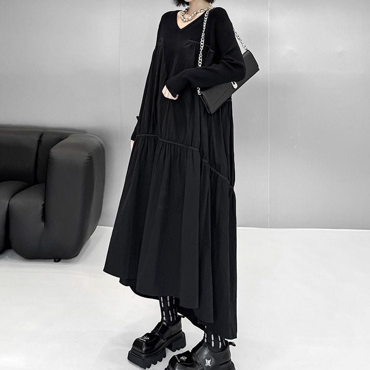 BLACK KNIT STITCHED V-NECK A-LINE LONG DESIGN DRESS 1color M-15328