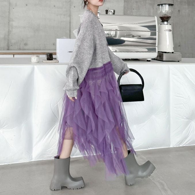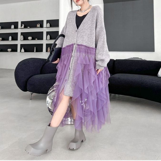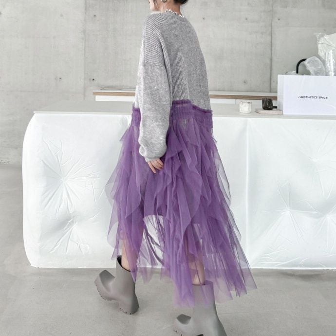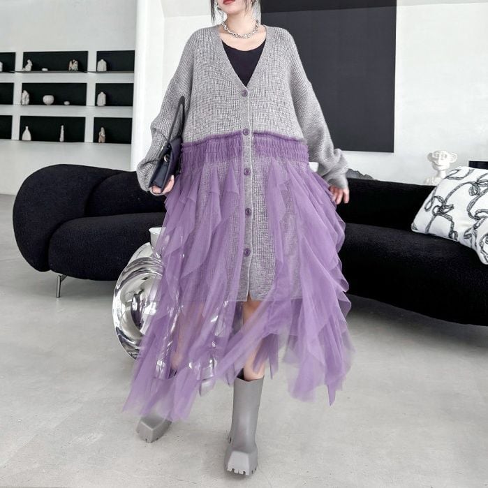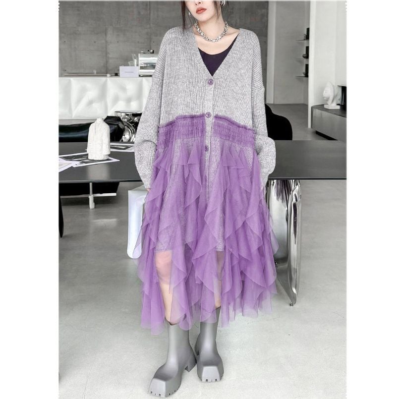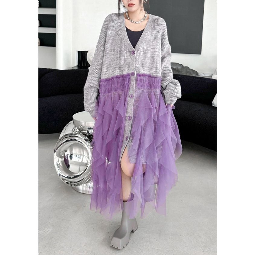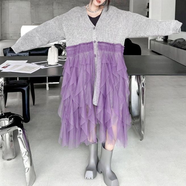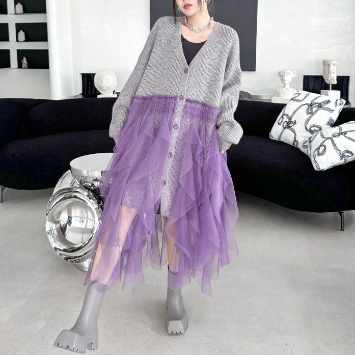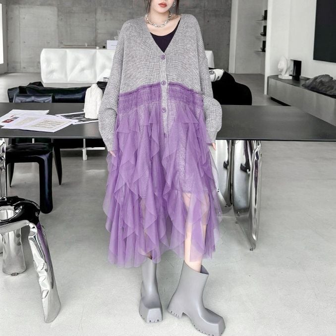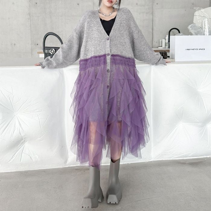 グレー地にパープルメッシュ素材のフリルスティッチが豪華な、Vネック・長袖・ミドル丈のニットカーディガンです。ドロップショルダーのゆったりとしたシルエットで、コーディネートの主役になる目を惹くアイテムです。