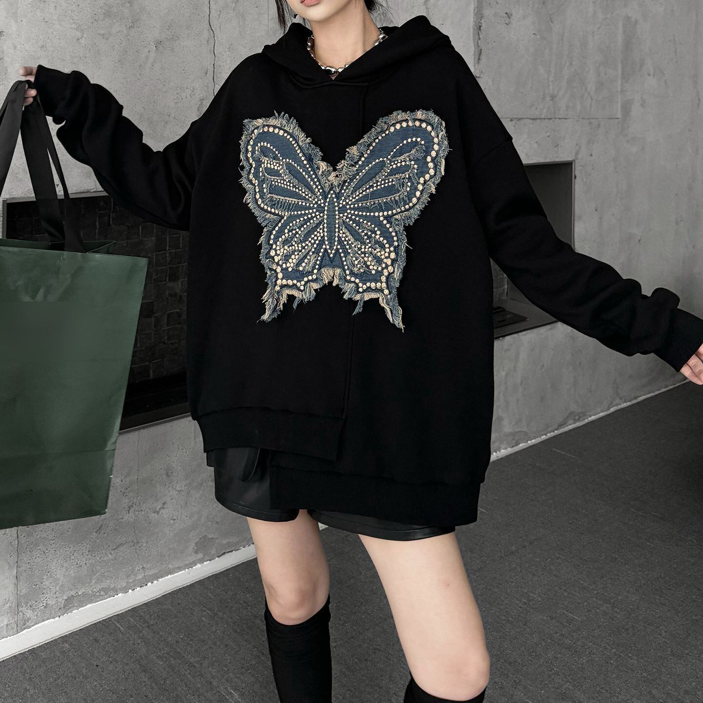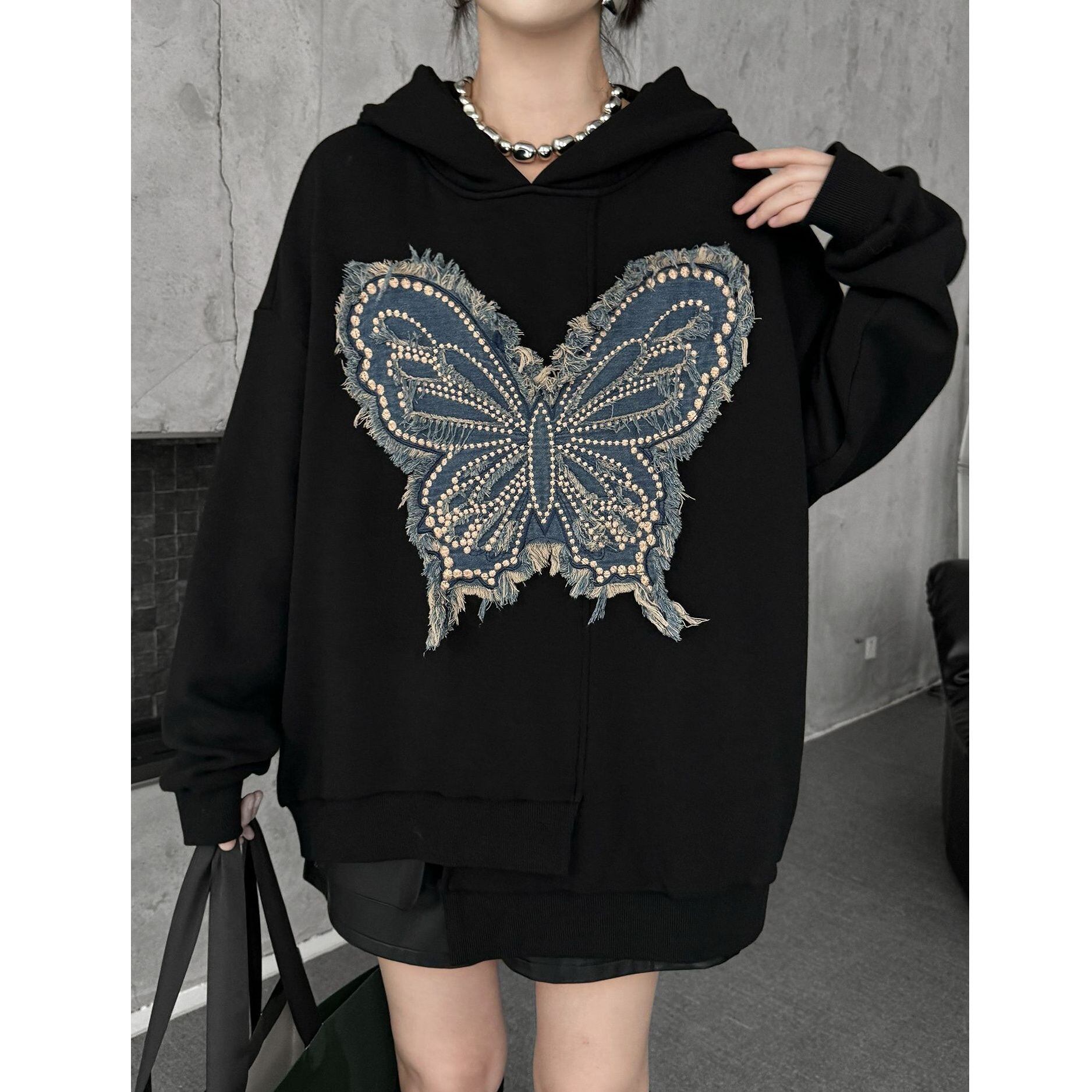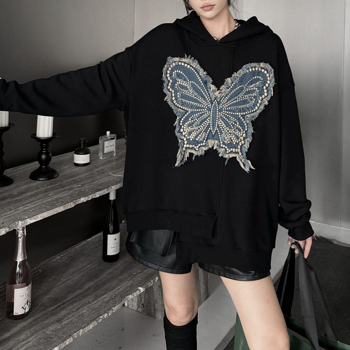 DENIM BUTTERFLY PATCHED BLACK HOODIE 1color M-15334