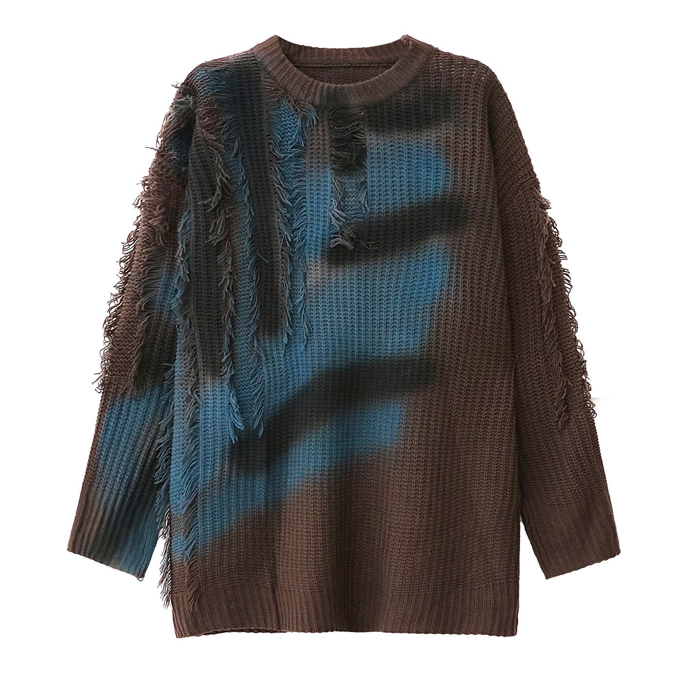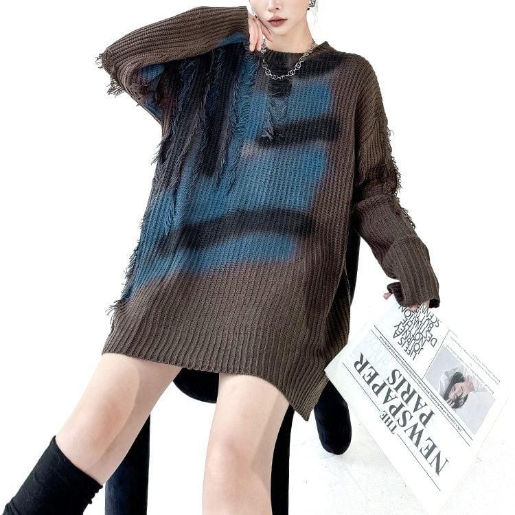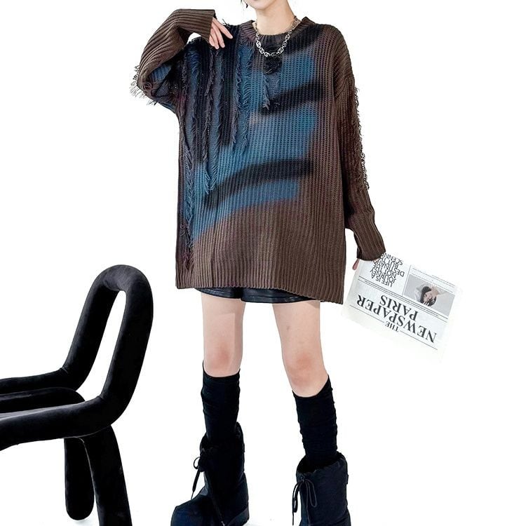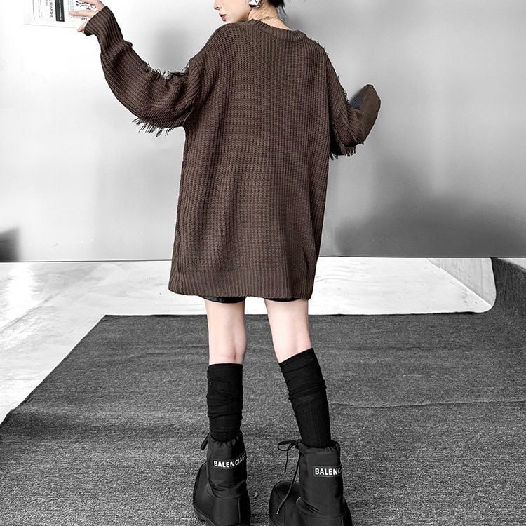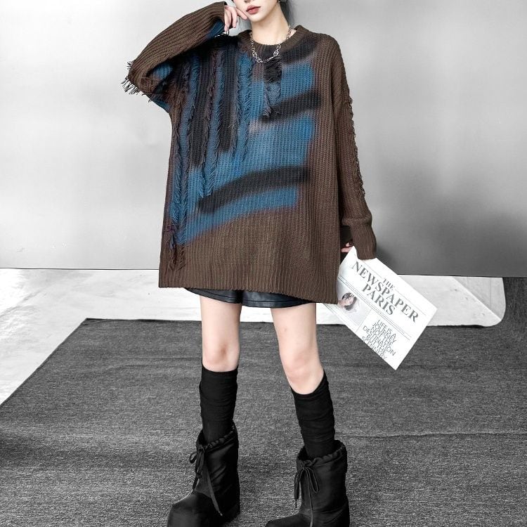 インクプリントやフリンジ加工がお洒落な、ラウンドネック・長袖・チュニック丈のプルオーバーニットです。ゆったりとしたオーバーサイズのシルエットで、コーディネートの主役になるクールな印象のアイテムです。ブラックとブラウンの2色から選べます。