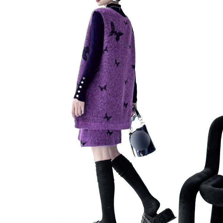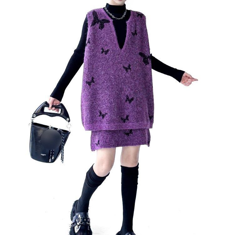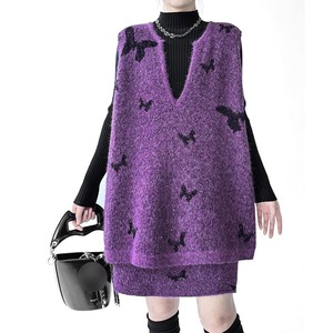 ビビットなベースに黒い蝶の柄がキュートな、ニット素材でできたデザインベストとミニスカートのセットアップです。ベストは深いスリットネックのプルオーバータイプで、ゆったりとしたシルエットです。スカートはタイト目ですが、ウエストがゴムで履き心地が良いです。レッドとパープルの2色から選べます