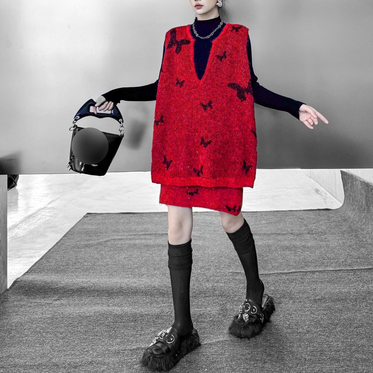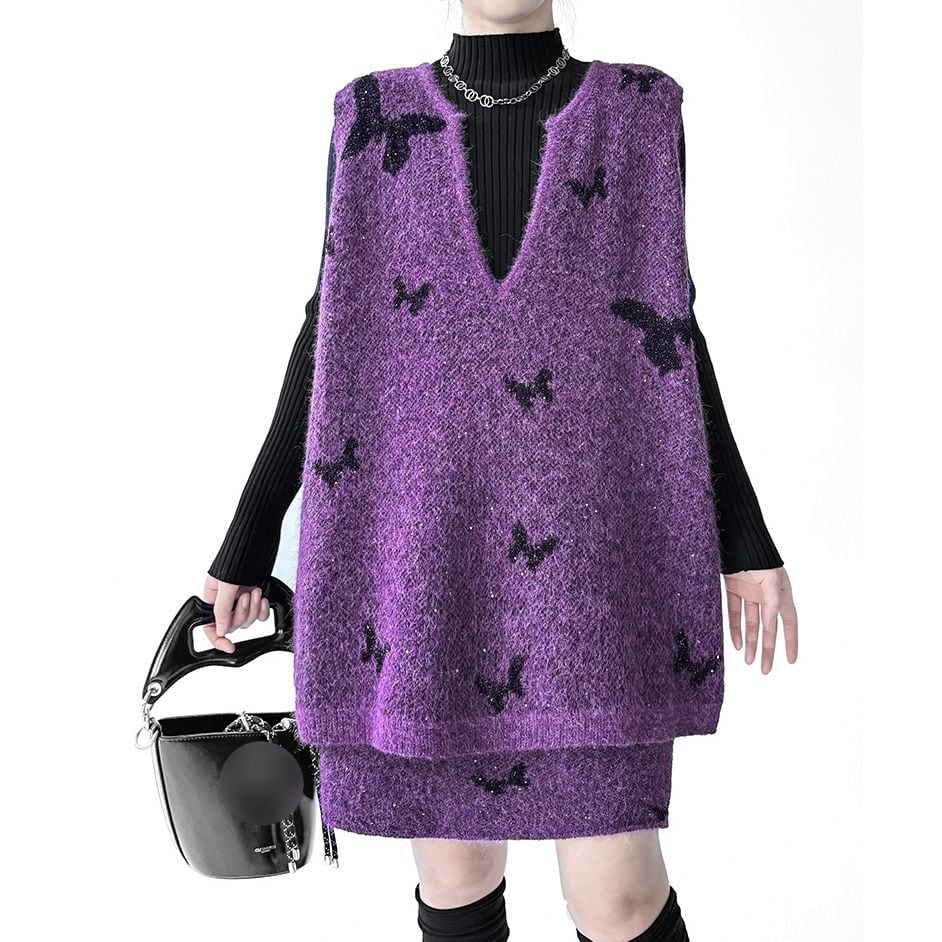 BUTTERFLY PATTERN DESIGN KNIT VEST & MINI SKIRT SET 2pieces 2colors M-15342