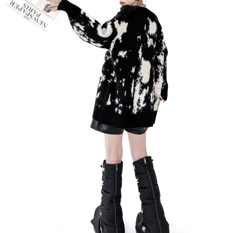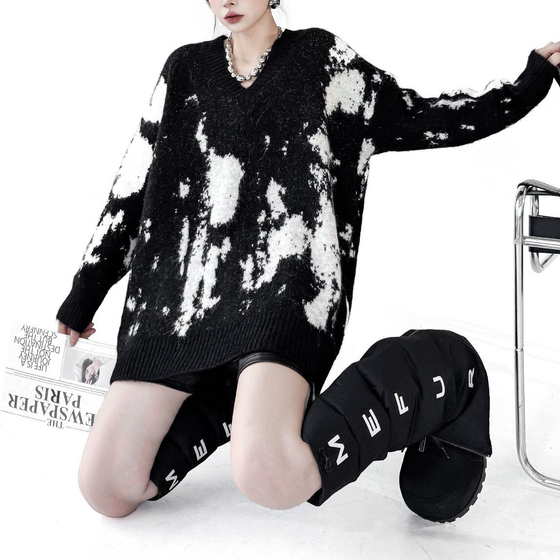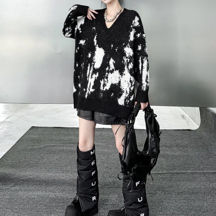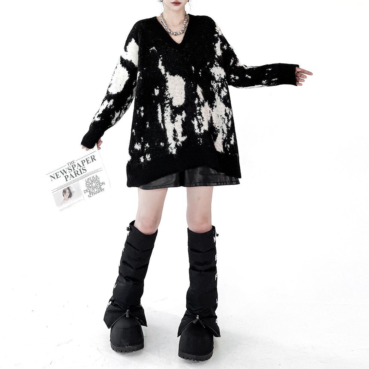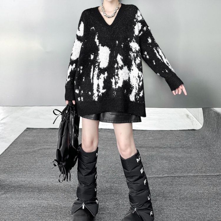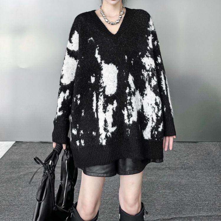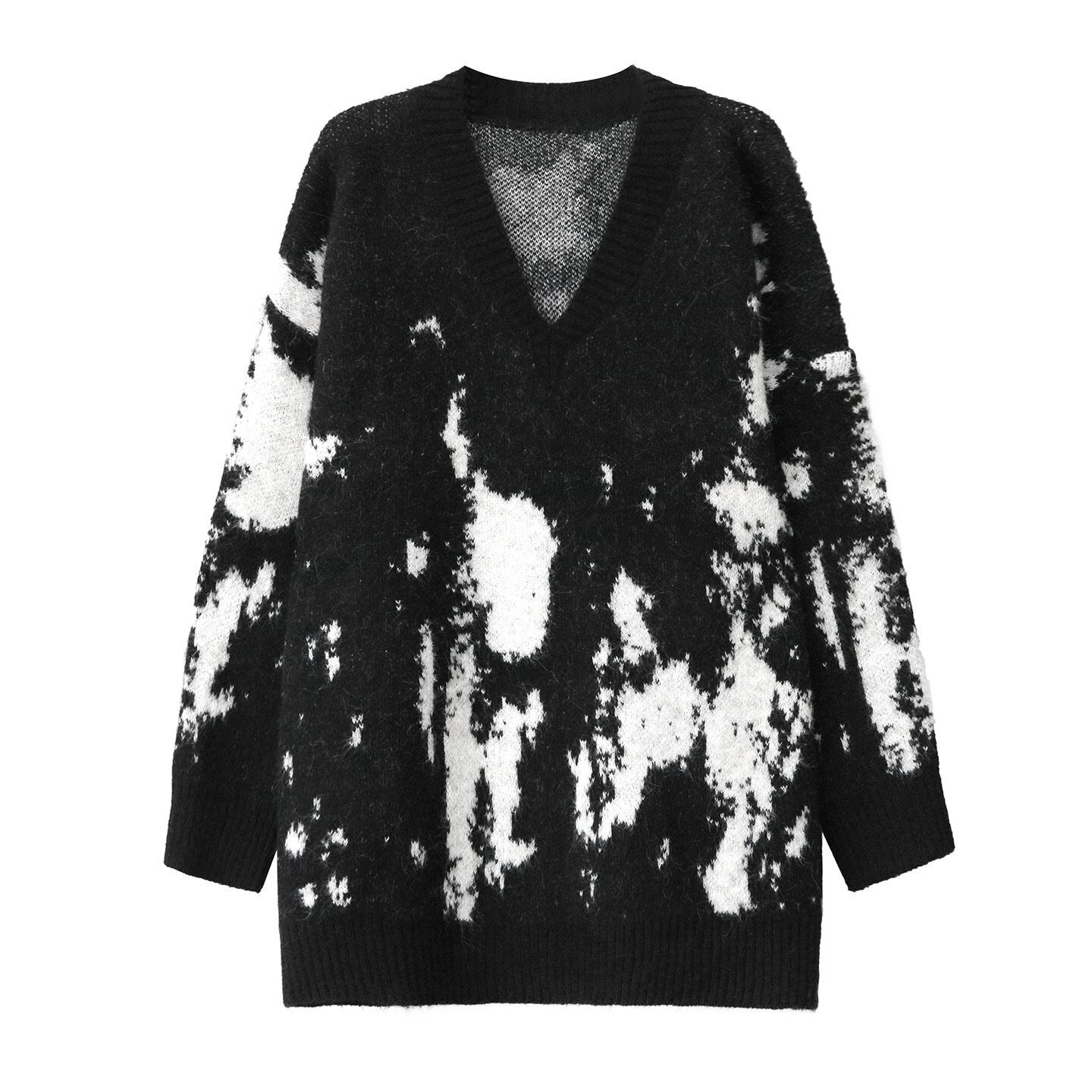 モノトーンのマーブル柄がクールな、Vネック・長袖・チュニック丈のプルオーバーニットです。首周り・袖口・裾がリブ加工された、ゆったりとしたシルエットの合わせやすいアイテムです。