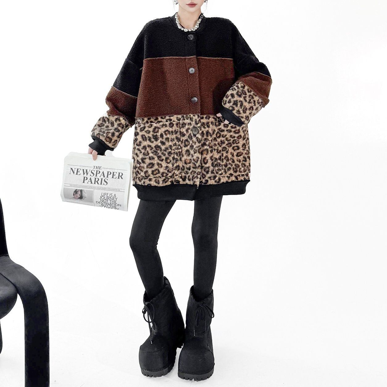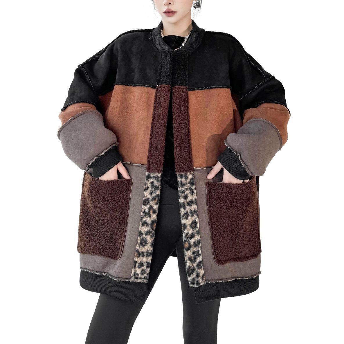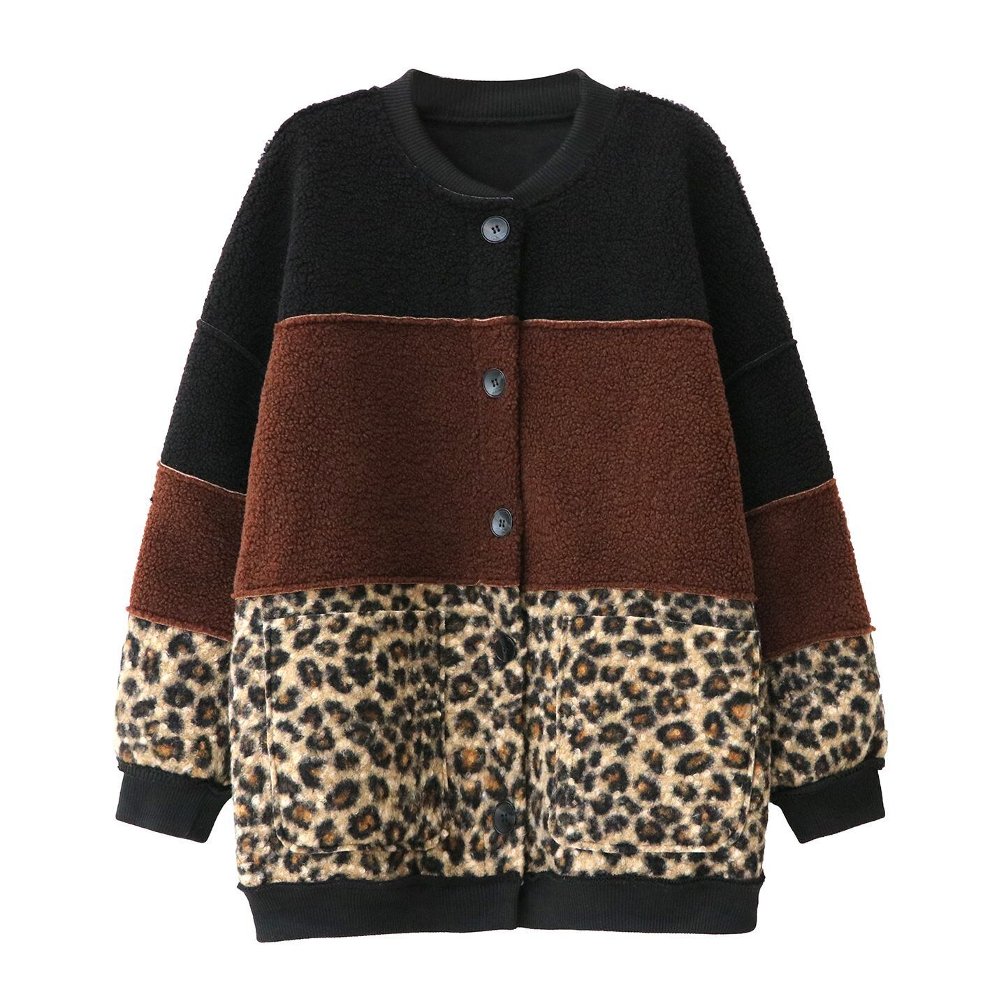 3色のスティッチデザインにヒョウ柄がアクセントになった、ベースボールカラー・長袖・ミドル丈のデザインジャケット・コートです。スエード素材とボア素材のリバーシブルで温かい、コーディネートの主役になる目を惹くアイテムです。