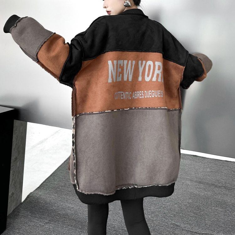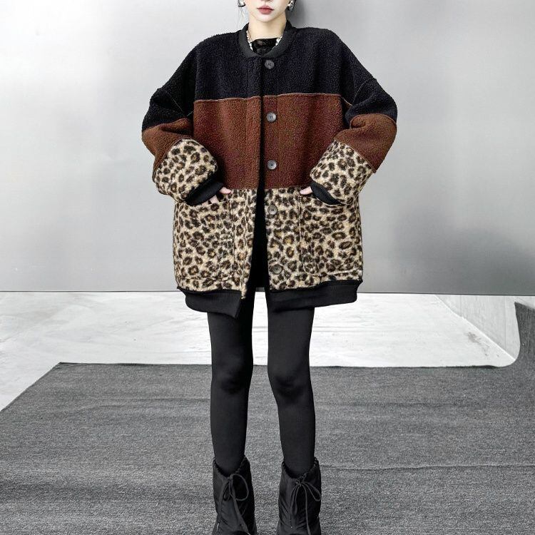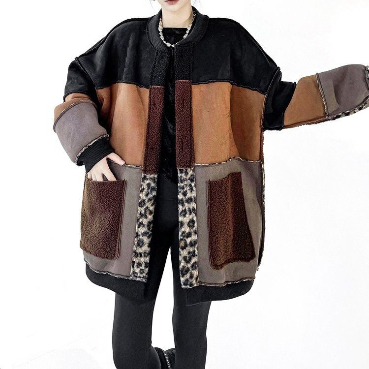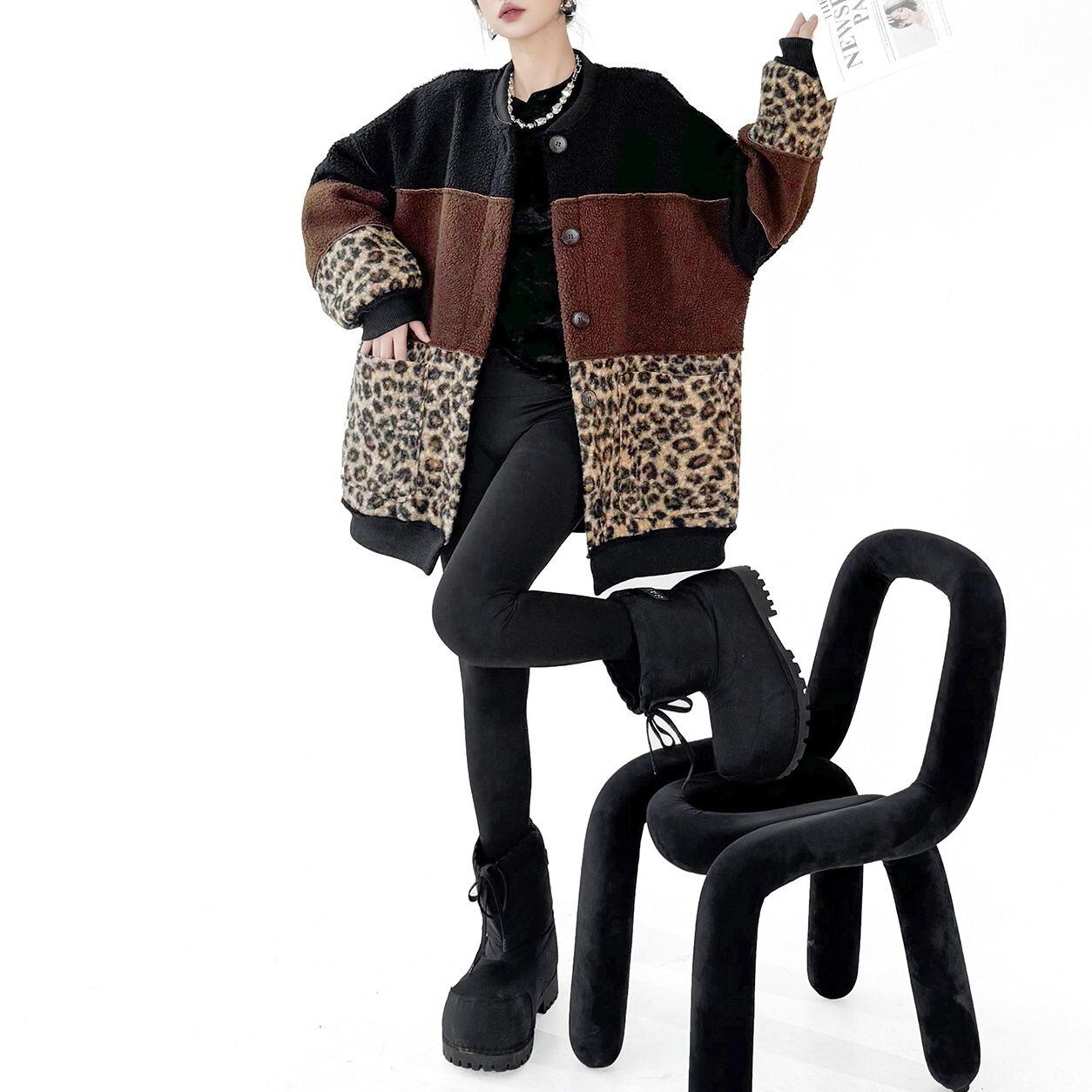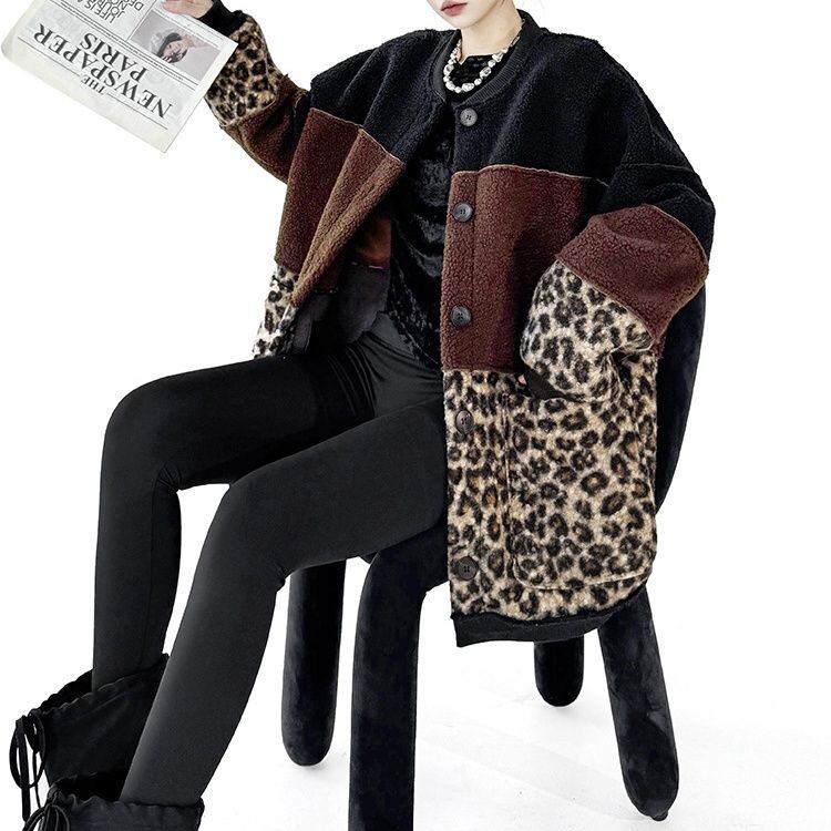 3色のスティッチデザインにヒョウ柄がアクセントになった、ベースボールカラー・長袖・ミドル丈のデザインジャケット・コートです。スエード素材とボア素材のリバーシブルで温かい、コーディネートの主役になる目を惹くアイテムです。