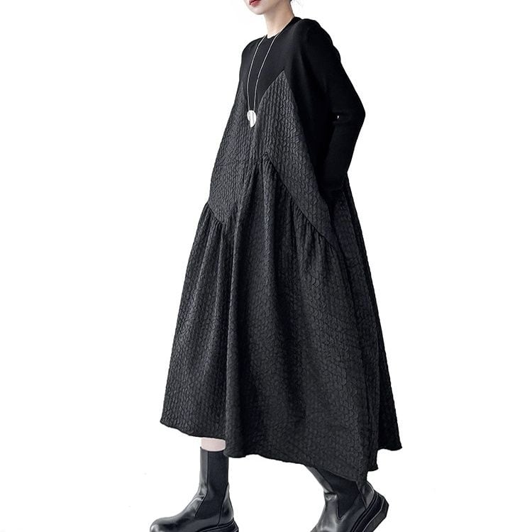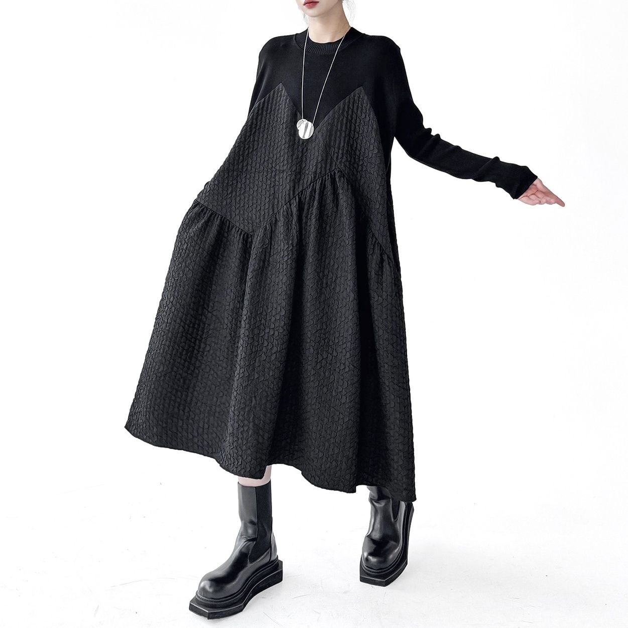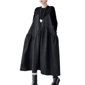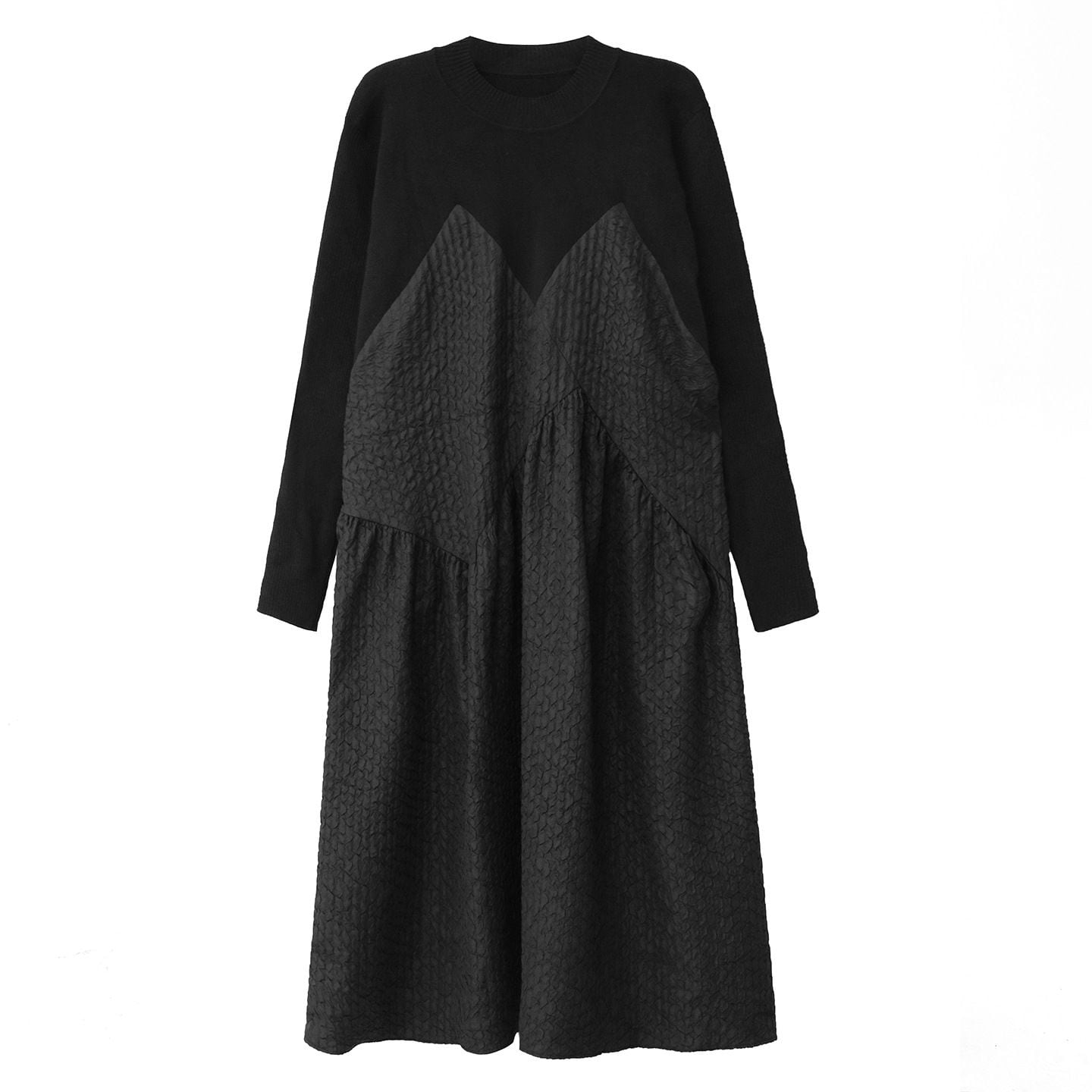 同色の異なる素材のスティッチデザインがお洒落な、モックネック・長袖・膝下丈のプルオーバーワンピースです。胸から大きく広がるAラインのスカート部分は、立体的なシワ加工の生地でできています。ふんわりとしたシルエットが魅力的な、小物や差し色アレンジが利くアイテムです。