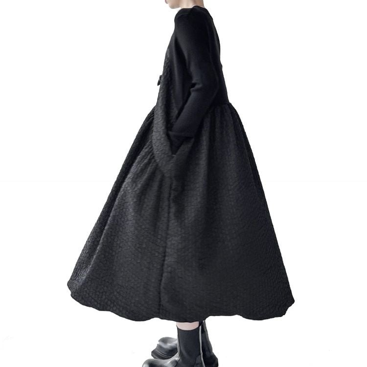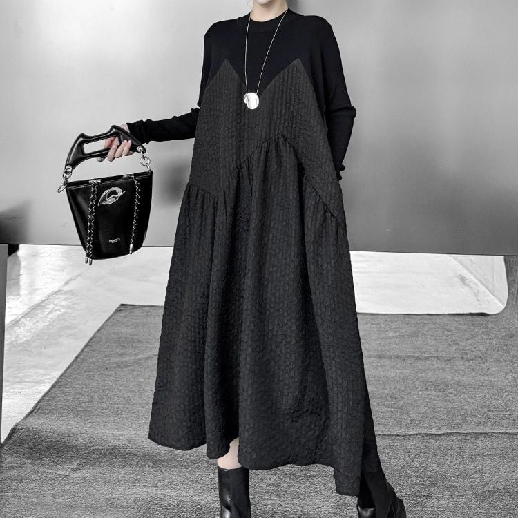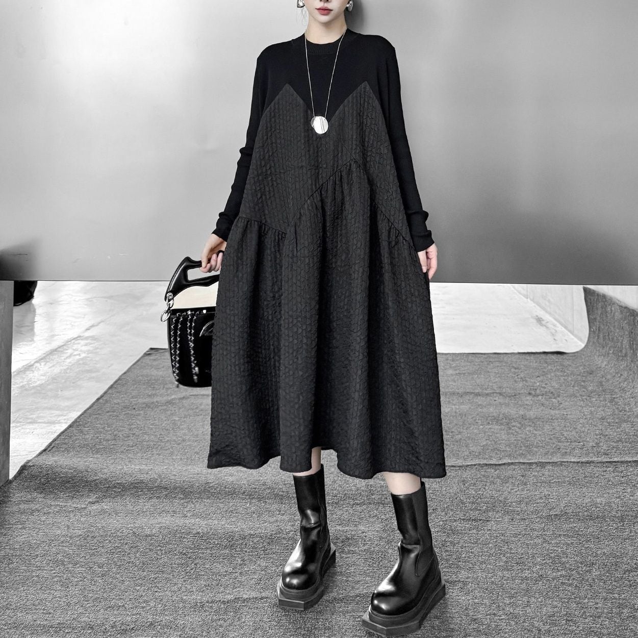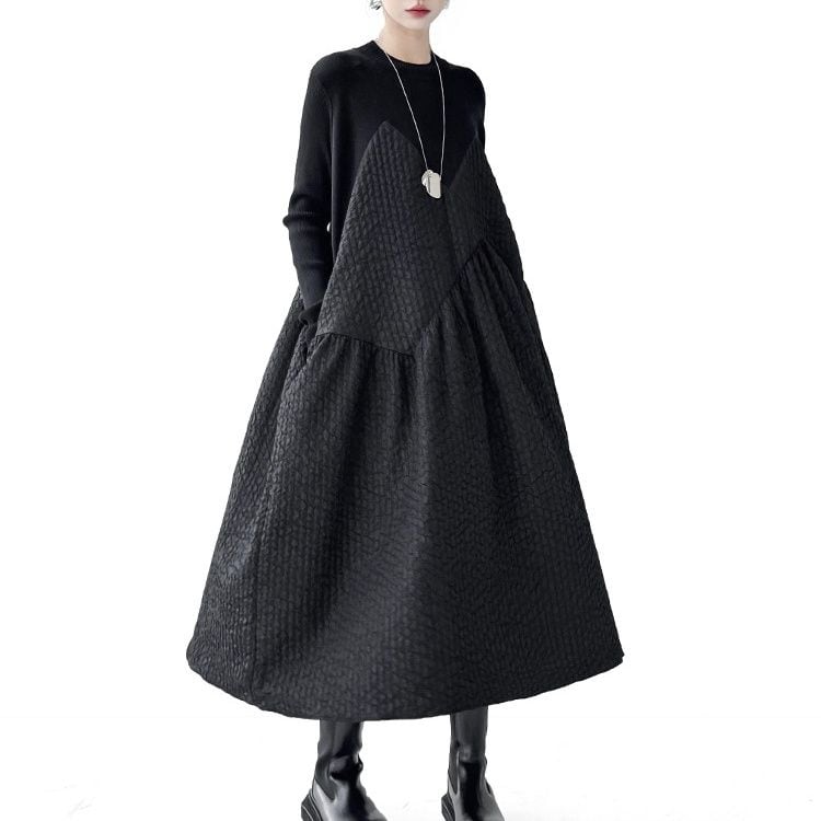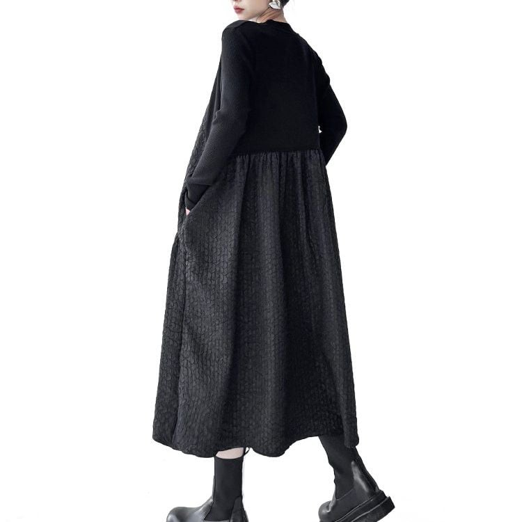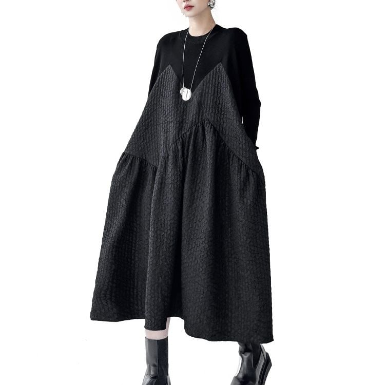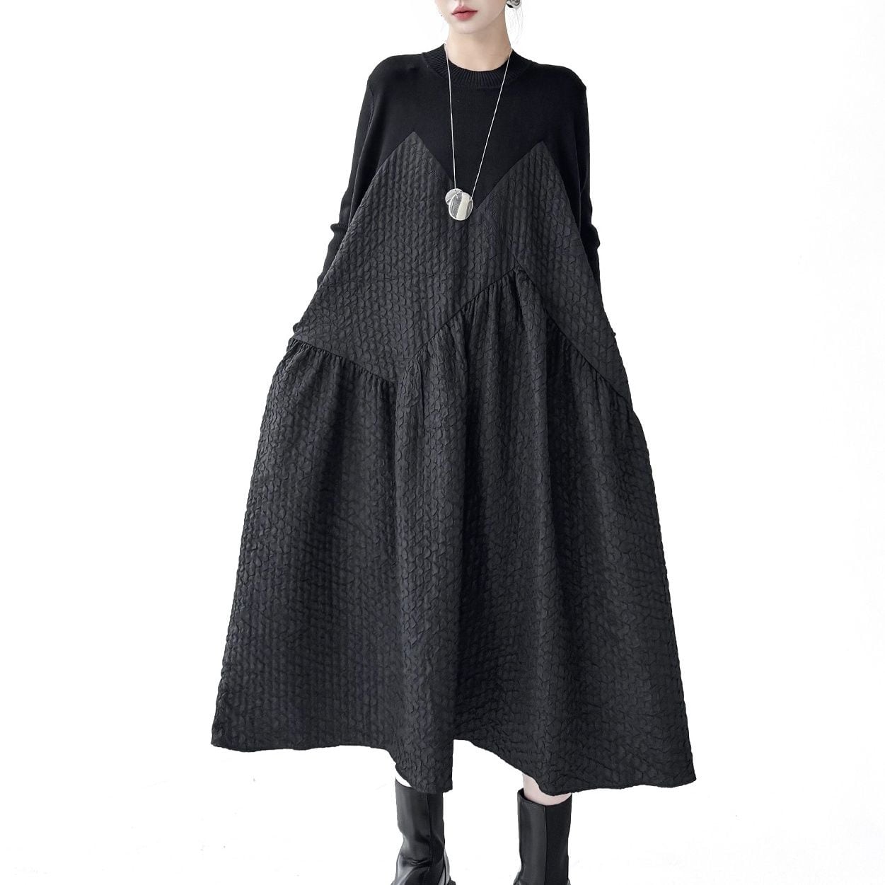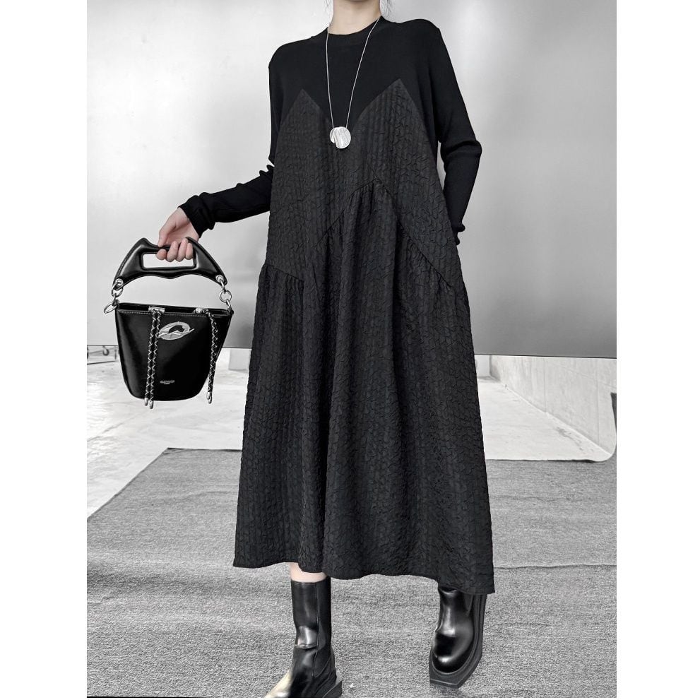 BLACK KNIT STITCHED MOCK NECK A-LINE MIDI DESIGN DRESS 1color M-15352