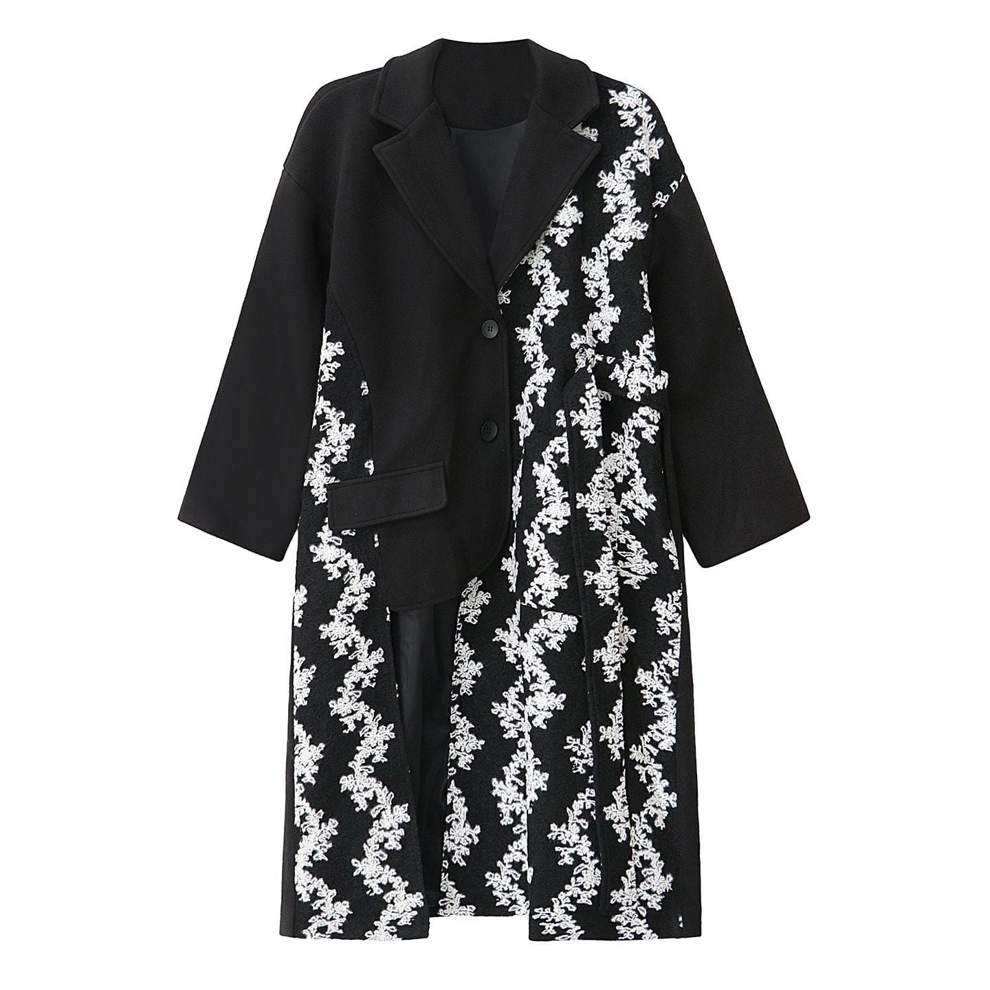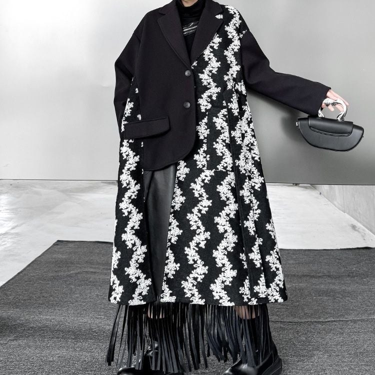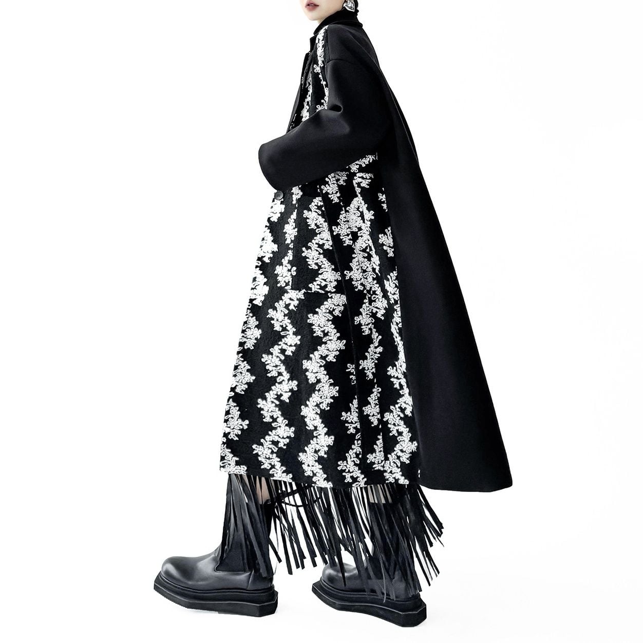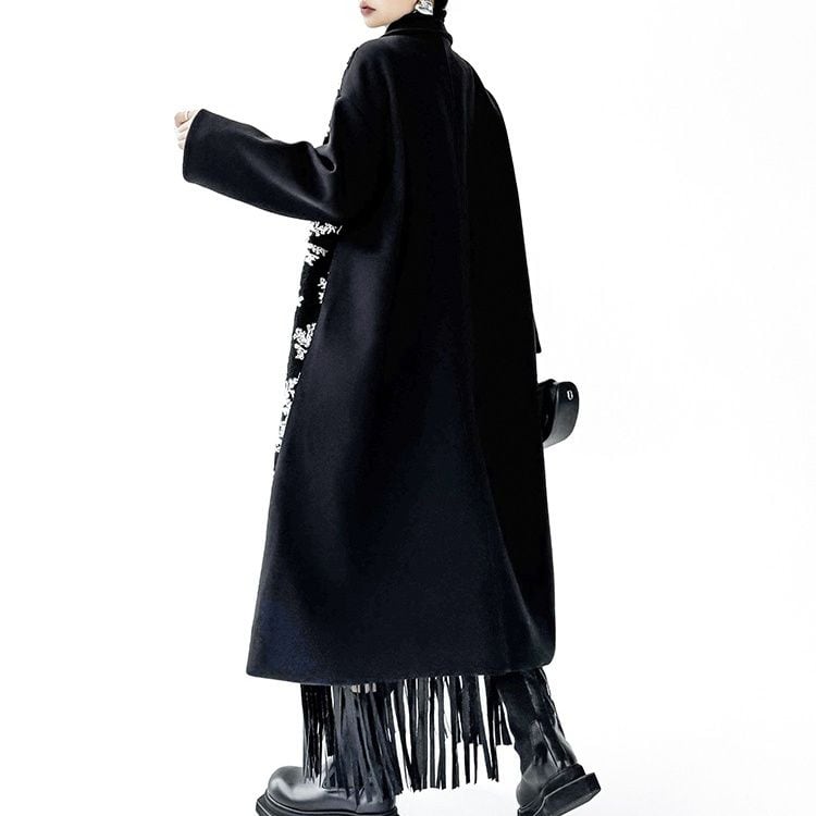 ブラックと白い刺繍が美しい素材のコントラストスティッチがお洒落な、ラペル付きVネック・長袖・ロング丈のウールコートです。フロントの右サイドのみジャケットのアシンメトリックなデザインでコーディネートの主役になる目を惹くアイテムです。